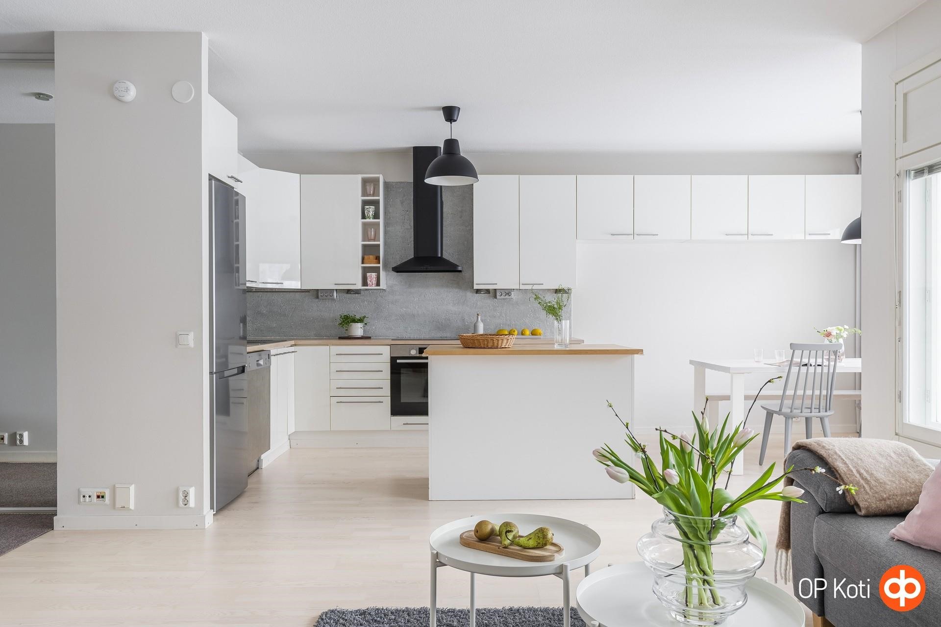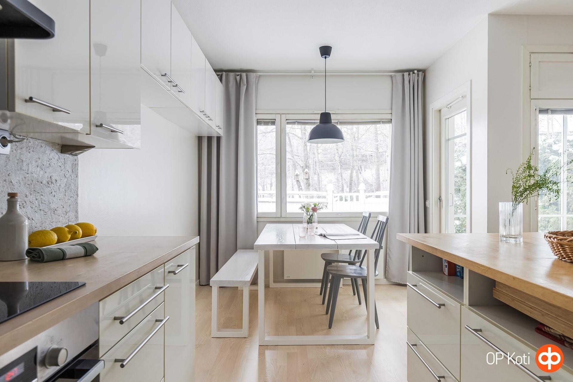 - Jääkaappipakastin Siemens, erillisuuni Bosch, induktioliesi Bosch, liesituuletin Savo, astianpesukone Bosch. Kaapistot vaalea kalustelevy, öljytyt puutasot, saareke, kiinteät valaisimet. Uuni, induktioliesi, liesituuletin ja jääkaappi-pakastin uusittu vuonna 2020 Keittiön hana uusittu 2026