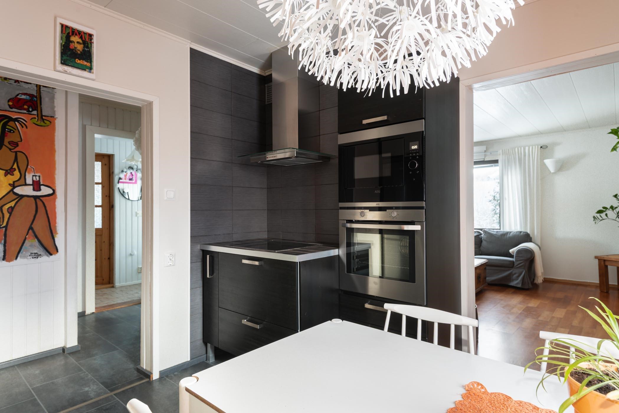 - Jääkaappipakastin, erillisuuni, liesitaso induktio, liesituuletin, mikroaaltouuni 2021, astianpesukone 2021, kaapistot, kiinteät valaisimet.