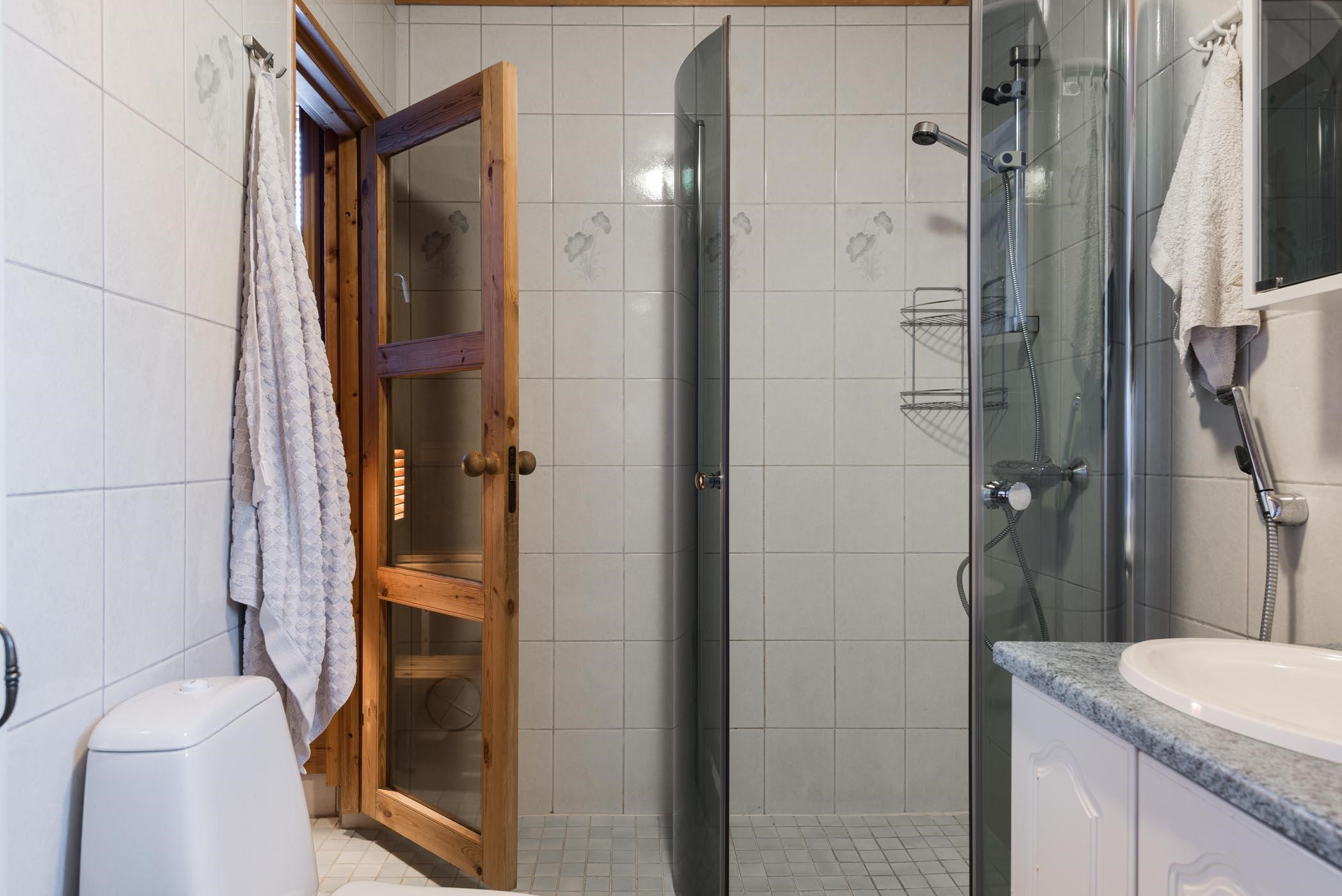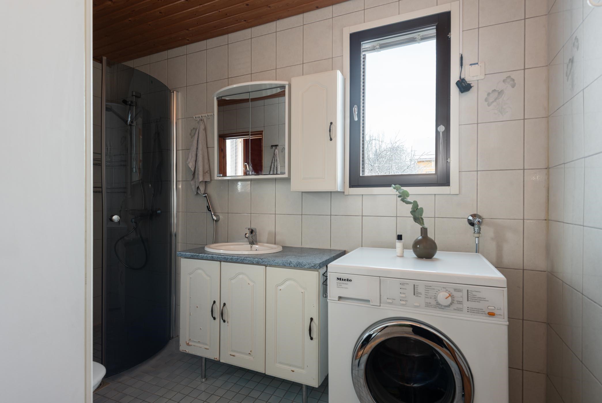 - Sauna, sähkökiuas, kylpyhuone, suihku, suihkuseinä Kääntöovet, peilikaappi, allaskaappi, pesukoneliitäntä, lattialämmitys, kiinteät valaisimet.