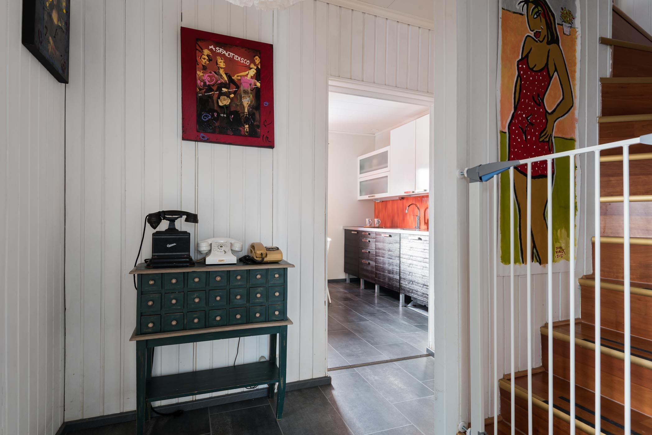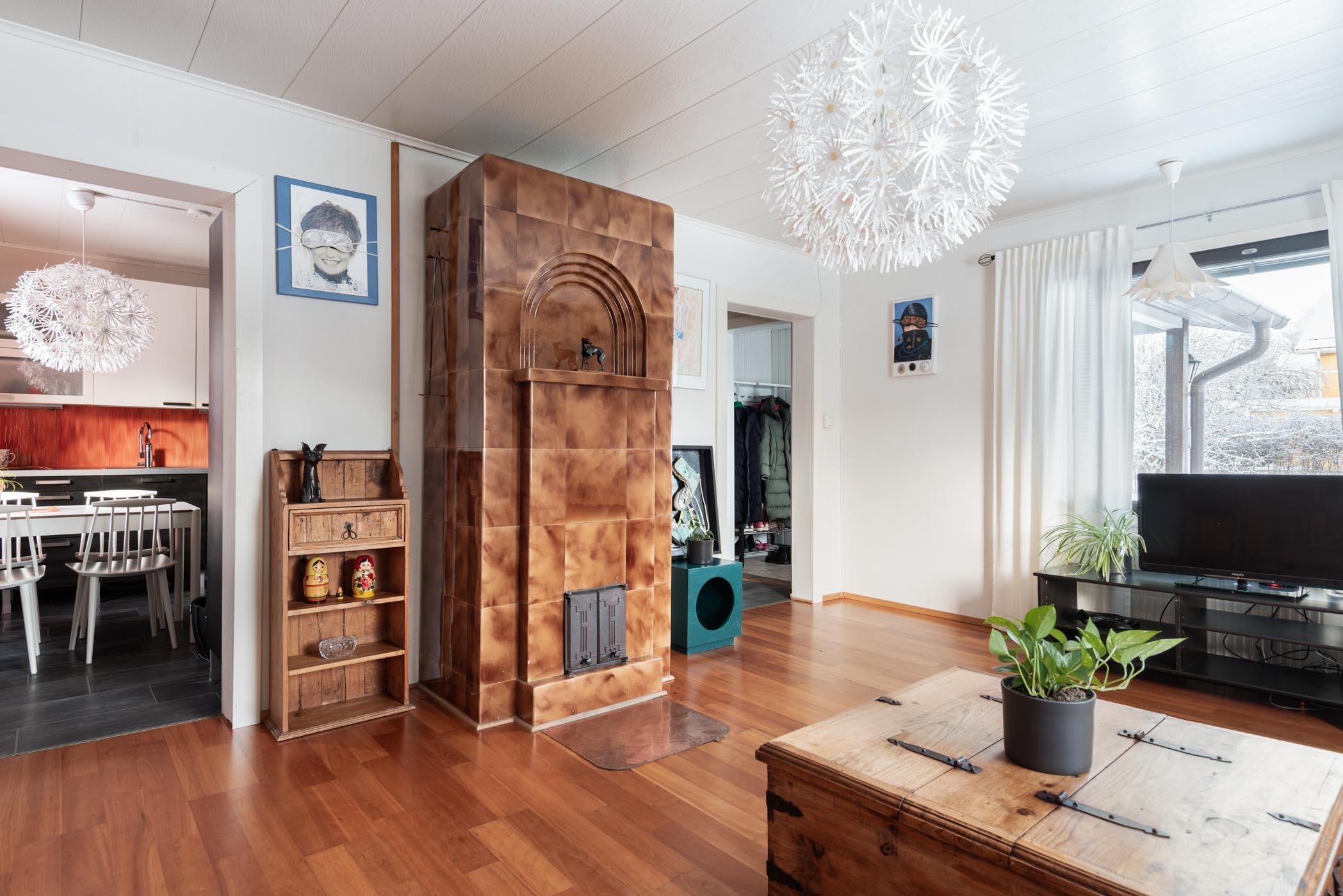 Tämä 1,5 kerroksinen koti kätkee sisälleen 82,5 m² asuintilaa. Alakerrassa on tilava keittiö, olohuone, pesuhuone ja sauna, kun taas yläkerrassa on makuuhuone, tila ja aula. Keittiö on varusteltu Puustellin kaapistoilla ja moderneilla kodinkoneilla, kuten induktioliesi ja astianpesukone. Olohuoneessa kaakeliuuni luo tunnelmaa, ja ilmalämpöpumput tuovat tehokkuutta lämmitykseen.