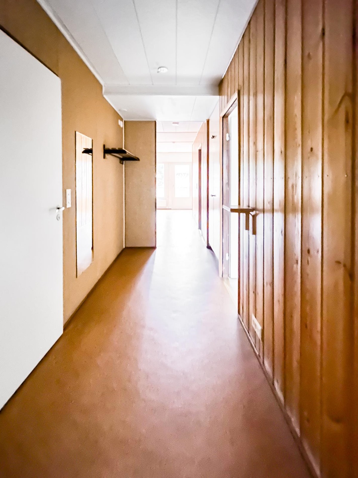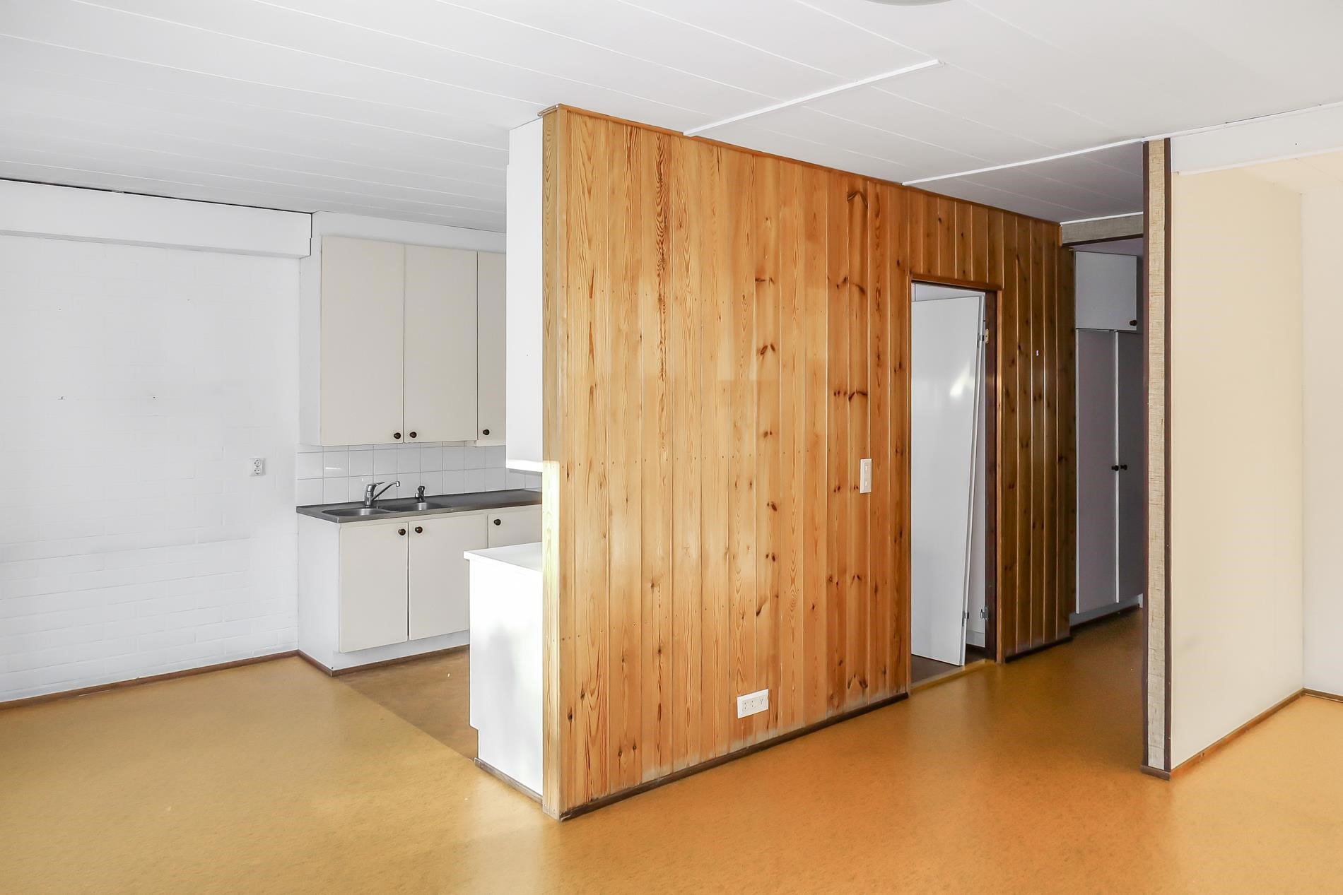 Keittiö: seinät on maalattu, muovimatto lattiassa. Olohuone: seinät on maalattu, muovimatto lattiassa. Makuuhuone 1: seinät on maalattu, muovimatto lattiassa. Sauna: seinät on paneloitu, laattalattia. Kylpyhuone: seinät ja lattia on laatoitettu. Eteinen: seinät on maalattu, muovimatto lattiassa.