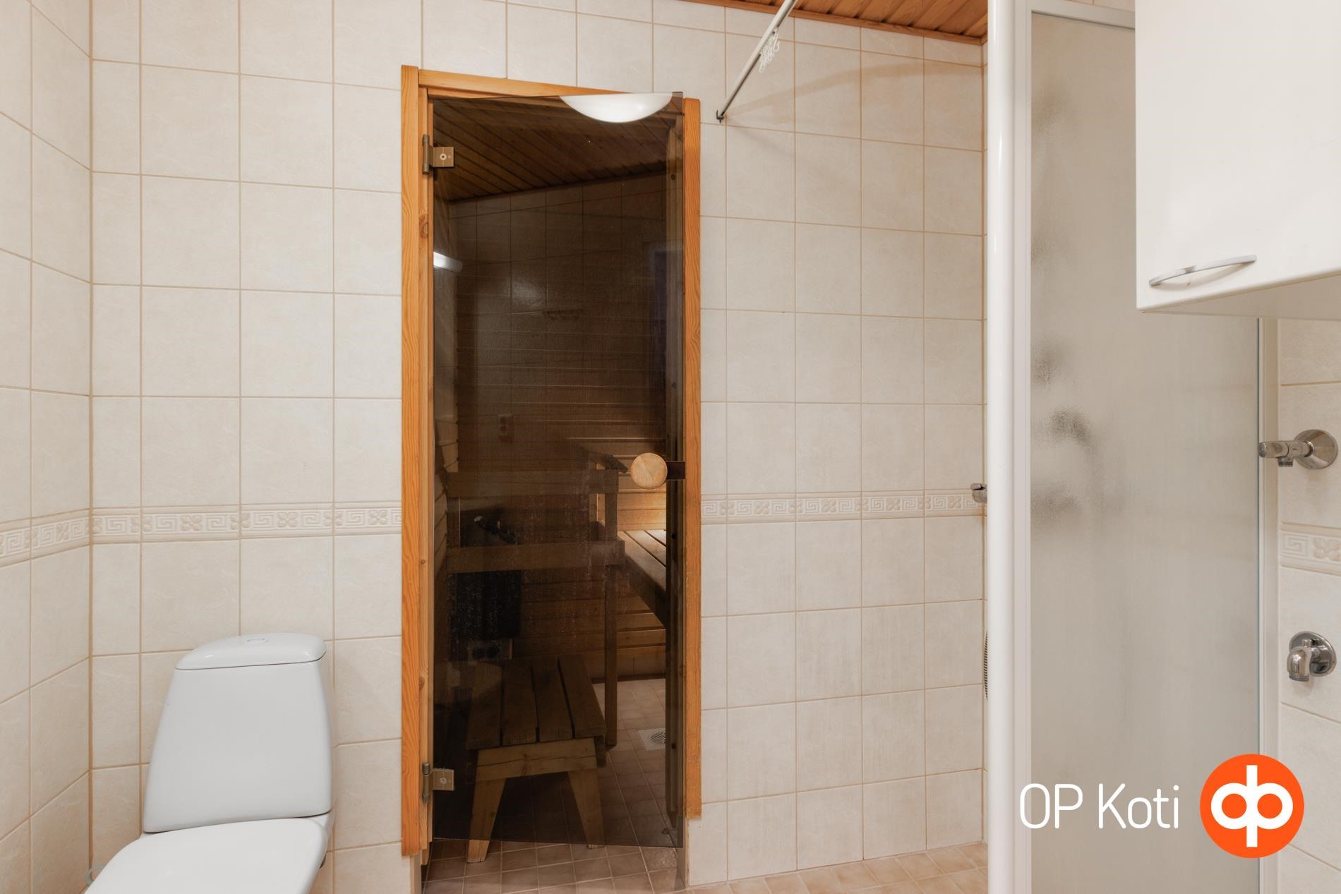 - Sauna, sähkökiuas Ei toimiva!, kylpyhuone, suihku, suihkuseinä, peilikaappi, allaskaappi, pesukoneliitäntä, lattialämmitys, kiinteät valaisimet.