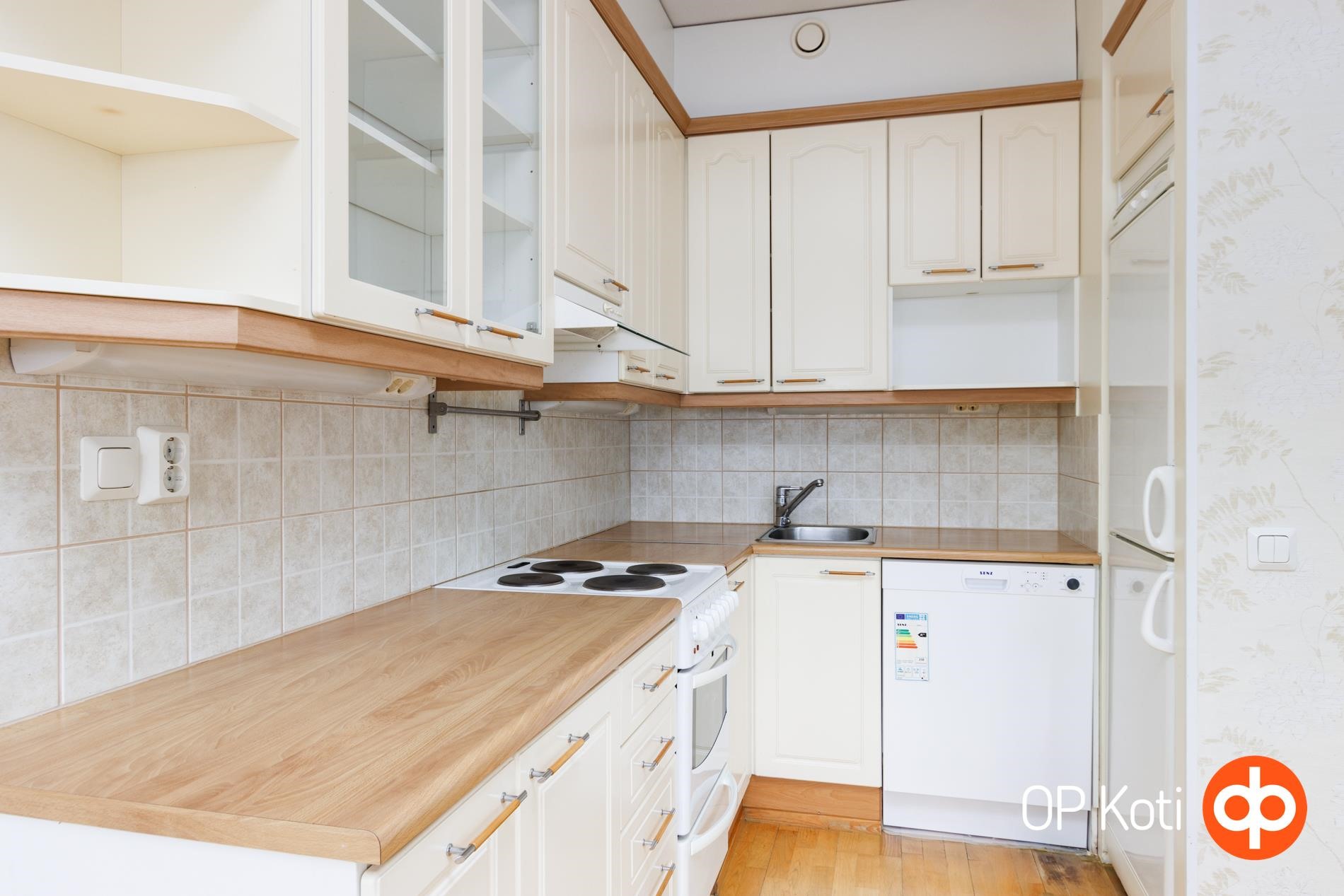 - Jääkaappipakastin, sähköliesi, liesituuletin, astianpesukone, kaapistot, kiinteät valaisimet.