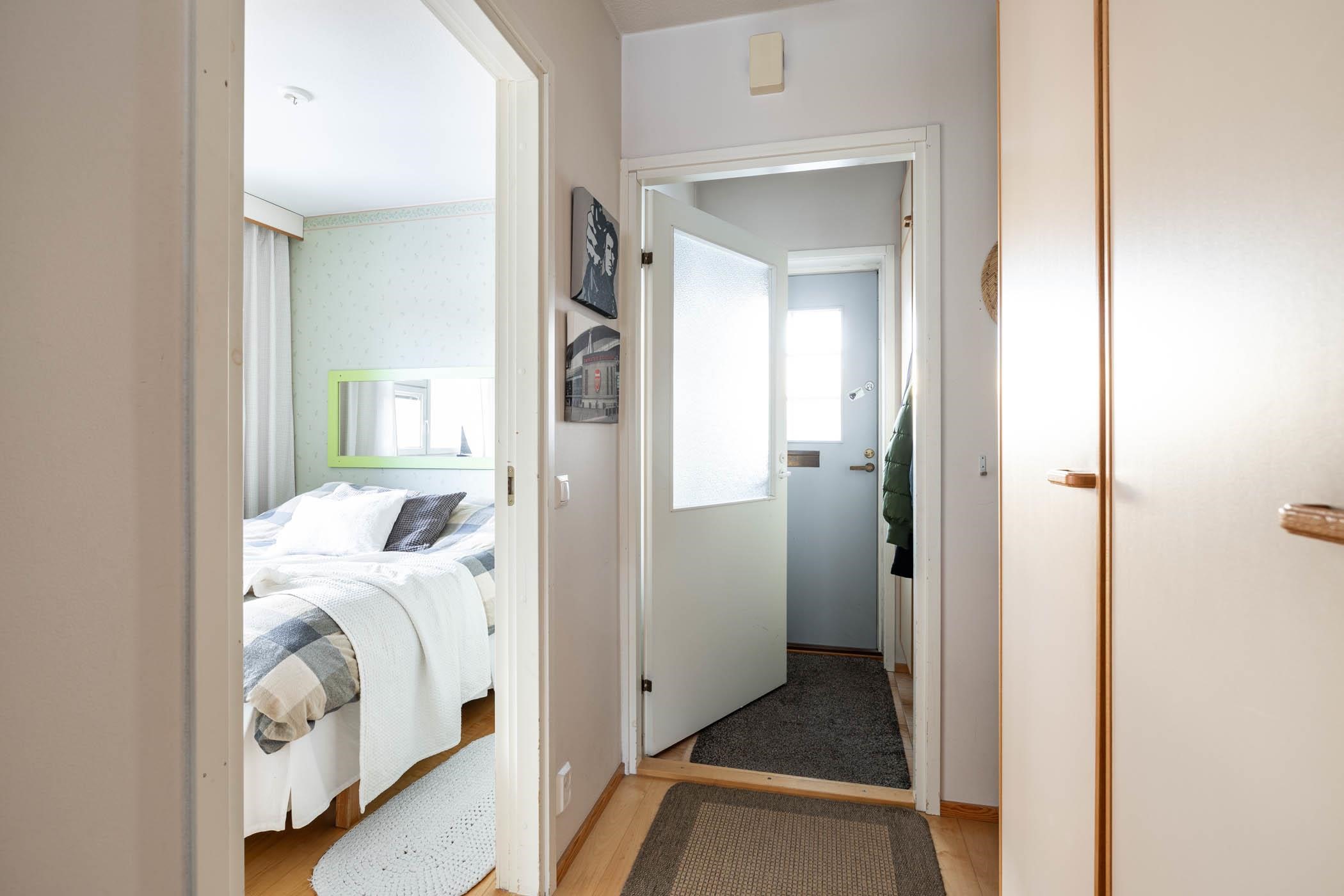 Keittiö: parketti, tapetti. Olohuone: parketti, tapetti. Makuuhuone: parketti, tapetti. Sauna: laatta, paneelit. Wc: laattalattia, seinä maali, altaan takana laatta. Tuulikaappi: laattalattia.
