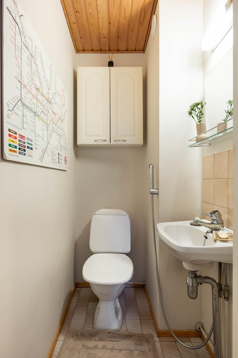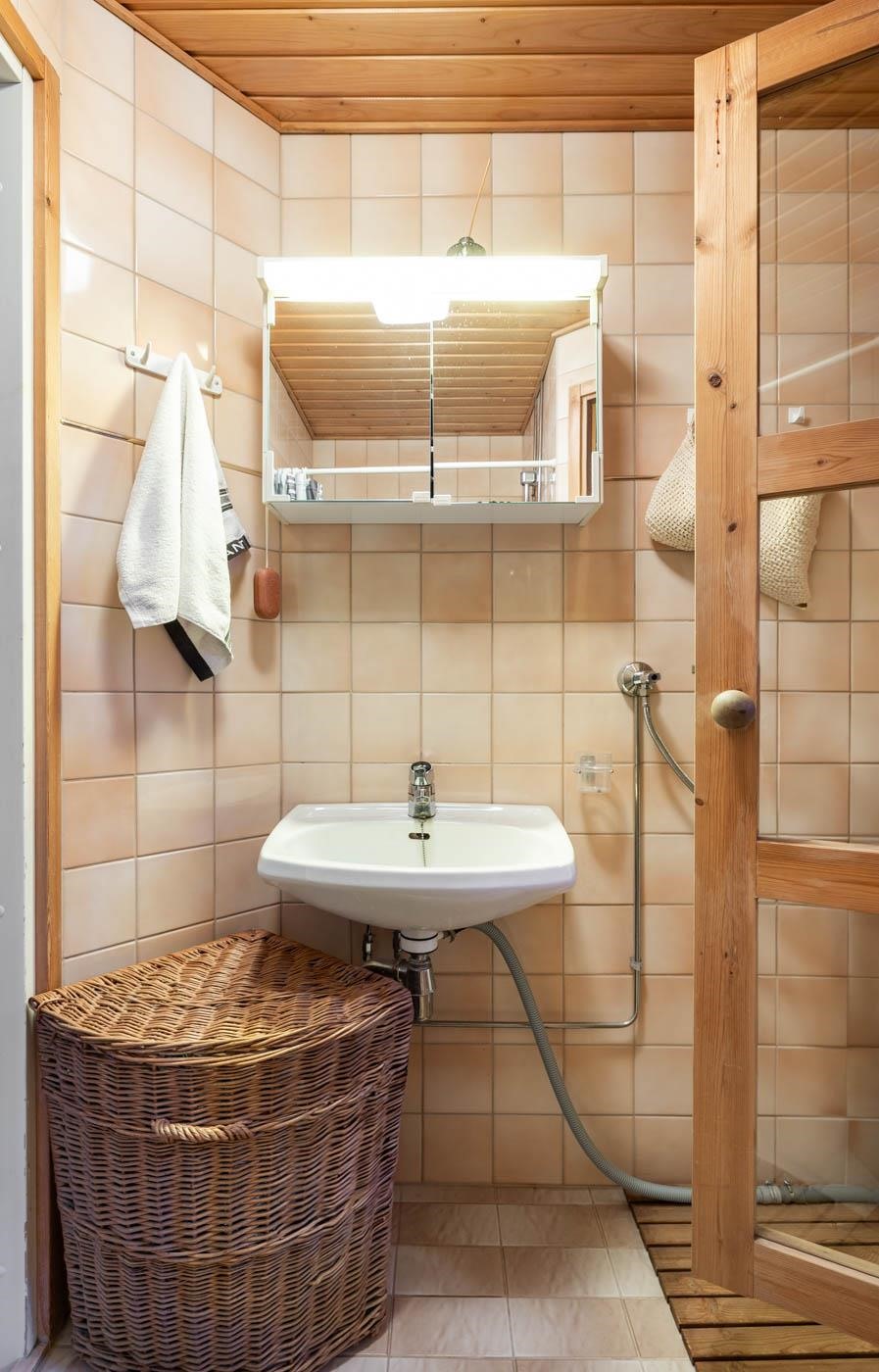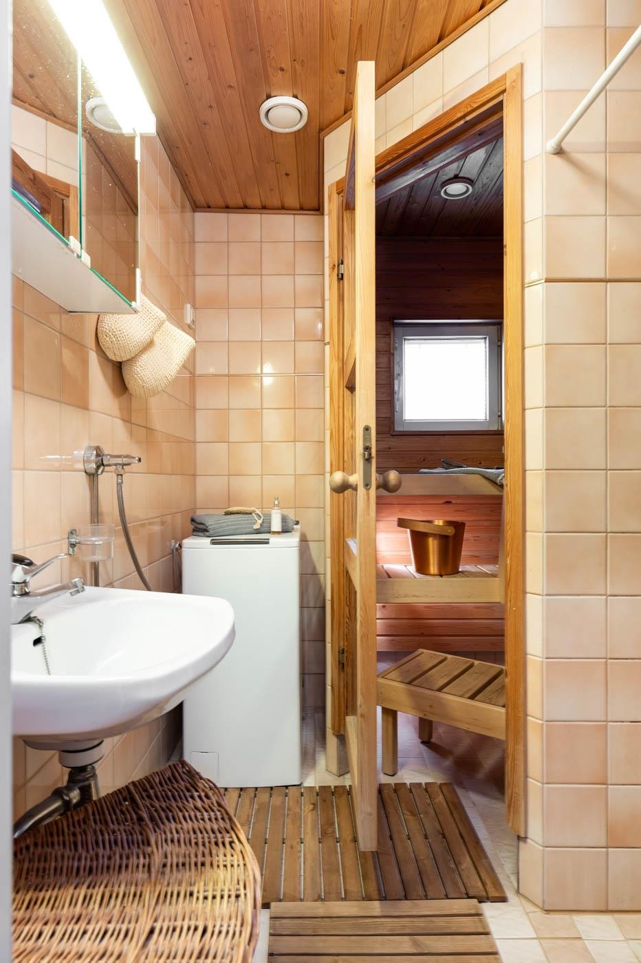 - Saunassa sähkökiuas. Kylpyhuoneessa suihku, peili, pesukoneliitäntä, lattialämmitys. Erillinen wc: peilikaappi, kaappi. Sauna ja kylpyhuone ja wc ovat alkuperäisiä