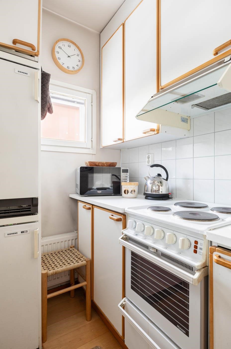 - Jääkaappipakastin, sähköliesi, liesikupu, kaapistot, kiinteät valaisimet. Keittiö on alkuperäinen.