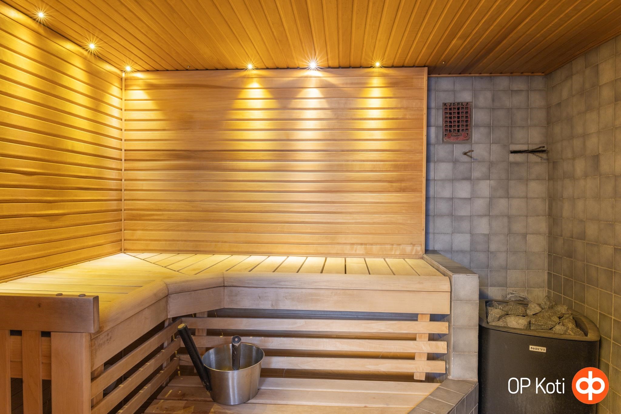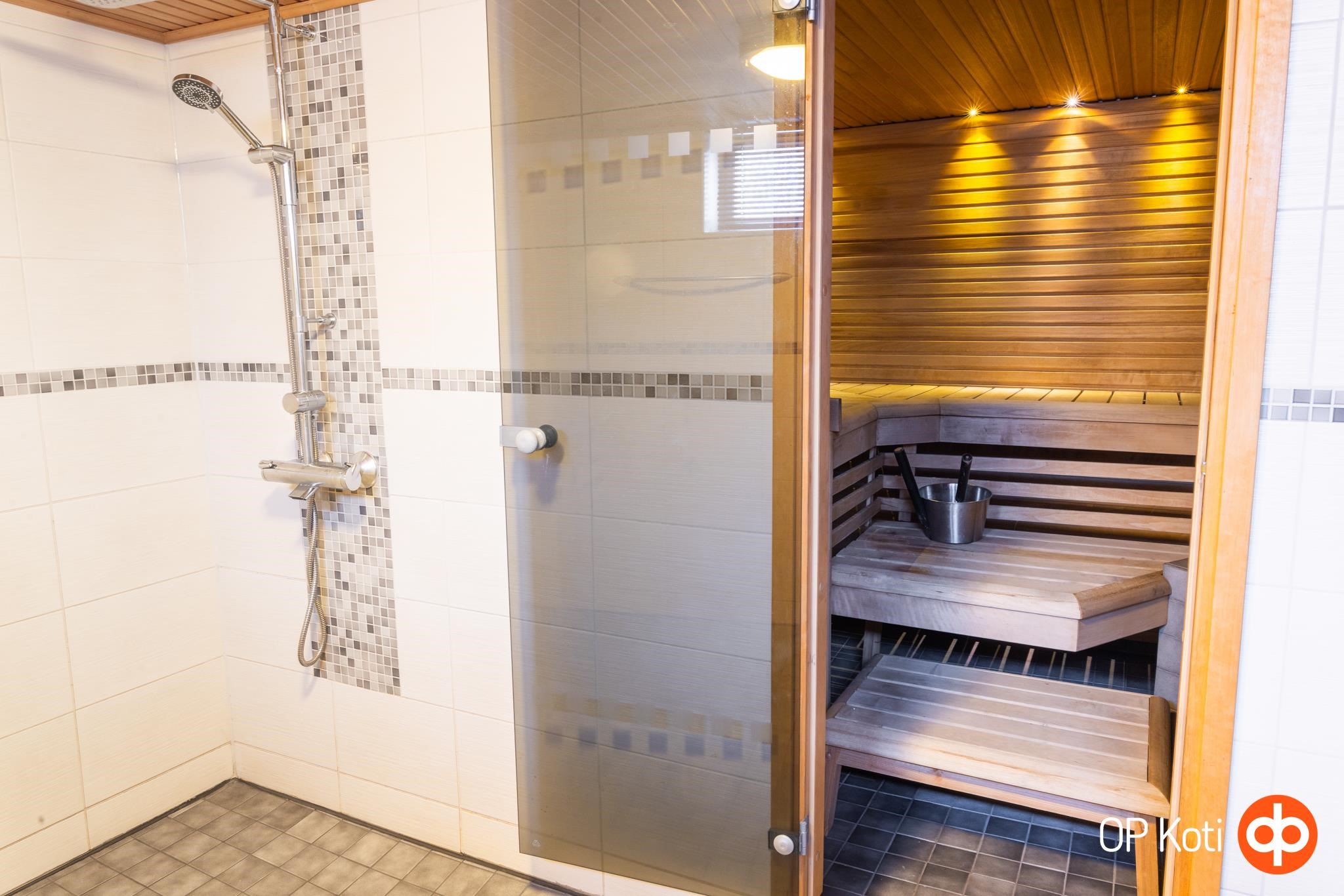 - Sauna, puukiuas varaus sähkökiukaalle, kylpyhuone, erillinen wc, suihku, peilikaappi, allaskaappi, pesukoneliitäntä, lattialämmitys pesuhuone ja sauna, kiinteät valaisimet.