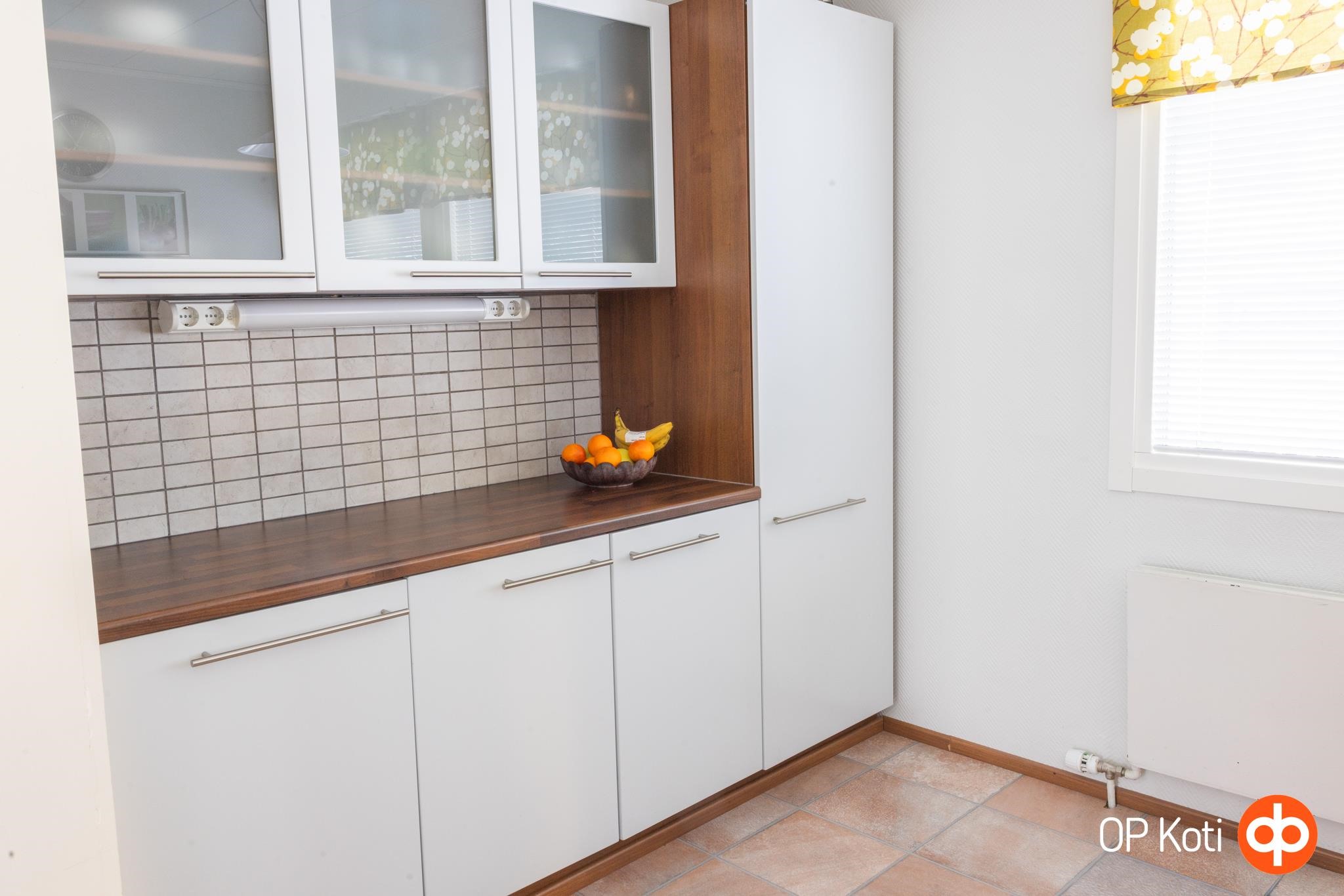 - Jääkaappipakastin, lattialiesi, liesituuletin, astianpesukone, kaapistot, kiinteät valaisimet.