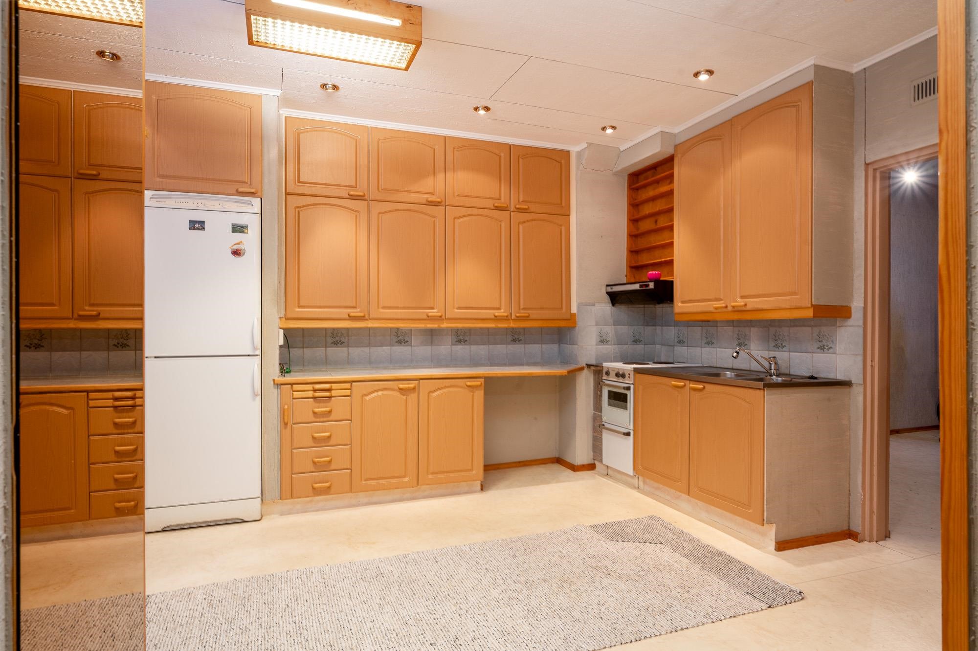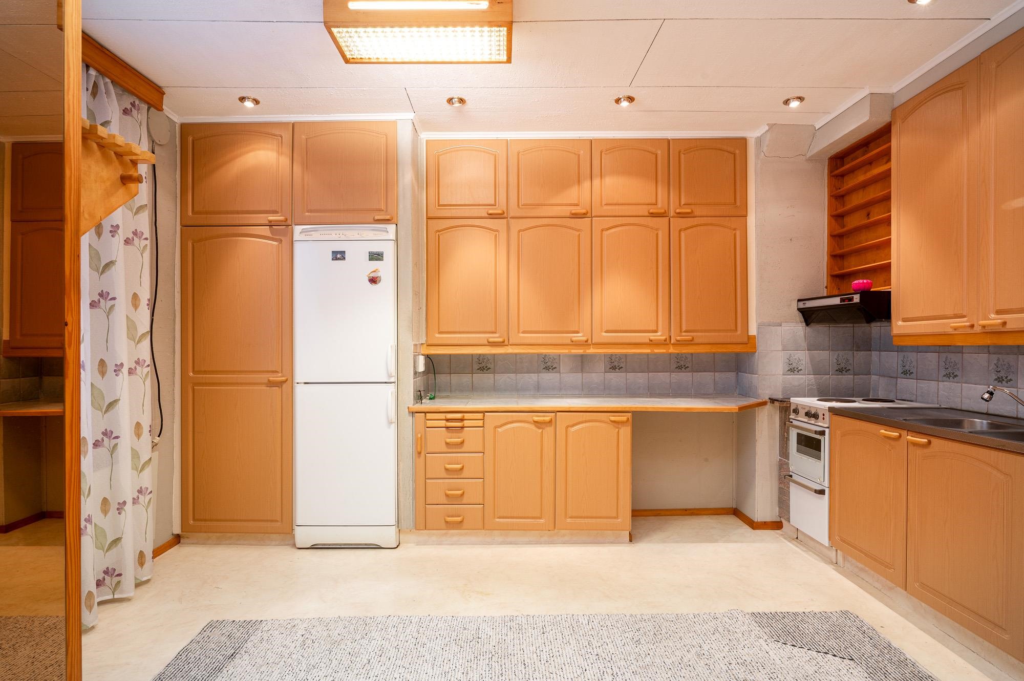 - Jääkaappipakastin, sähköliesi, kaapistot.
