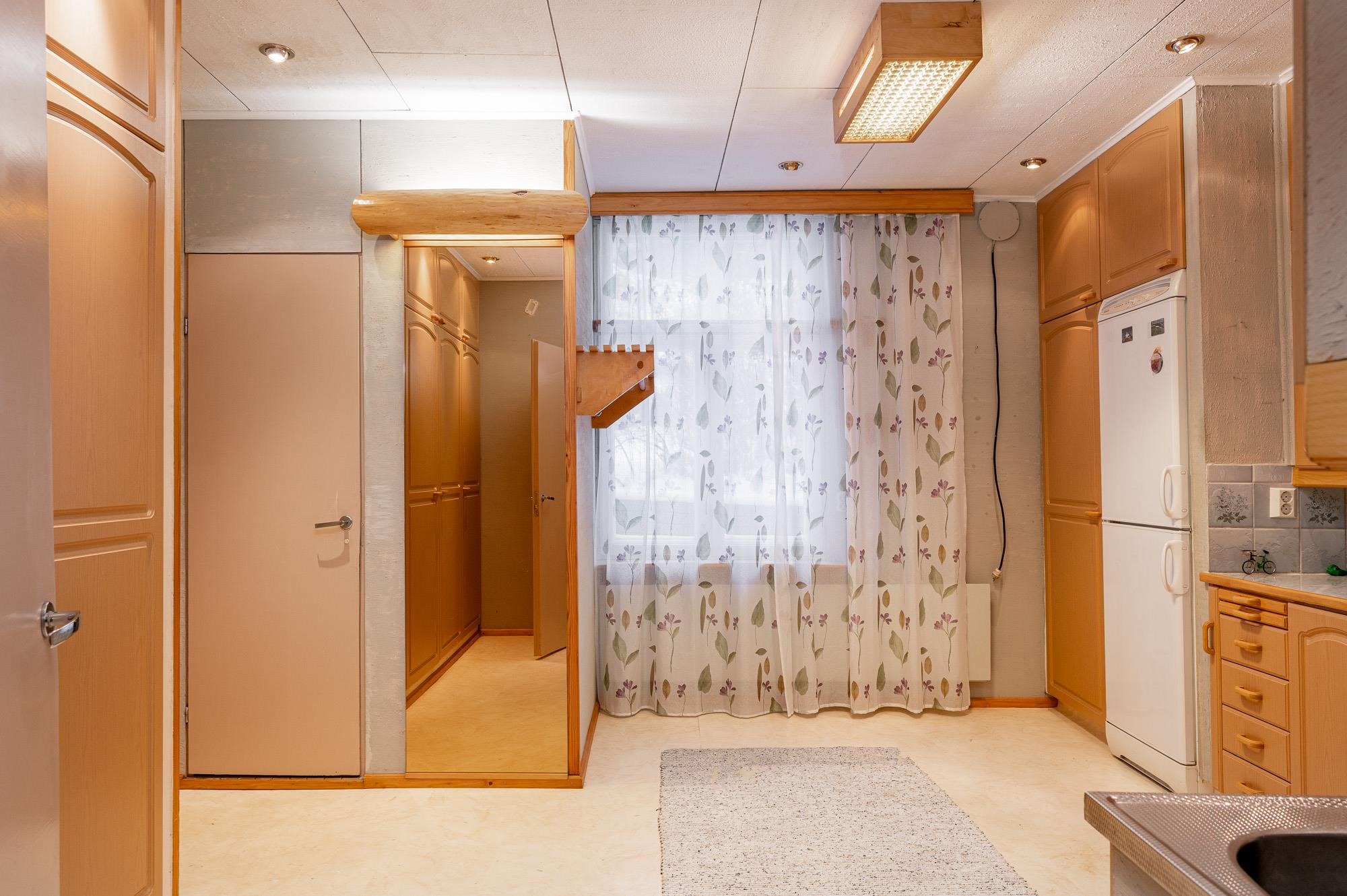 Keittiö: Muovimatto ja seinät maalattu. Olohuone: Muovimatto ja seinät tapettia. Kylpyhuone: Laattalattia ja seinälaatta. Eteinen: Muovimatto.