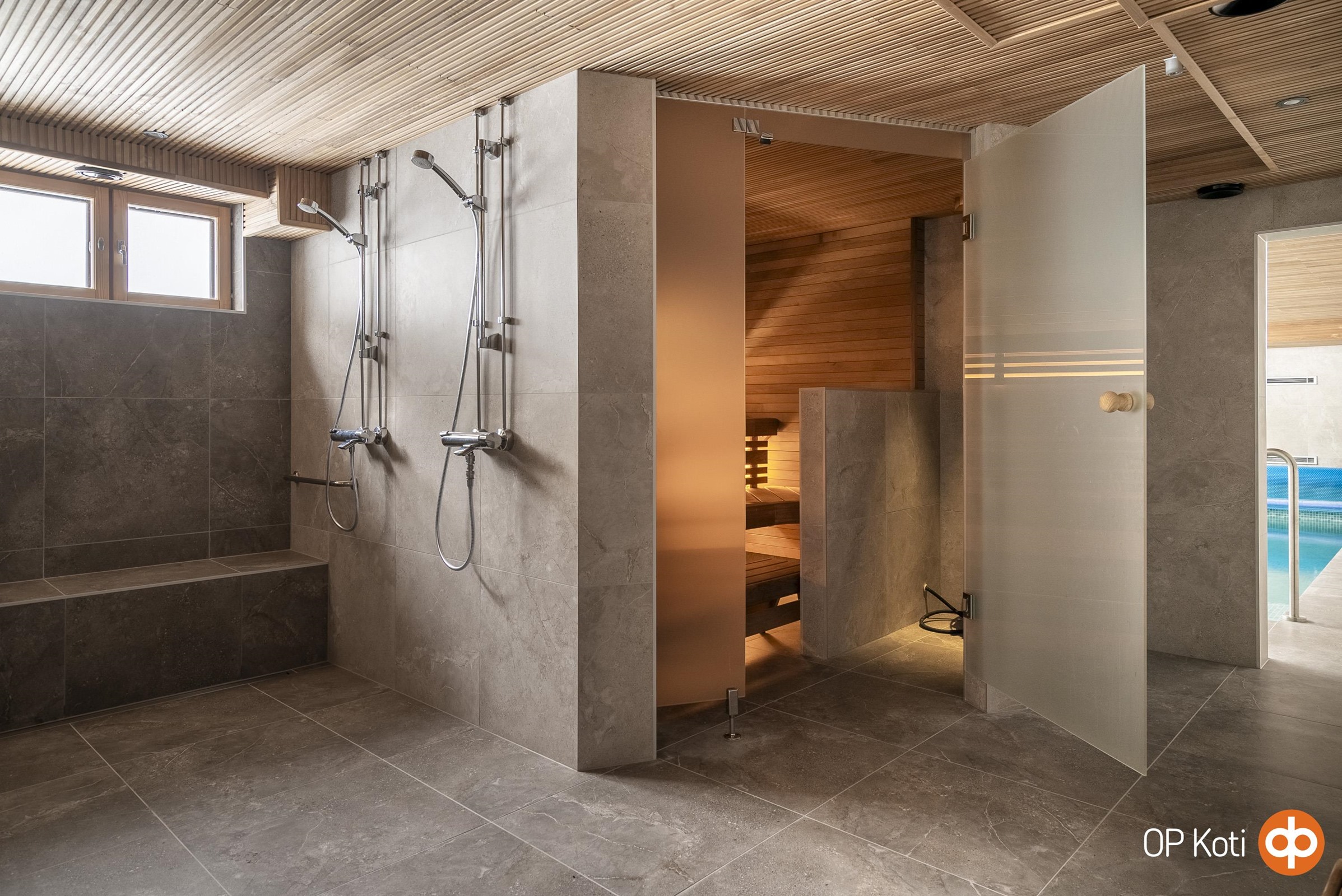 - Kylpyhuone, suihku, suihkuseinä, peilit, peilikaappi, pesukoneliitäntä, kiinteät valaisimet.
