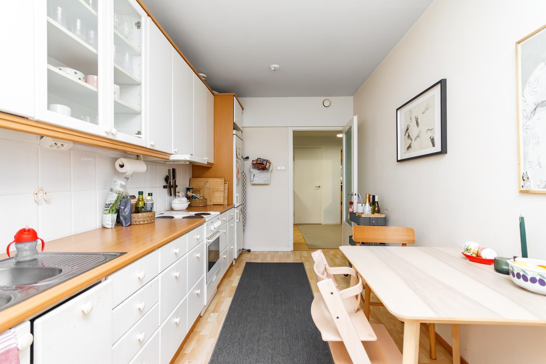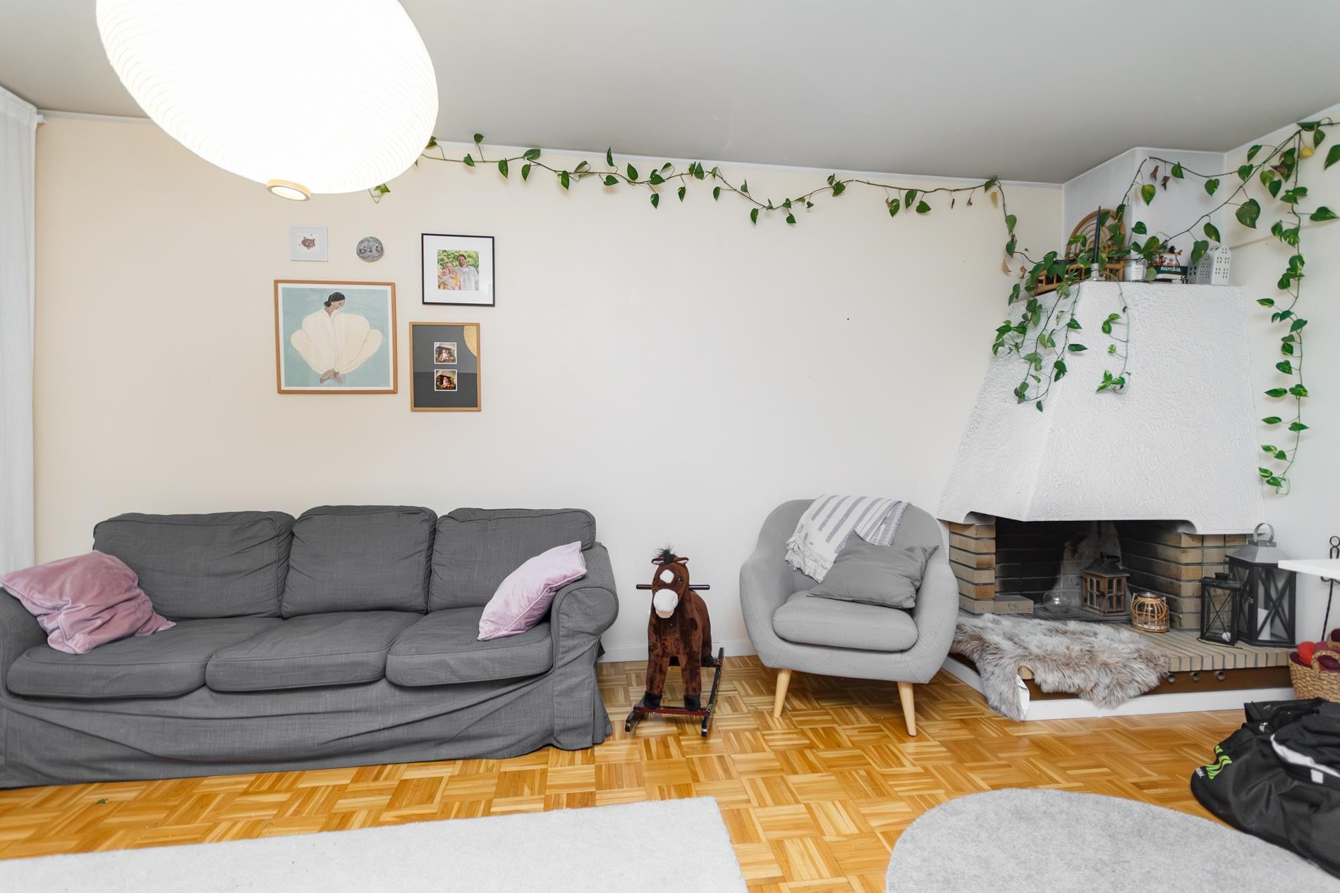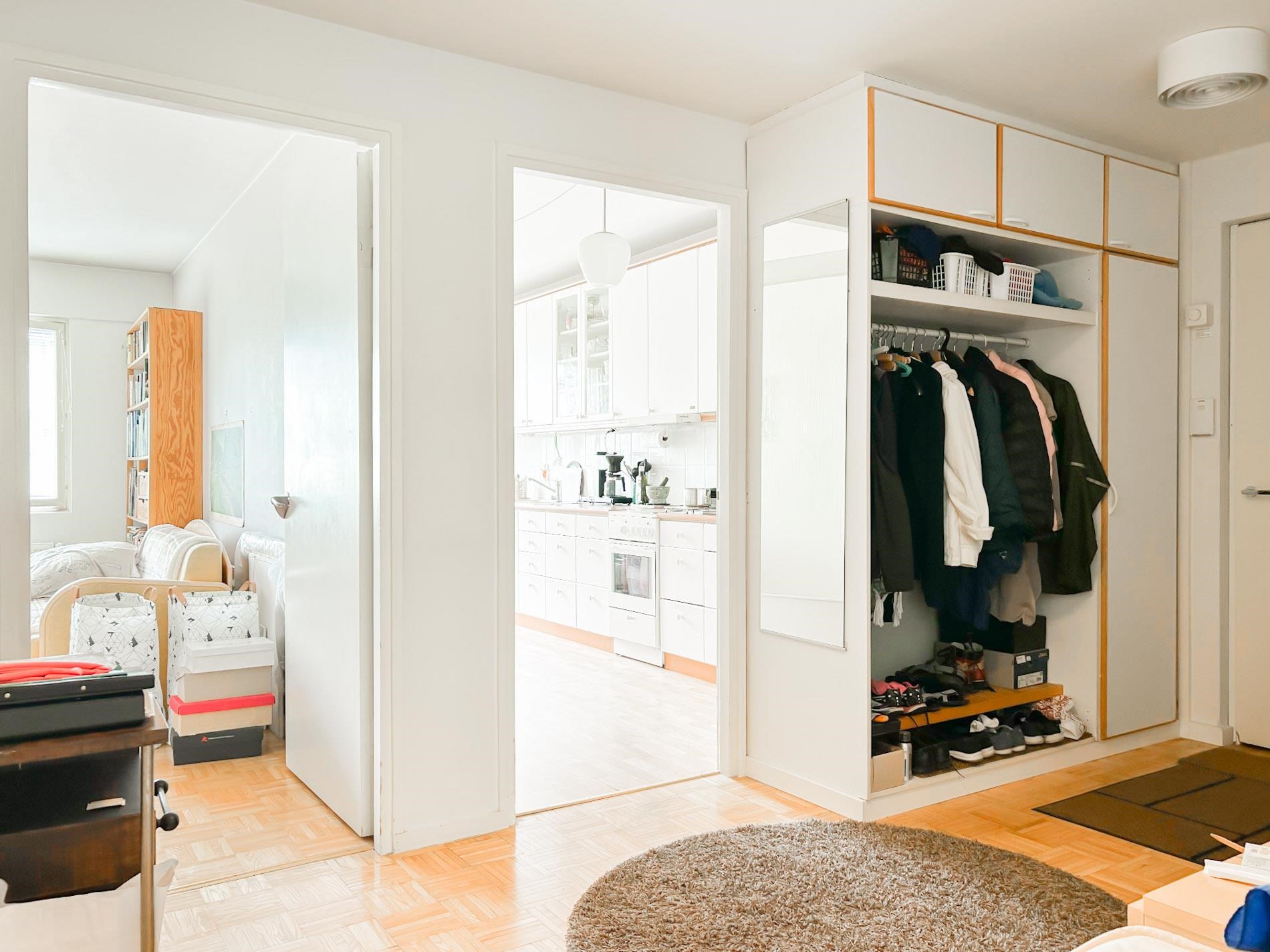 Keittiössä on runsaasti kaappitilaa ja keittiöön mahtuu hyvin myös ruokapöytä. Varusteluun kuuluu jääkaappipakastin, liesituuletin, liesi, uuni sekä astianpesukone. Avaran olohuoneen yhteydessä on idyllinen takka (ei käytössä), joka toimii sisustuselementtinä. Olohuoneesta on käynti viihtyisälle lasitetulle parvekkeelle. Makuuhuoneissa on säilytystilana kaapistot. Kylpyhuoneessa on liitäntä pyykinpesukoneelle.