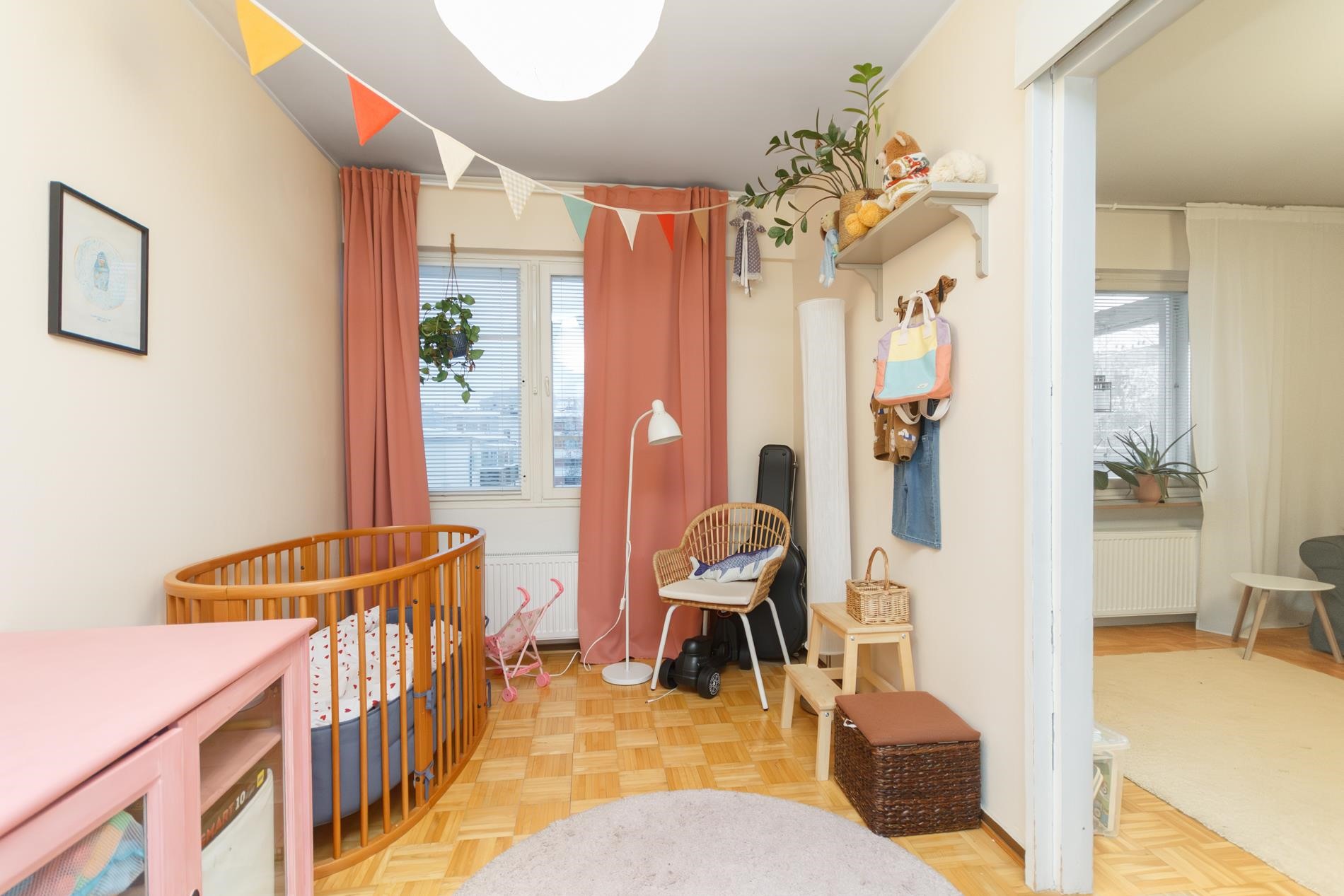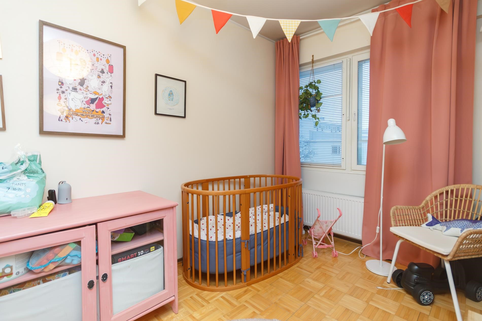 Lattiat: Parketti. Seinät: Tapetoitu/maalattu. Kylpyhuone: Laatoitettu.