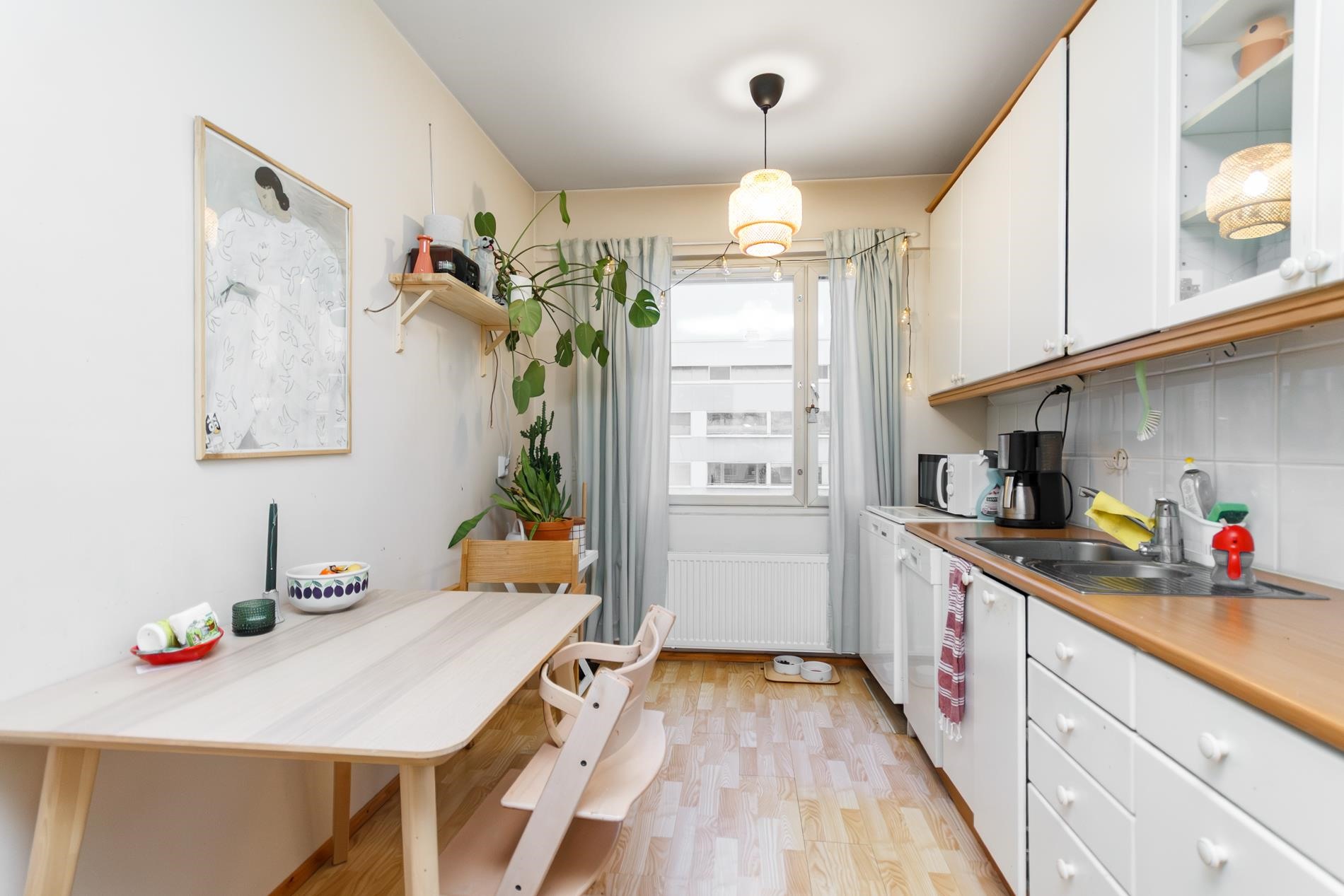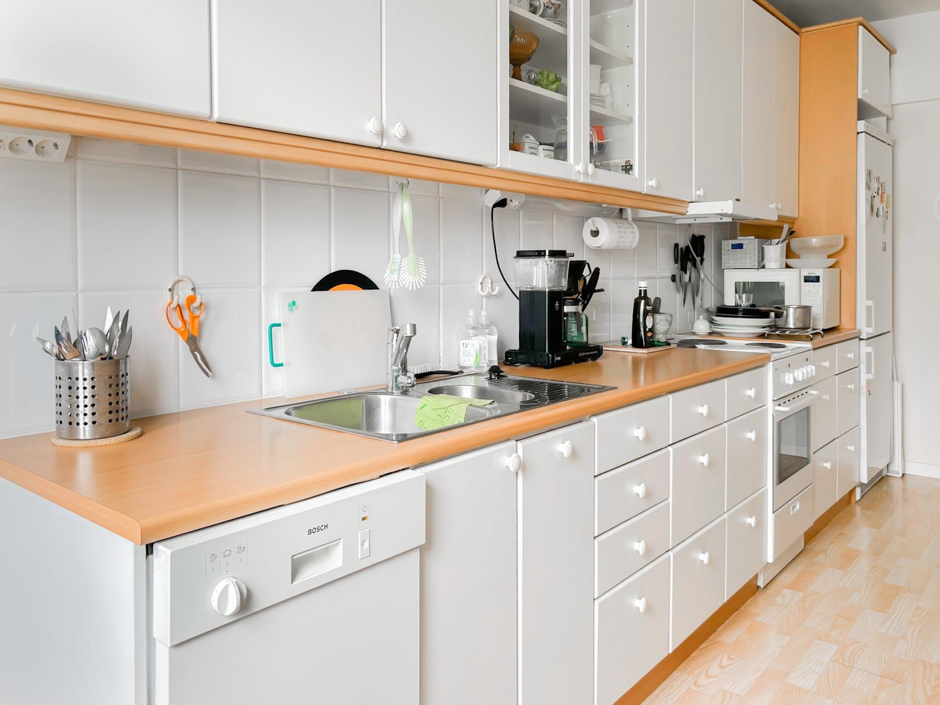 - Jääkaappipakastin, lattialiesi, sähköliesi, liesituuletin, astianpesukone, kaapistot, kiinteät valaisimet.