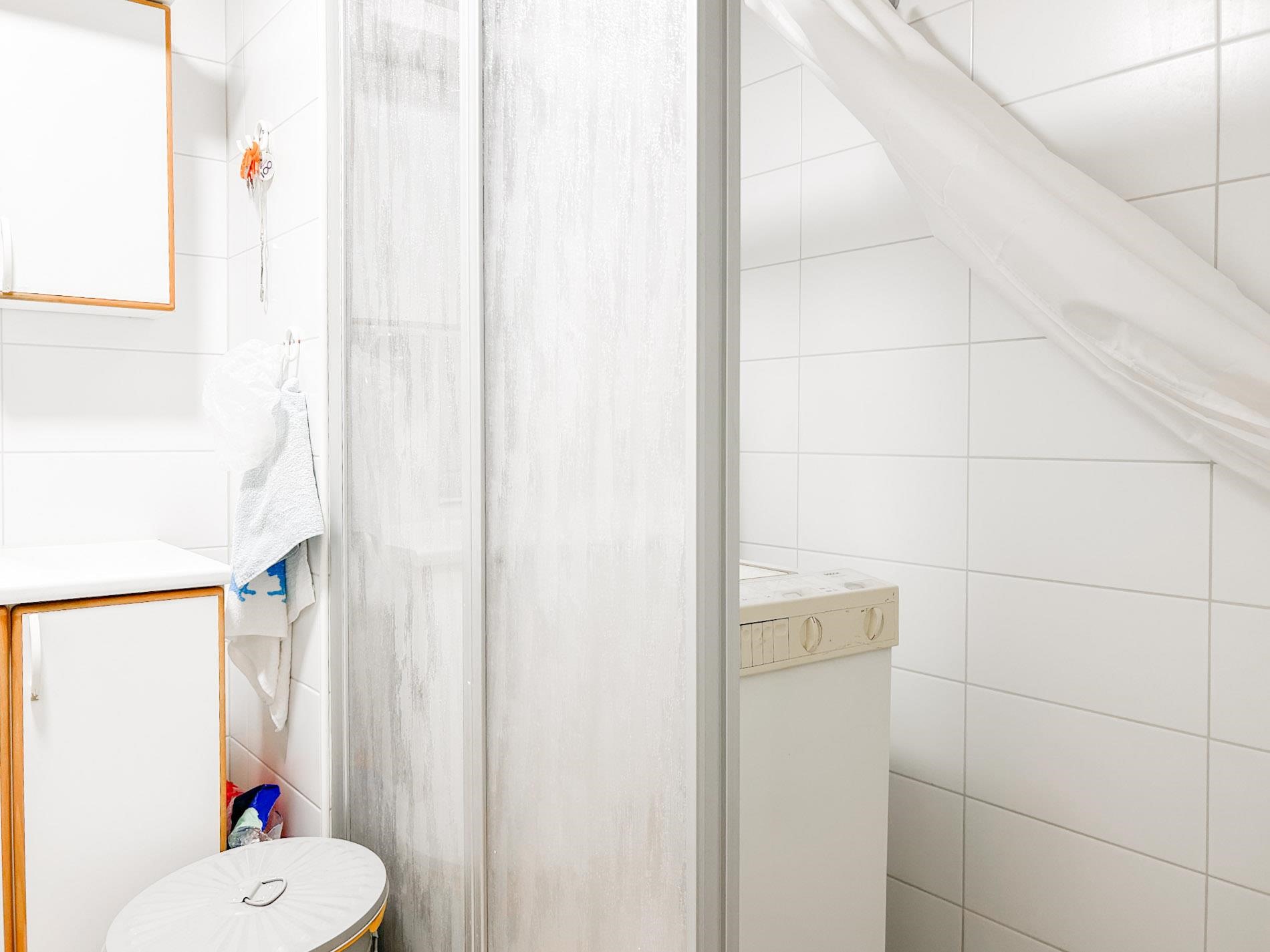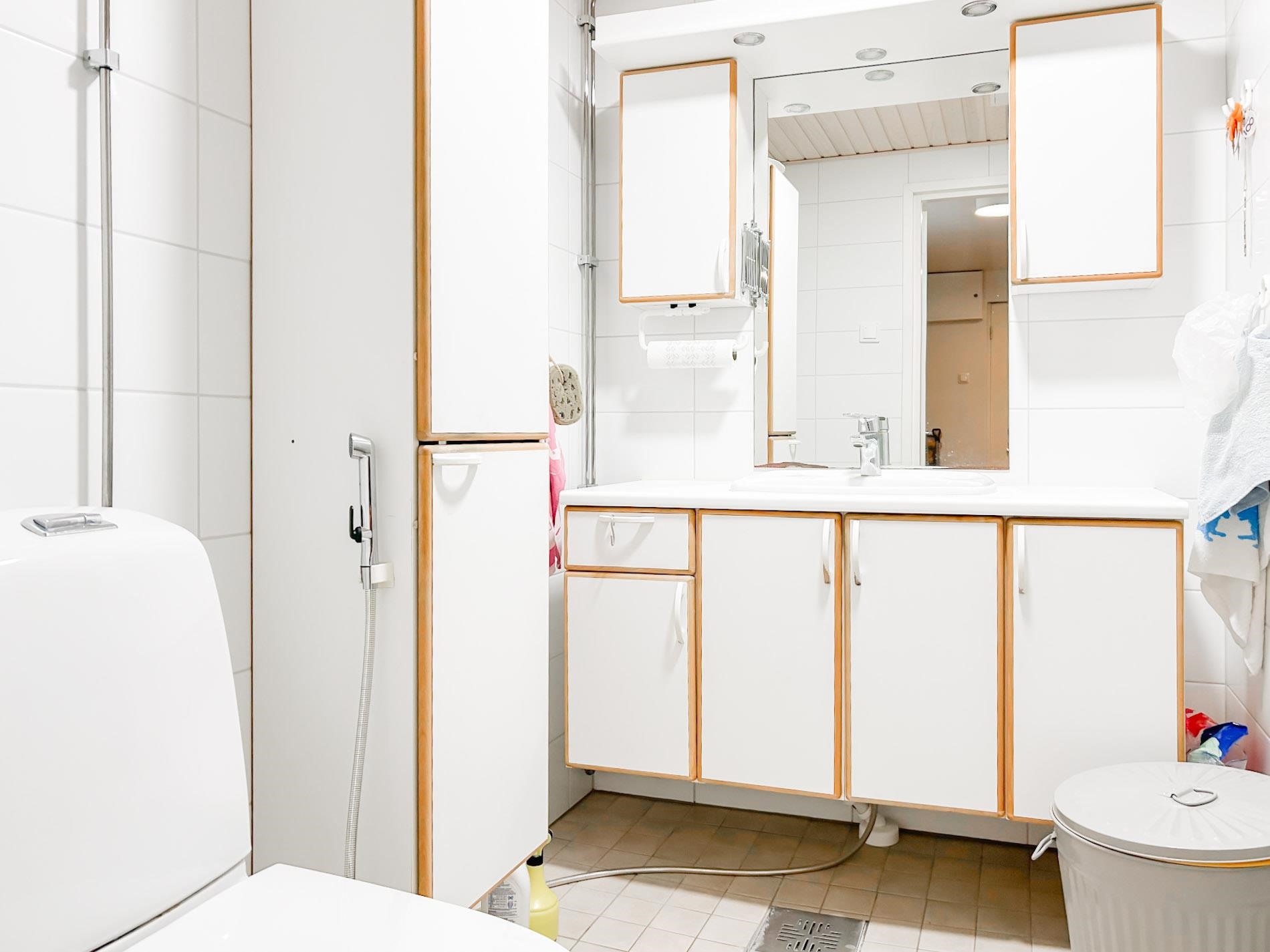 - Kylpyhuone, suihku, suihkuseinä, peilit, kaapit, allaskaappi, pesukoneliitäntä, kiinteät valaisimet.