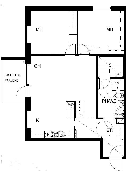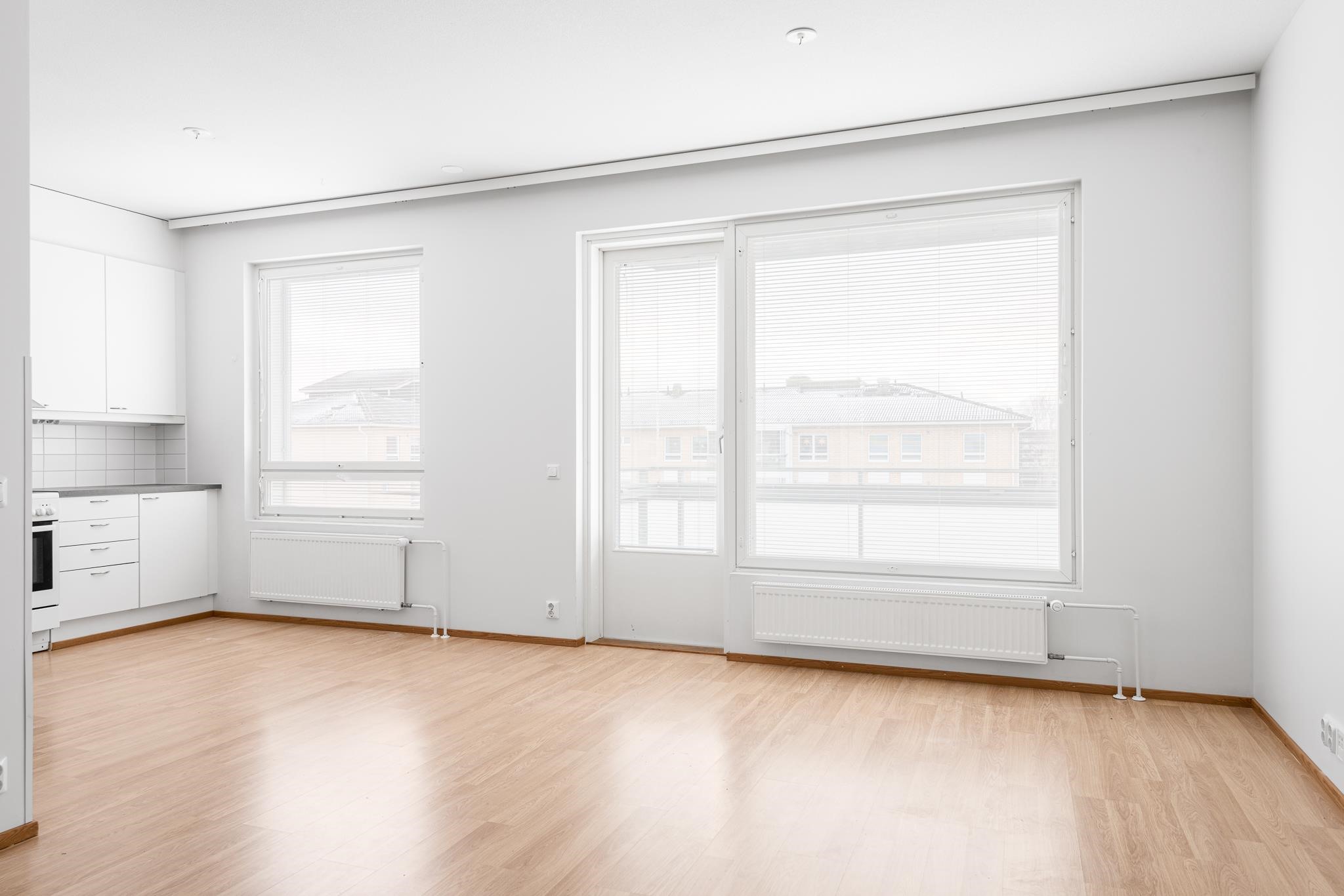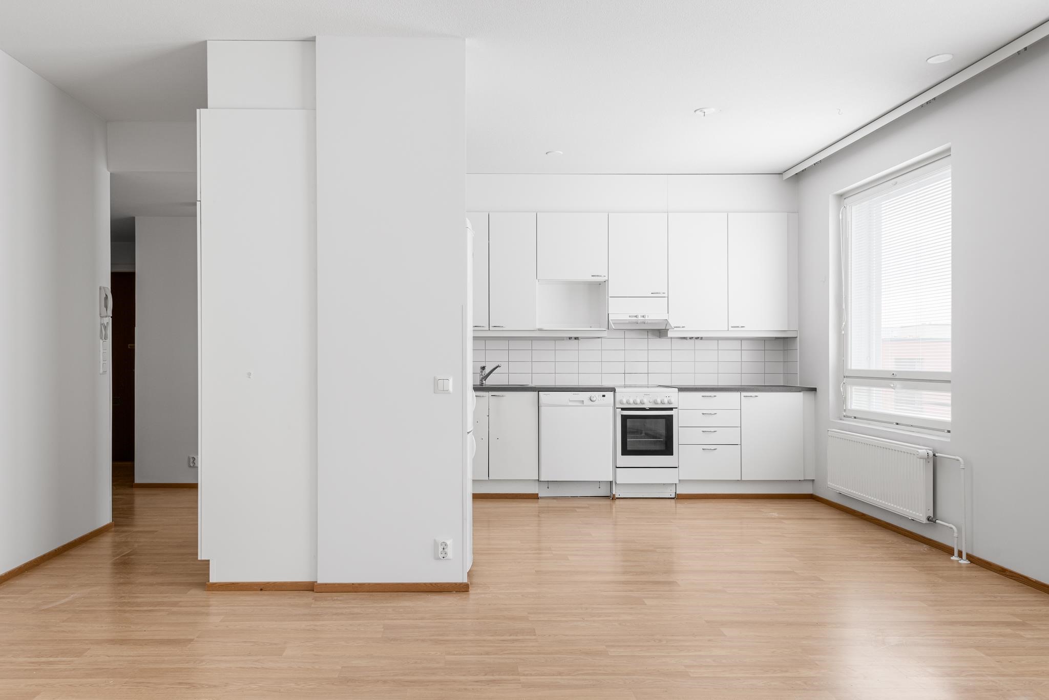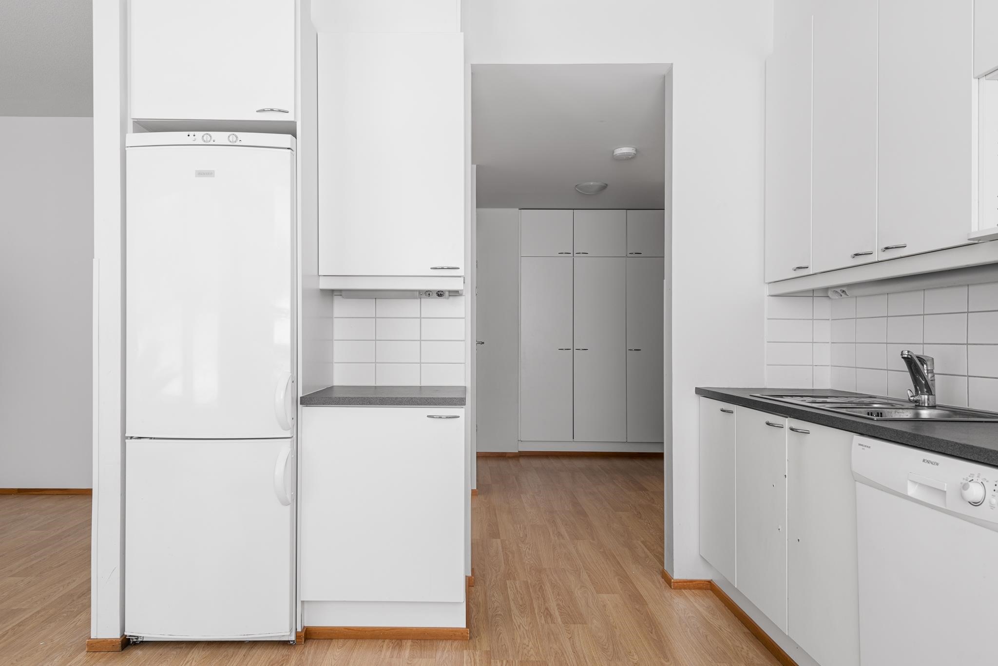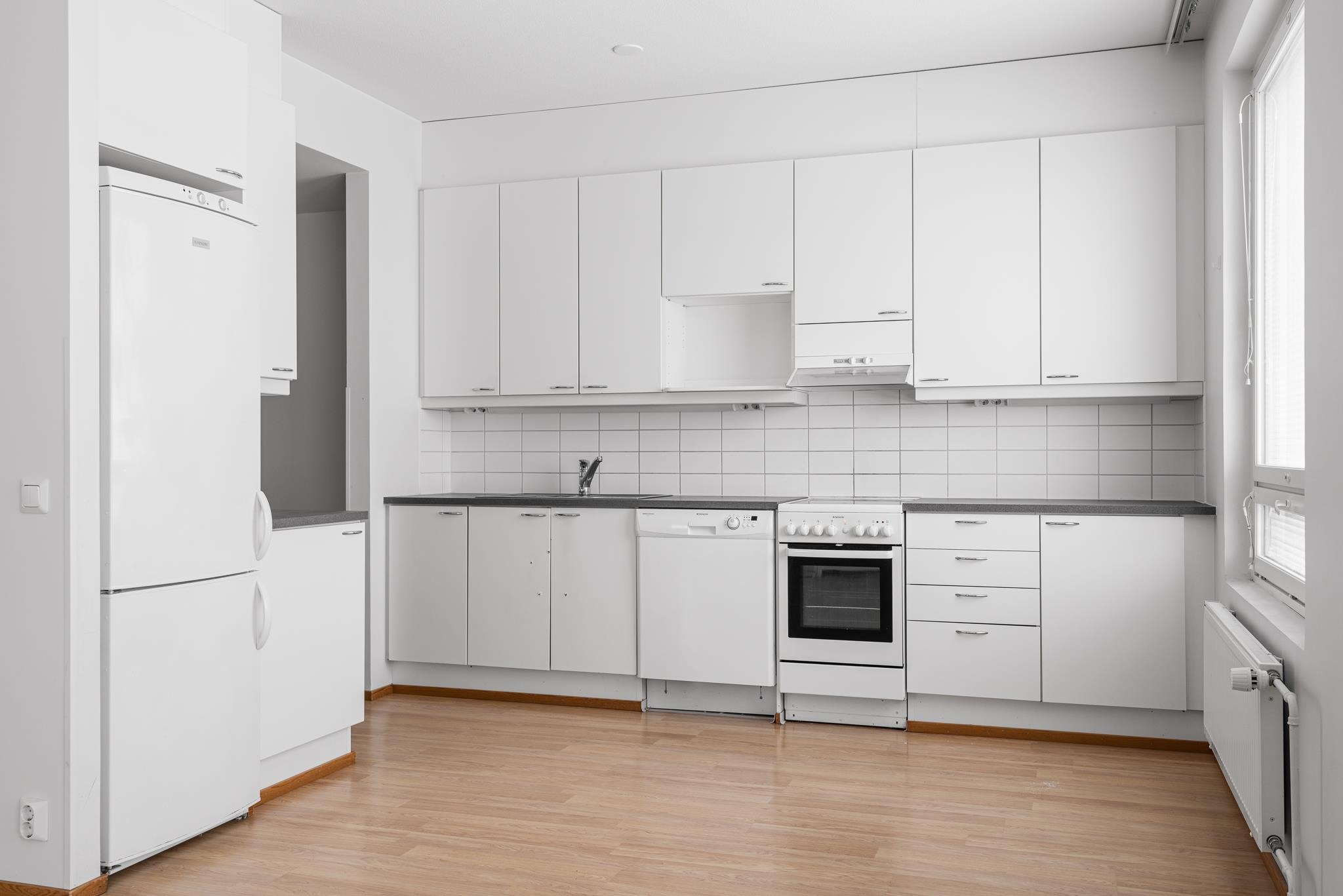 - Jääkaappipakastin, keraaminen liesi, liesituuletin, astianpesukone, kaapistot, kiinteät valaisimet.