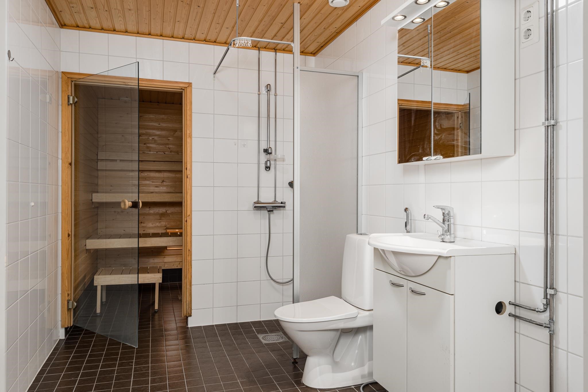 - Sauna, sähkökiuas, suihku, suihkuseinä, peilit, pesukoneliitäntä, lattialämmitys, kiinteät valaisimet.