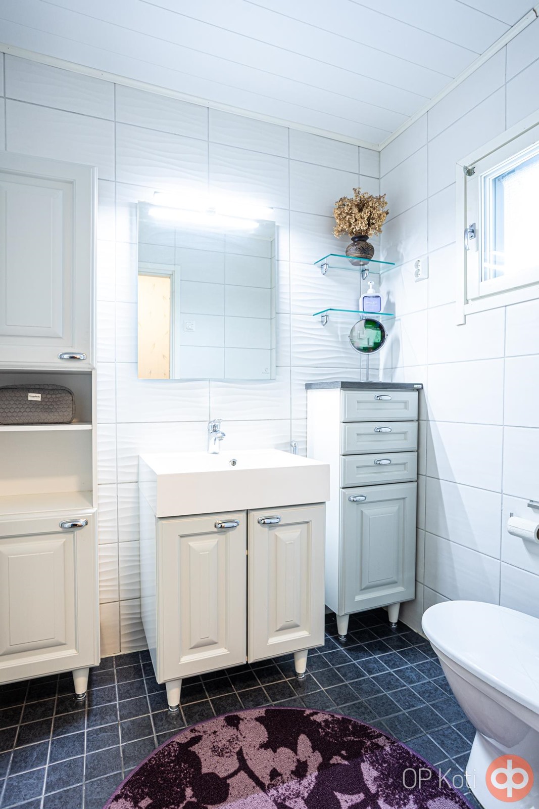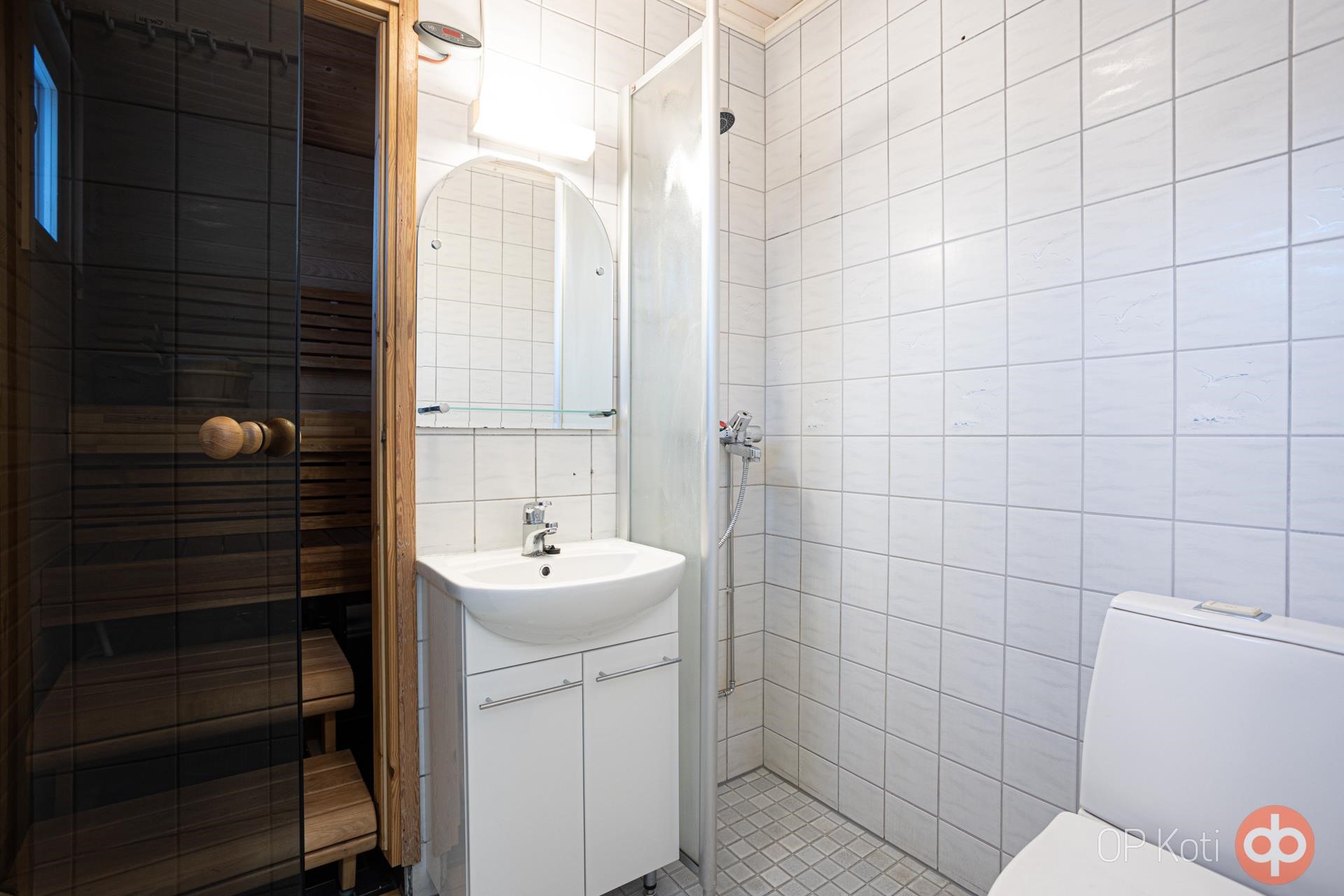 - Sauna, sähkökiuas, kylpyhuone, erillinen wc, suihku, suihkuseinä, peilit, kaapit, allaskaappi, pesukoneliitäntä, lattialämmitys kph/s, pukuhuonetila, wc, kiinteät valaisimet. Sauna: lattia, lauteet, kiuas, paneelit uusittu 2017 Erillinen WC: kalusteet (Nelko) uusittu, seinät ja lattia laatoitettu 2018