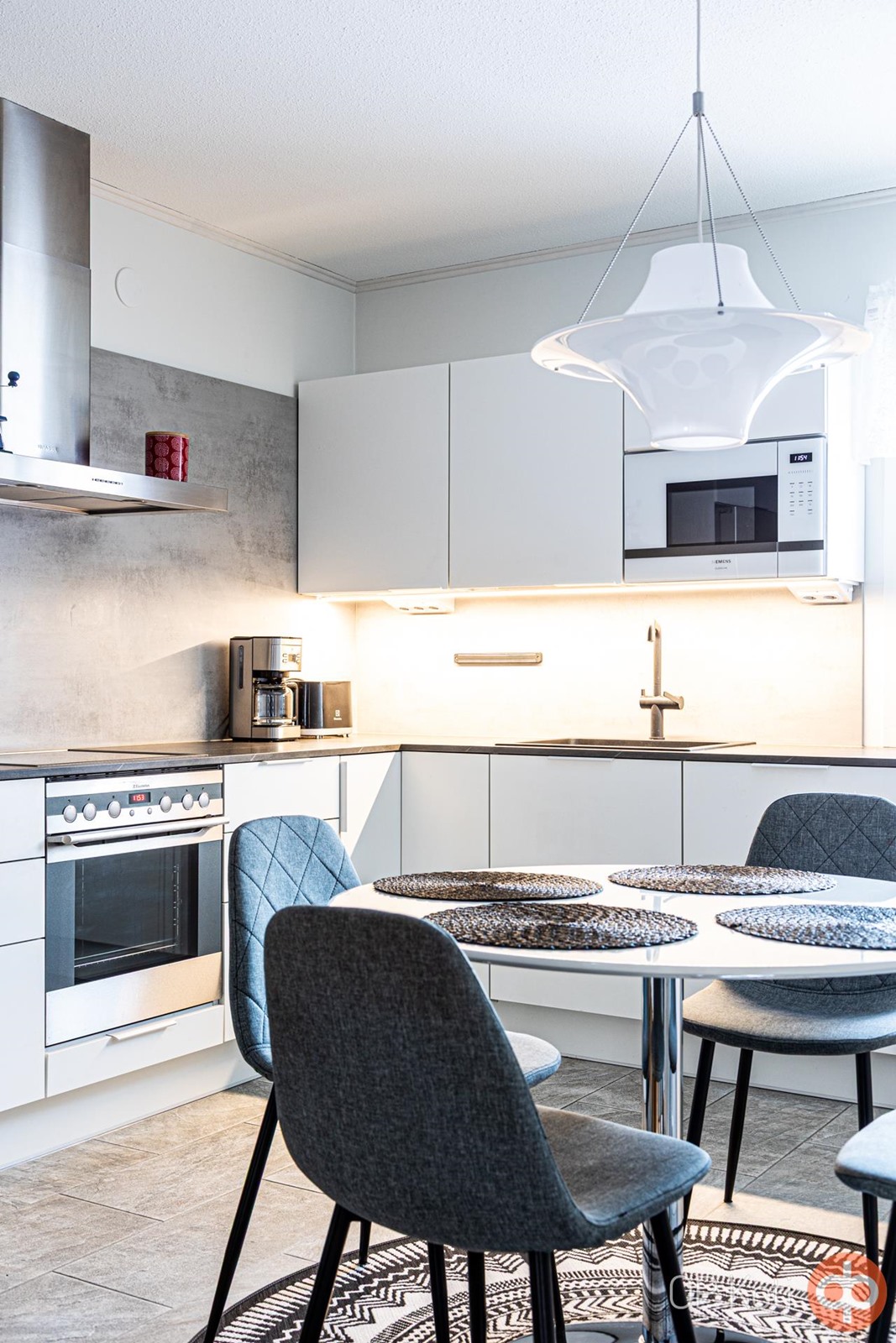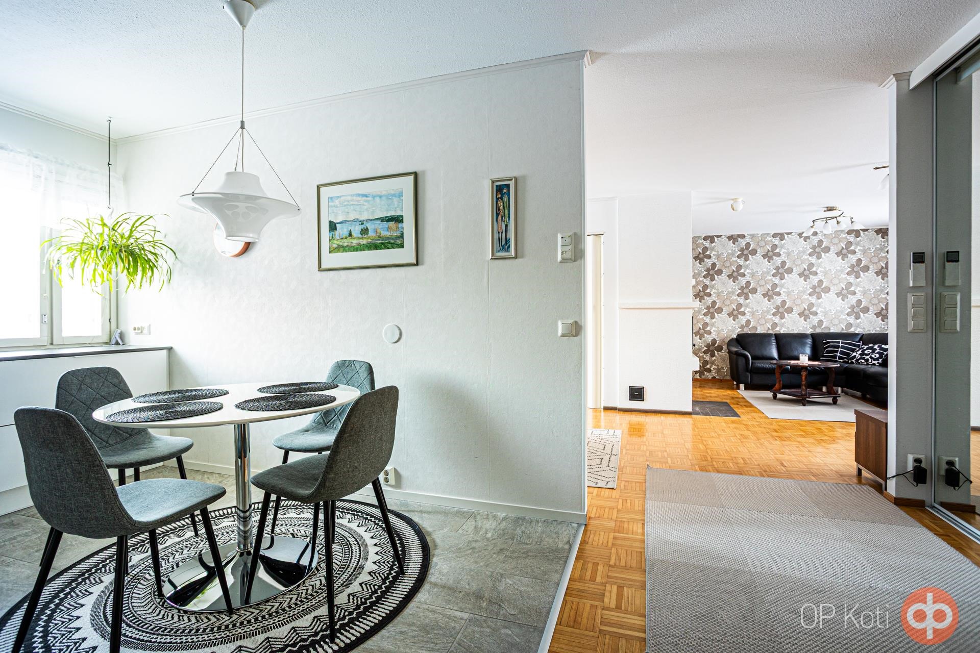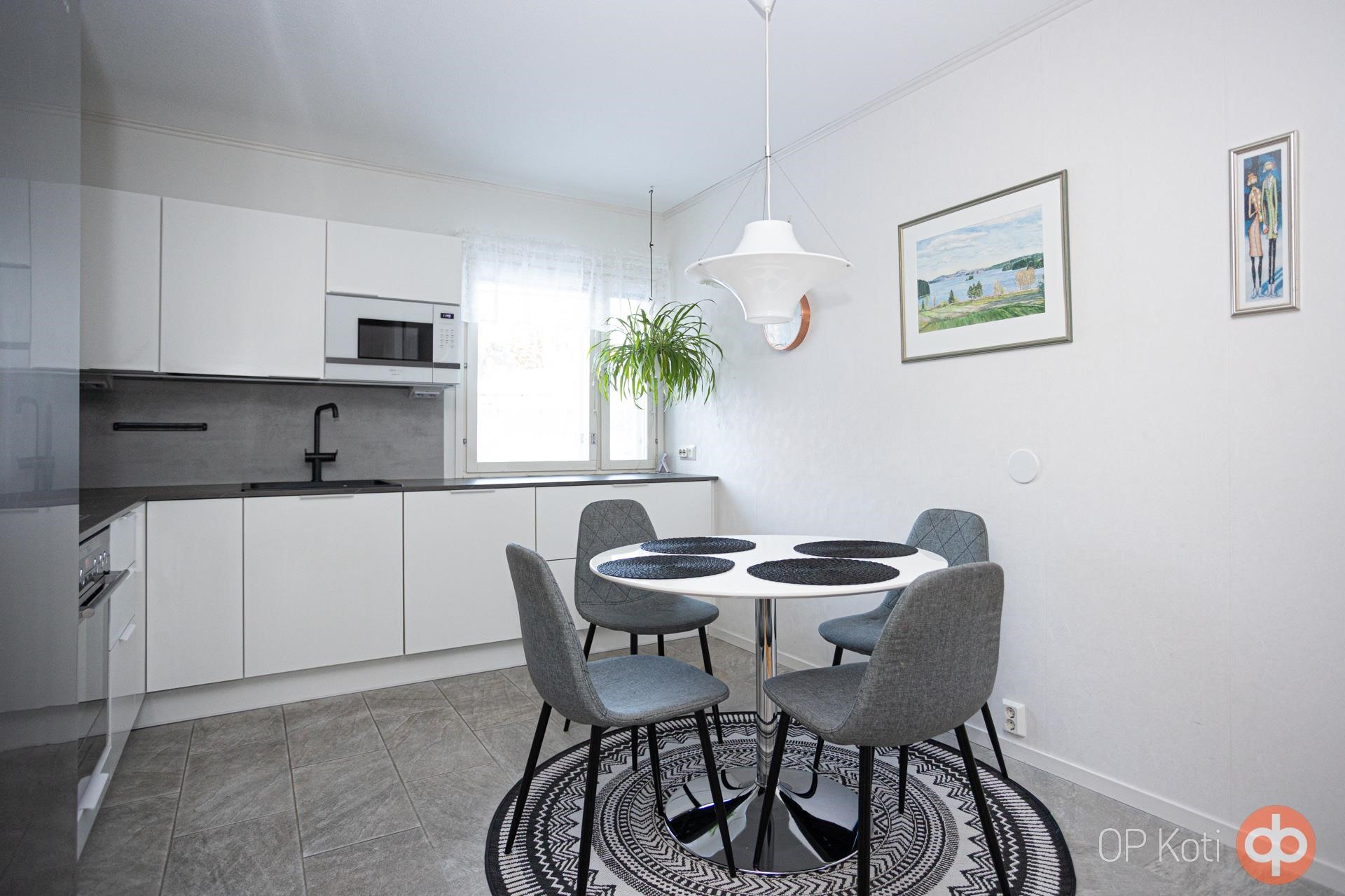 Uusittu keittiö on ajattoman tyylikäs. Puustellin valkoiset kaapistot sointuvat kauniisti työtasojen ja lattian harmaaseen sävymaailmaan. Rosteriset kodinkoneet ja liesikupu viimeistelevät modernin ilmeen. Keittiössä on paikka arjen aterioille ja erillinen ruokailutila mahdollistaa isommankin seurueen kokoontumisen.
