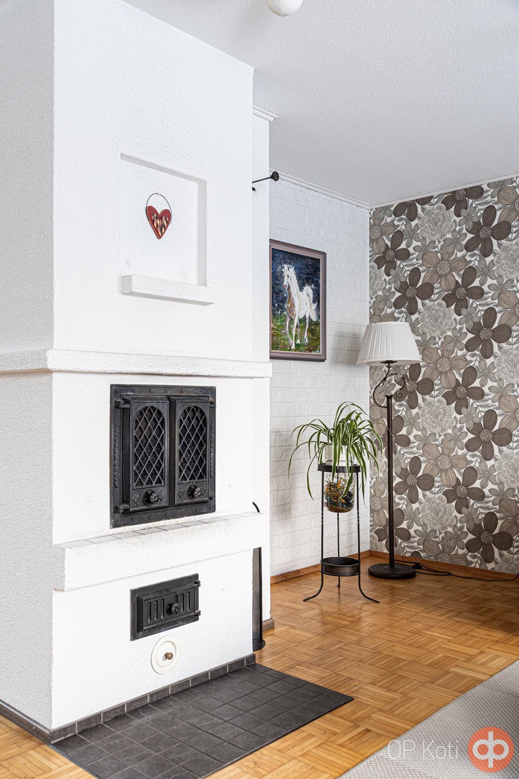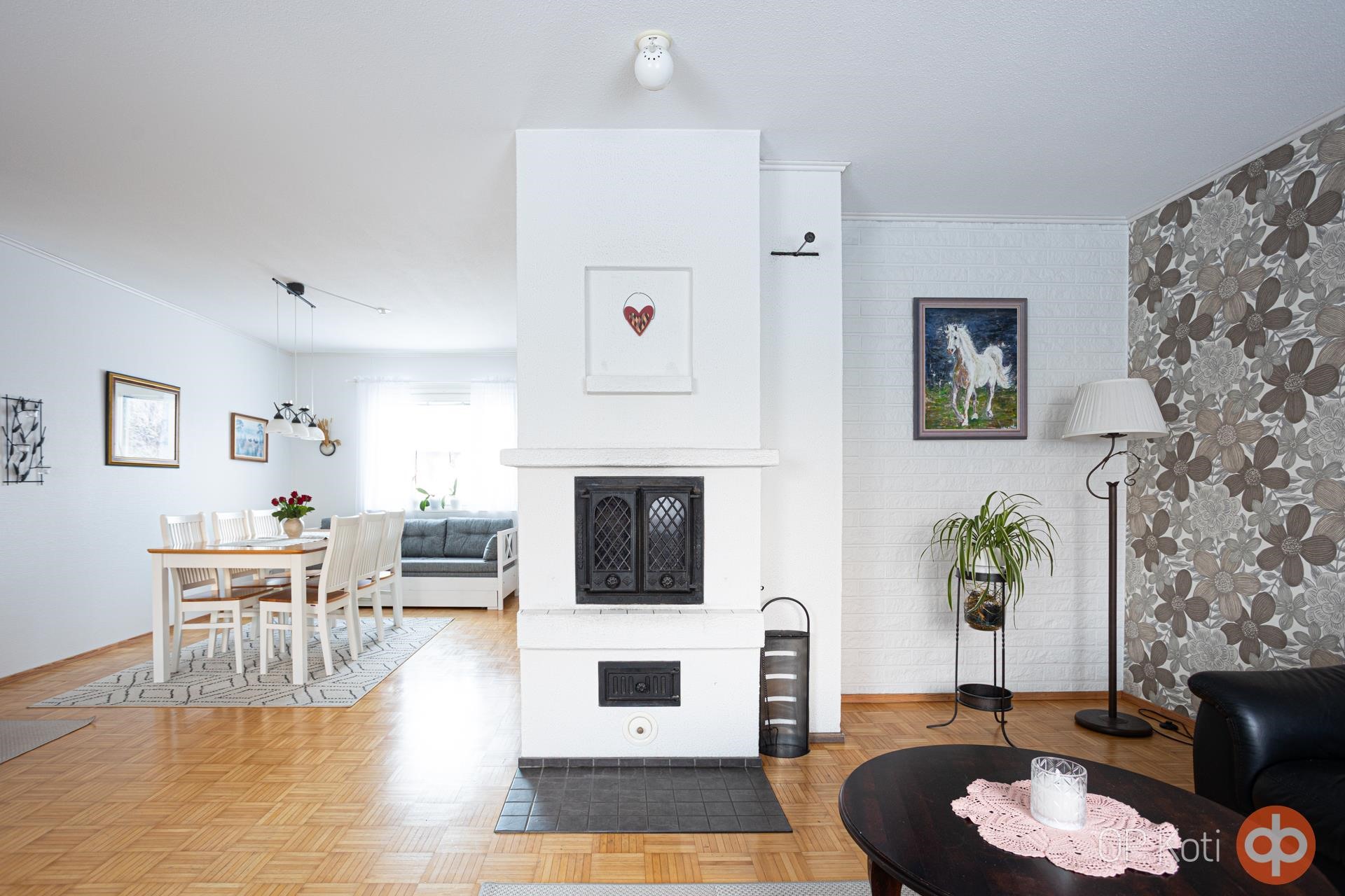 Olohuoneen kaunis valkoinen varaava takka tuo mukanaan kodikasta lämpöä ja viihtyisyyttä. Eteiseen sijoitettu ilmalämpöpumppu huolehtii mukavasta sisälämpötilasta sekä energiatehokkuudesta.