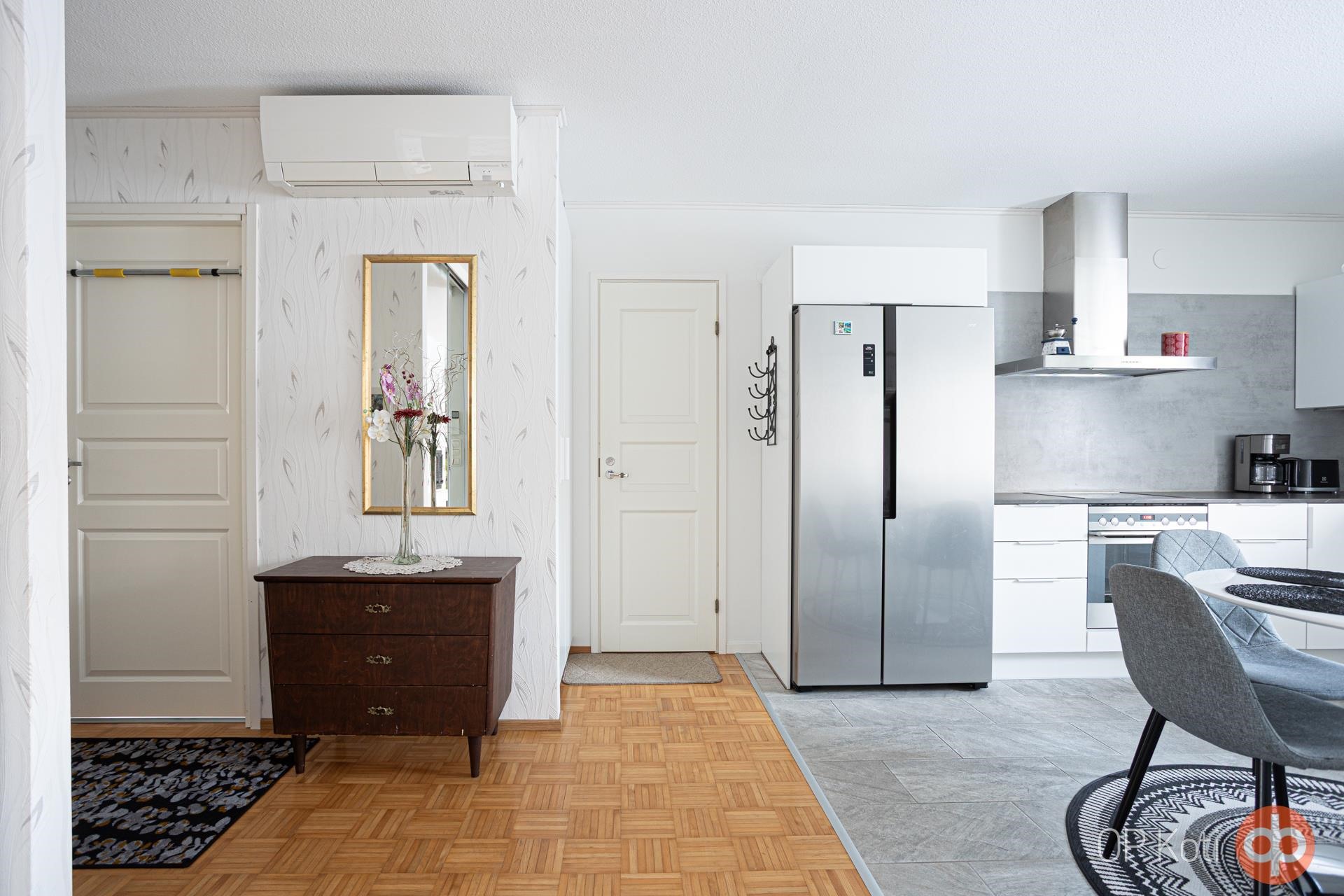 - Jääkaappi rosterinen (2020), pakastekaappi rosterinen (2020), erillisuuni (2015), liesitaso keraaminen (2015), liesikupu (2020), mikroaaltouuni integroitu (2020), astianpesukone integroitu (2020), kaapistot (Puustelli), kiinteät valaisimet. Keittiö remontoitu 10/2020. Samalla uusittu myös kylmäkalusteet, mikro, apk ja liesikupu. Lattipintaan asennettu laatat ja lattialämmitys.