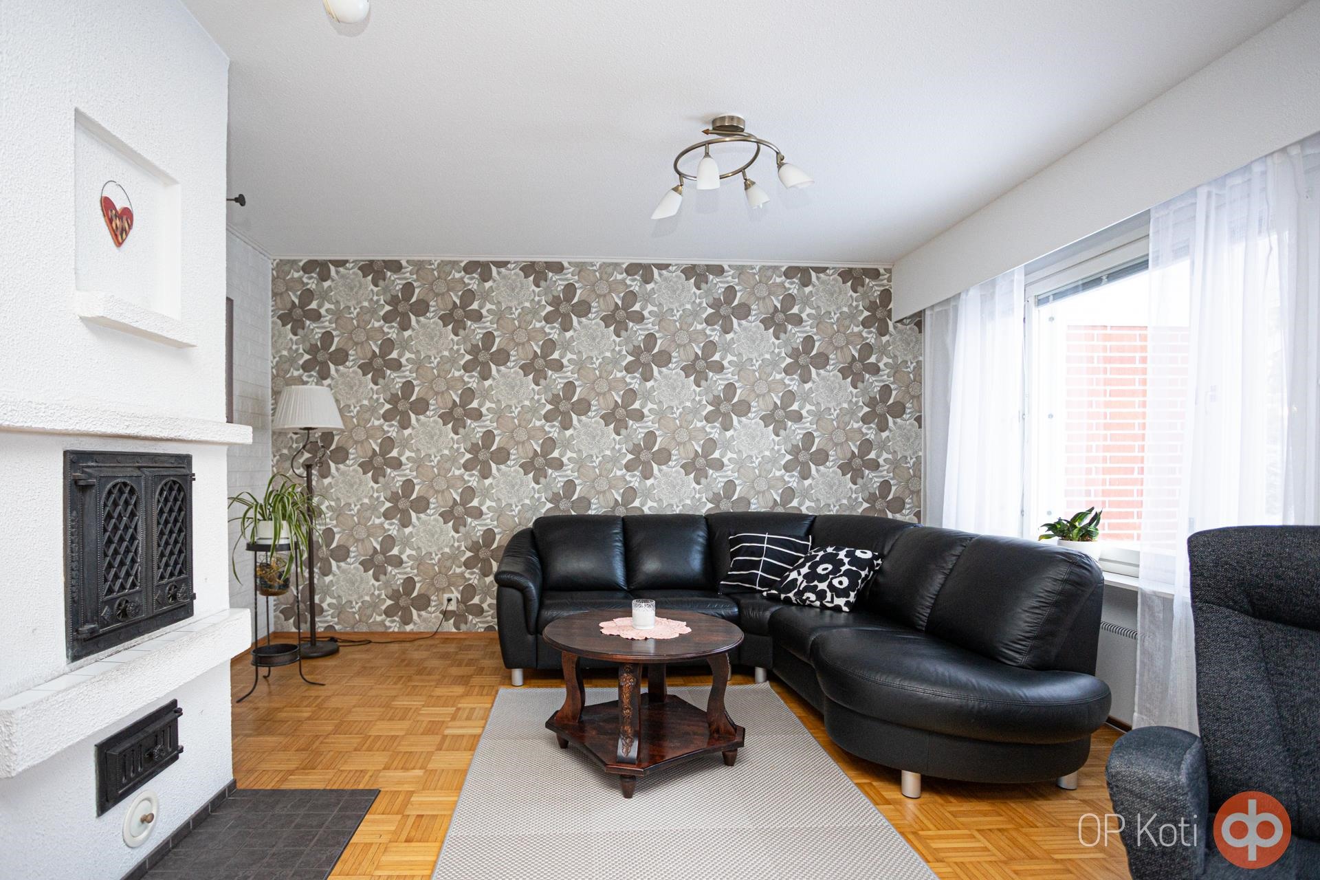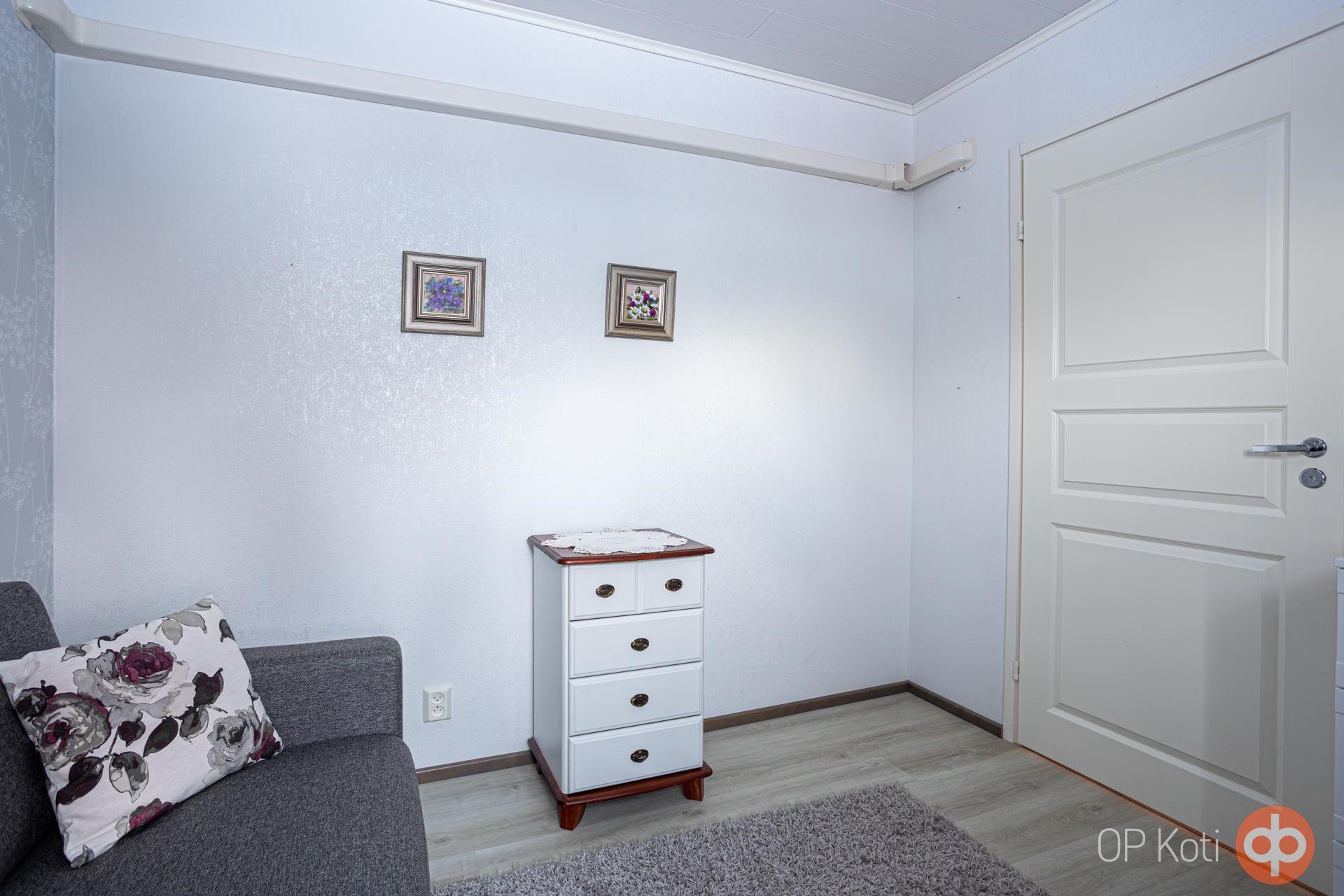 Keittiö: laatta / tapetti ja levy / maali Olohuone: parketti / tapetti ja tiili / maali Makuuhuone 1: parketti / tapetti / maali Makuuhuone 2: vinyylilankku / tapetti / mdf-levy Sauna: laatta / paneeli / paneeli Kylpyhuone: laatta / laatta / kuultomaalattu paneeli Eteinen: parketti / tapetti / maali Wc: laatta / laatta / mdf-levy Ruokailutila: parketti / lasikuitutapetti / maali Pukuhuone/kodinhoitotila: laatta / lasikuitutapetti / maalattu paneeli