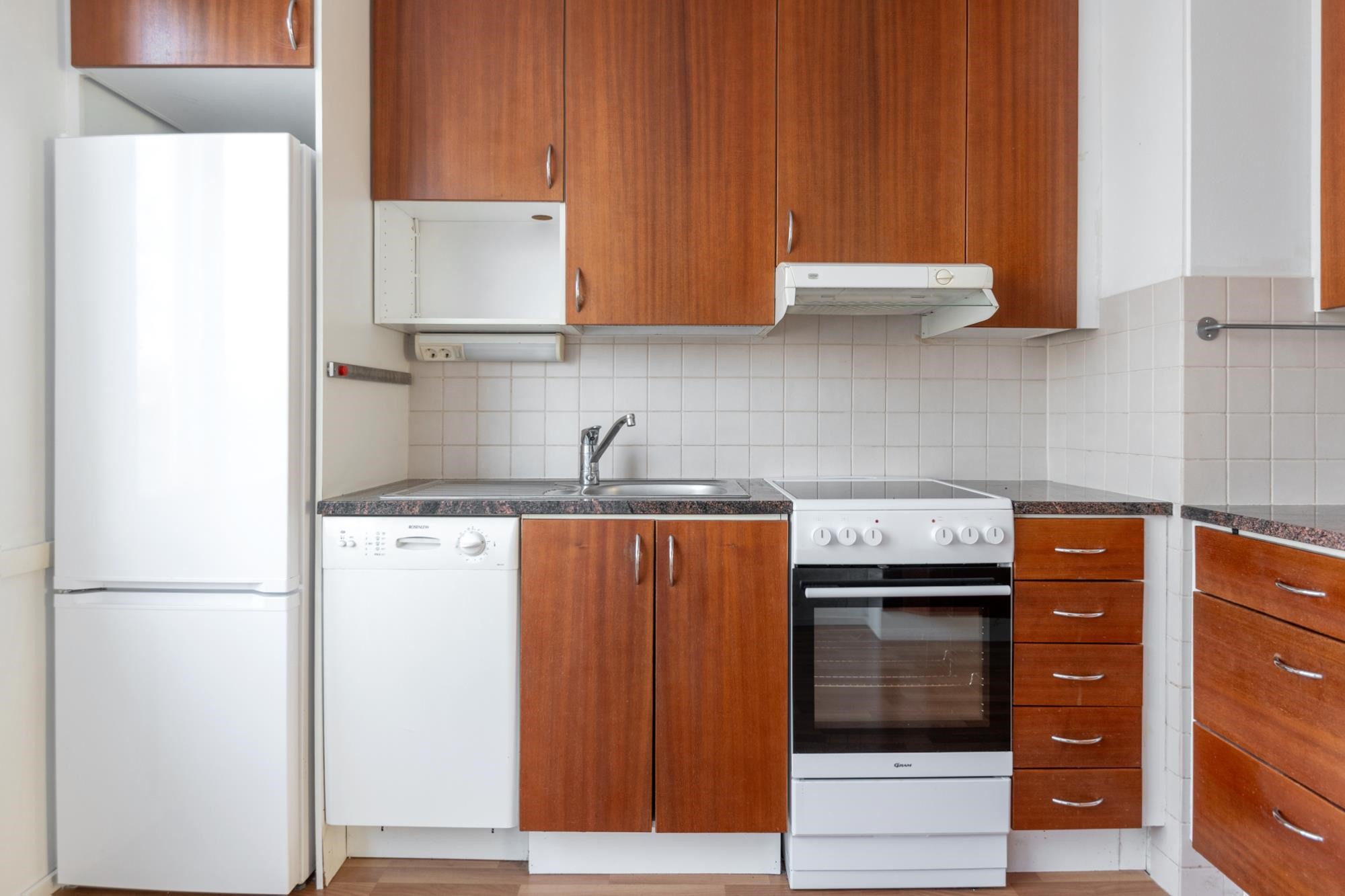 - Jääkaappipakastin, lattialiesi, keraaminen liesi, liesituuletin, astianpesukone, kaapistot.