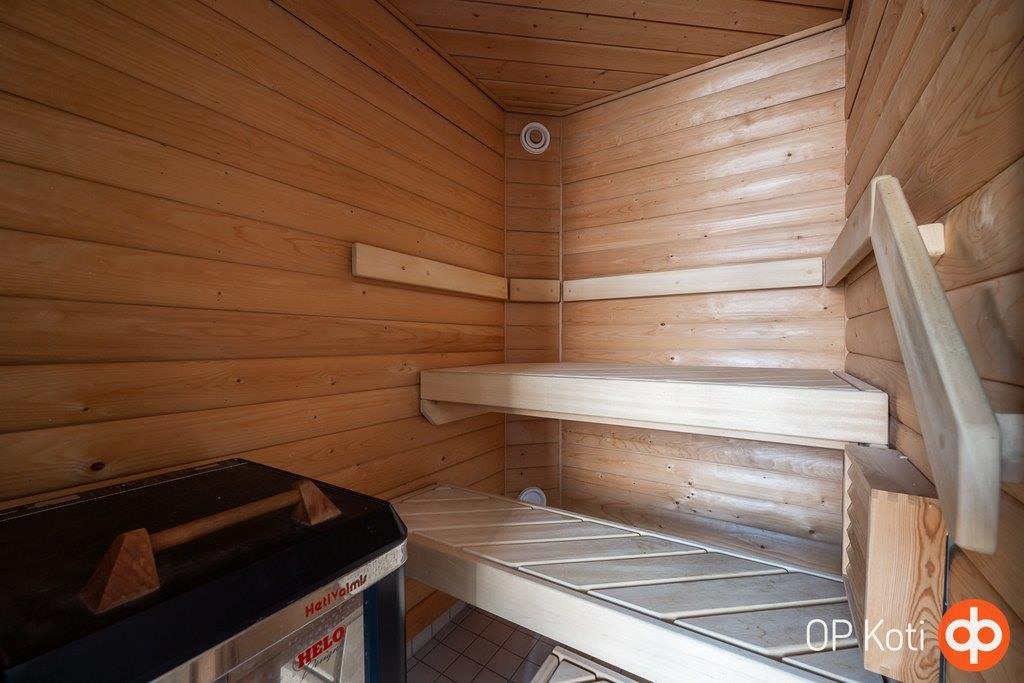 - Sauna, sähkökiuas, kylpyhuone, erillinen wc, suihku, pesukoneliitäntä, kiinteät valaisimet.