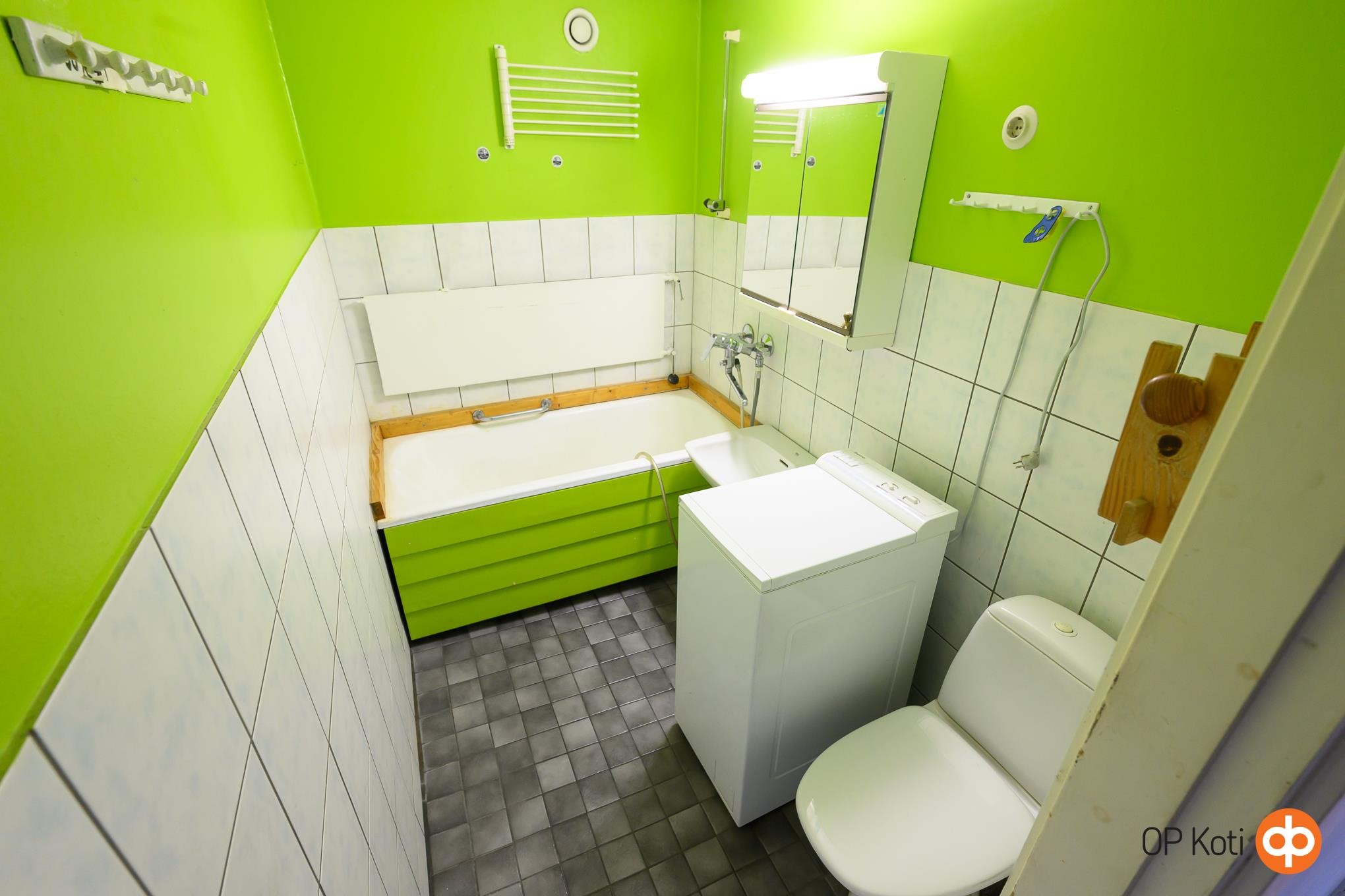 - Kylpyhuone, suihku, amme, peilikaappi, pesukoneliitäntä, kiinteät valaisimet.