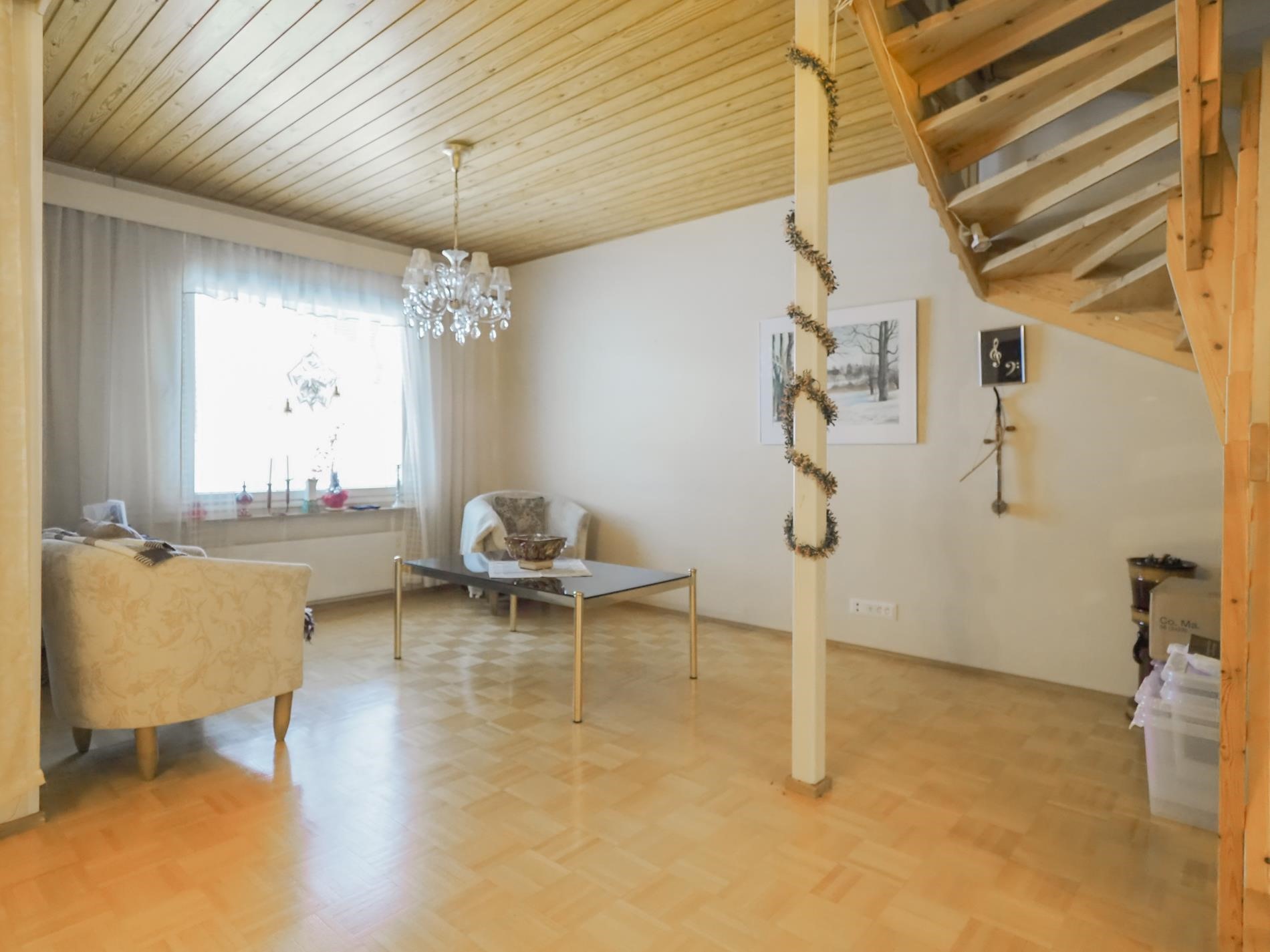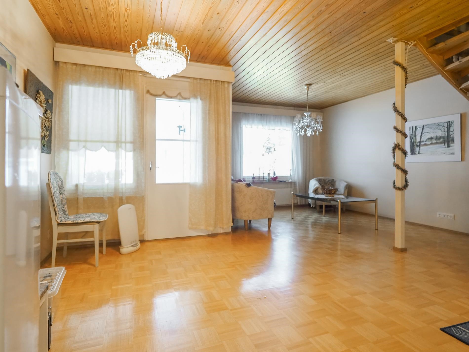 Keittiö: parkettilattia. Olohuone: parkettilattia. Makuuhuone 1: muovilattia. Makuuhuone 2: muovilattia. Sauna: laattalatti. Kylpyhuone: laattalattia. Wc: muovilattia.