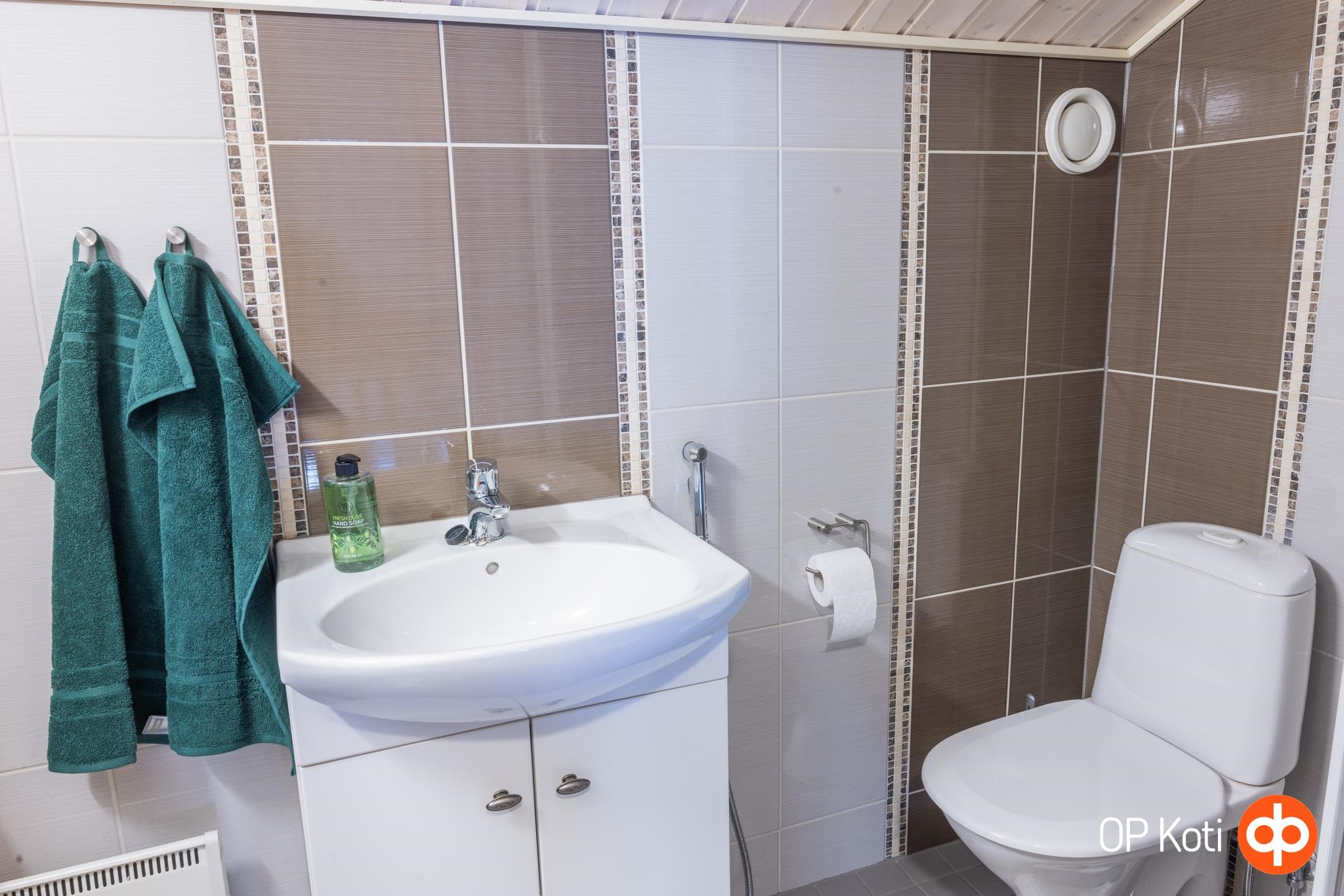 - Sauna, sähkökiuas, kylpyhuone, erillinen wc 2 kpl, suihku alakerta, suihkukaappi yläkerta, peilit, allaskaappi, pesukoneliitäntä, lattialämmitys koko alakerta, kiinteät valaisimet.