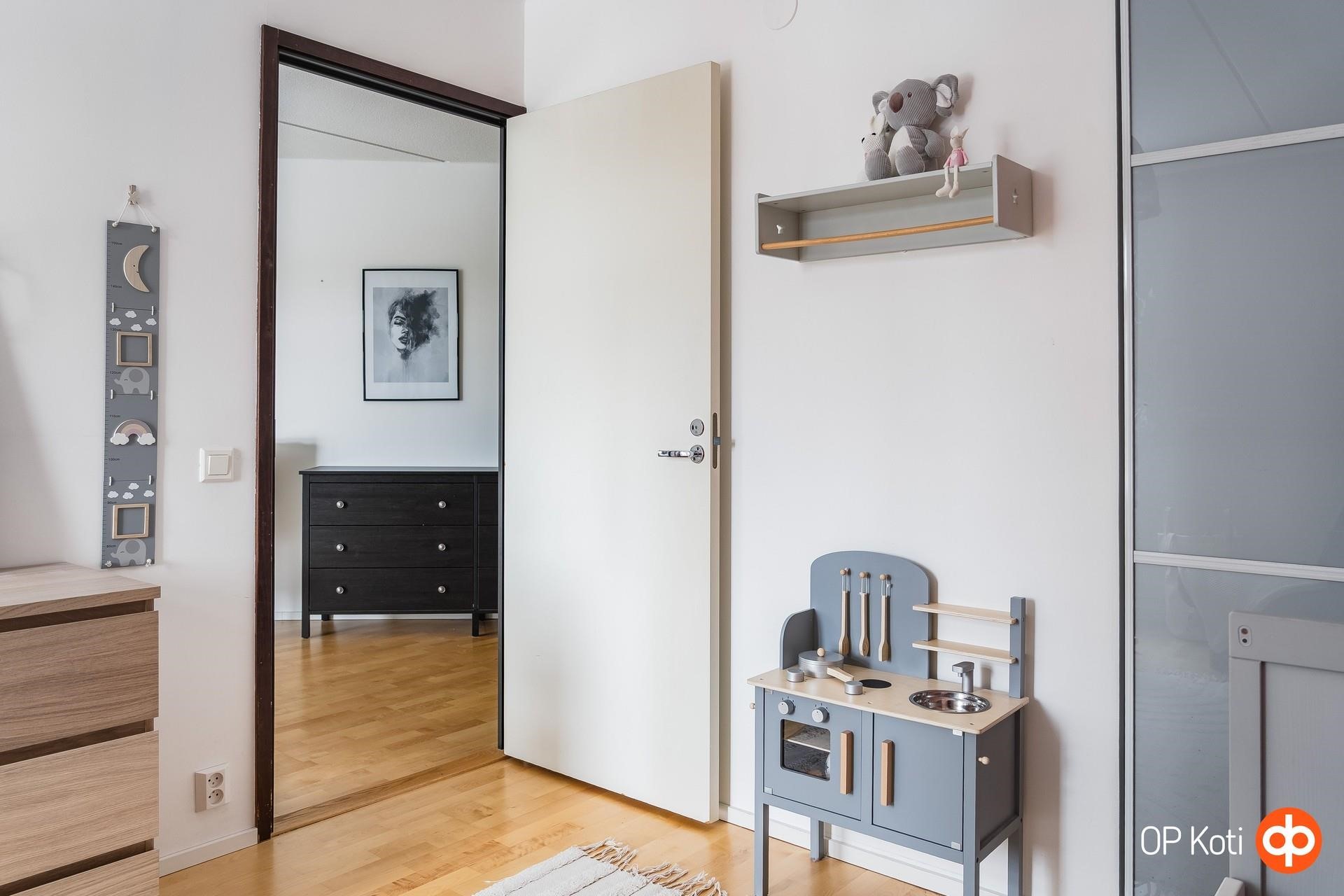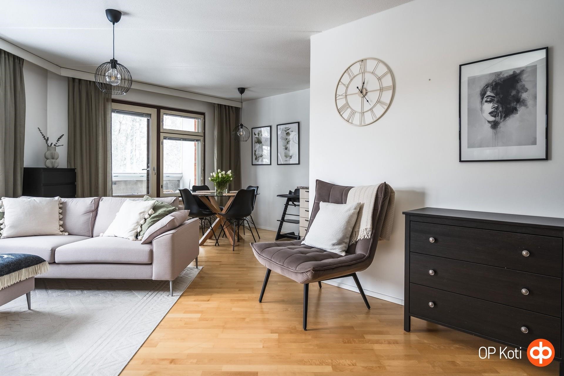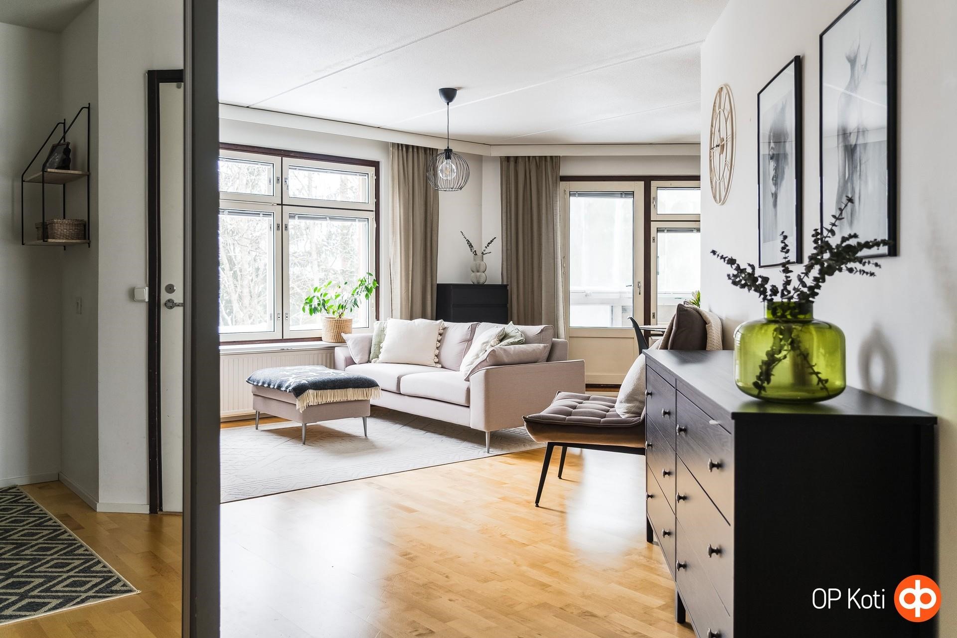 Valo kulkee kauniisti läpi asunnon lounaaseen avautuvien ikkunoiden kautta ja vaaleat pinnat korostavat huoneiston ilmavuutta. Olohuoneen tunnelma on erityisen miellyttävä; tila avautuu luontevasti lasitetulle parvekkeelle, joka toimii kodin lisähuoneena pitkälle syksyyn. Parveke ja sen rauhallinen näkymä puistoon tuovat kotiin välittömän levollisuuden tunteen - kuin oma pieni hengähdyspaikka arjen keskellä.