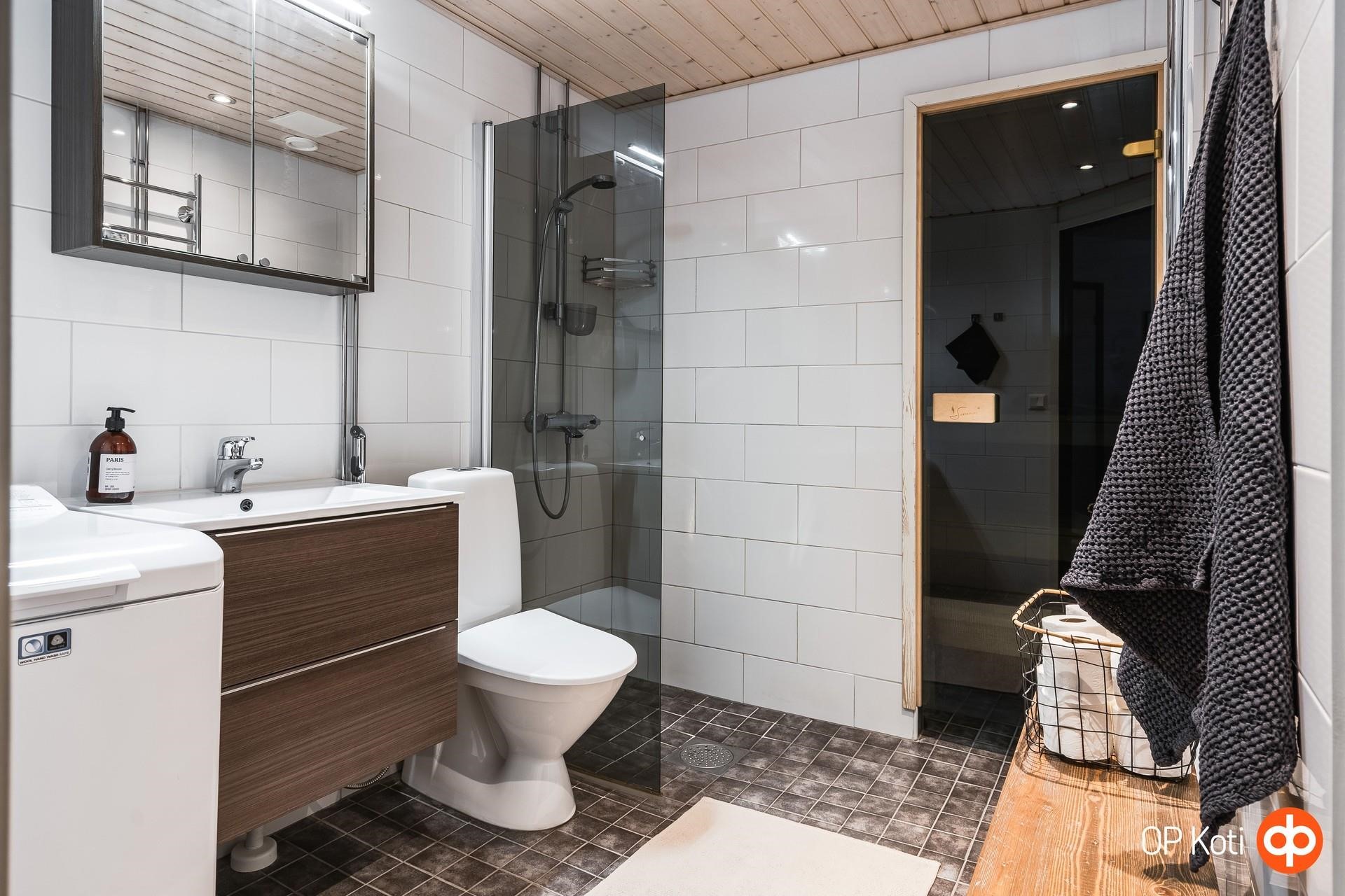 - Tyylikäs kylpyhuone ja oma sauna - arjen luksusta Rentoudu omassa saunassa, jossa sähkökiuas takaa pehmeät löylyt. Kylpyhuoneessa on moderni suihku ja lasinen suihkuseinä, jotka tuovat tilaan avaruutta ja raikkautta. Käytännöllisyyttä lisäävät peili- ja allaskaapit, jotka tarjoavat runsaasti säilytystilaa. Pesukoneliitäntä tekee arjesta sujuvaa, ja kiinteät valaisimet viimeistelevät tilan toimivuuden ja tunnelman.