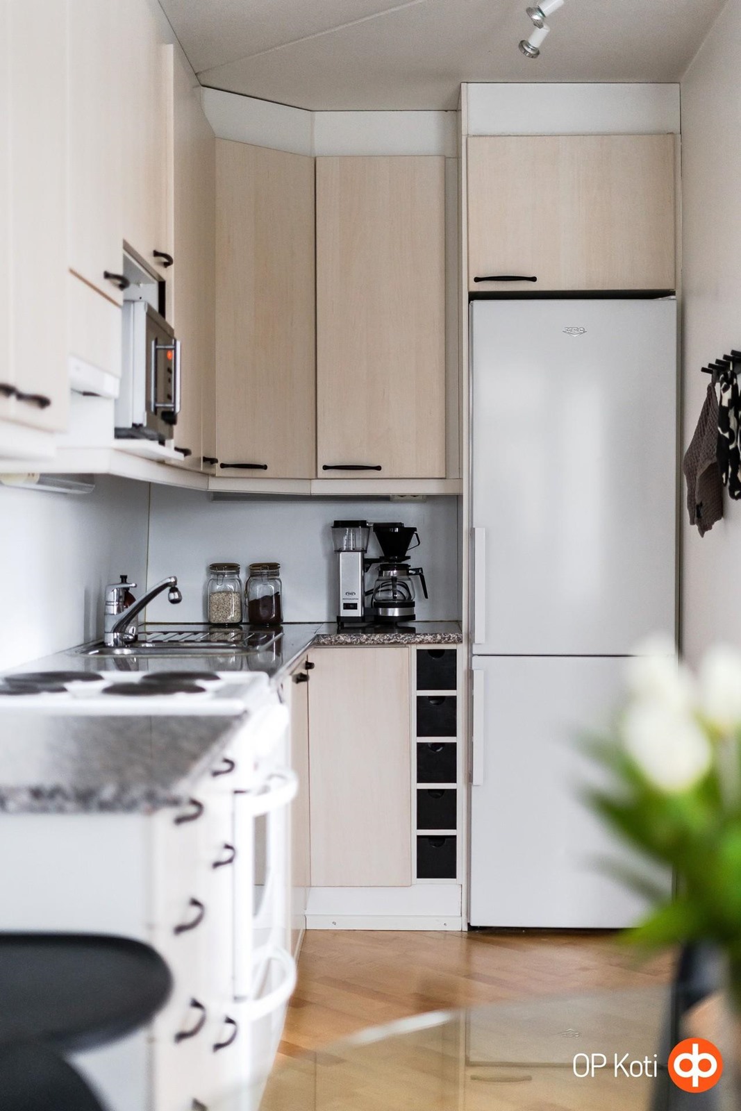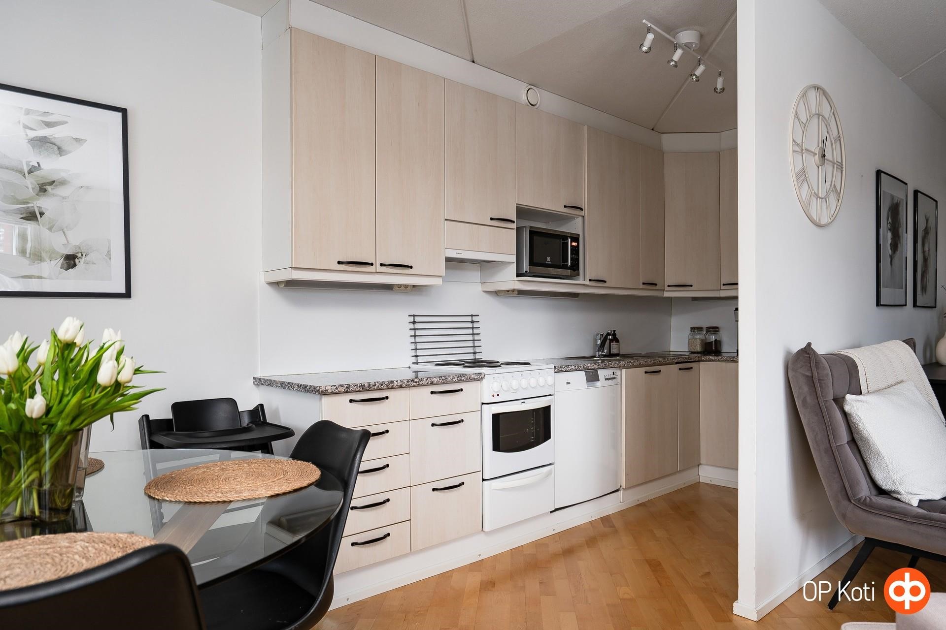 - Keittiö varusteltu arjen helppouteen ja mukavuuteen: Tilava jääkaappipakastin säilyttää tuoreet raaka-aineet, sähköliesi ja tehokas liesituuletin tekevät ruoanlaitosta vaivatonta. Astianpesukone hoitaa tiskit puolestasi ja kaapistot tarjoavat runsaasti säilytystilaa. Kiinteät valaisimet viimeistelevät kokonaisuuden ja luovat viihtyisän tunnelman.