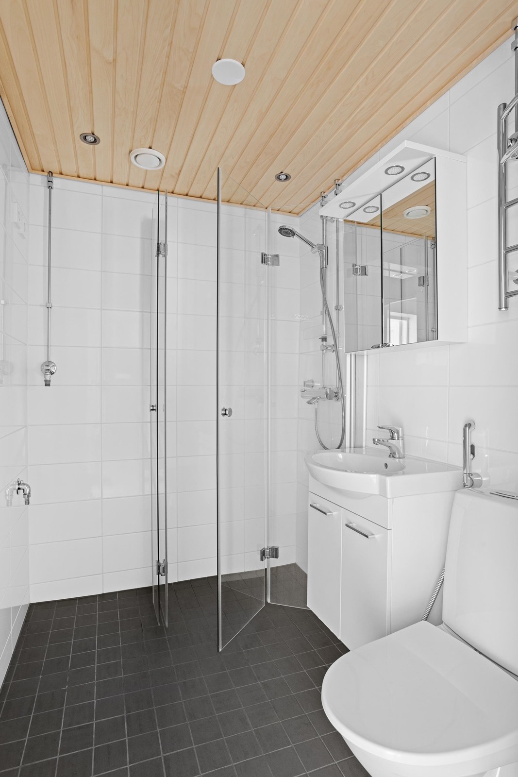 - Kylpyhuone, suihku, suihkuseinä, peilikaappi, allaskaappi, pesukoneliitäntä, lattialämmitys, kiinteät valaisimet.