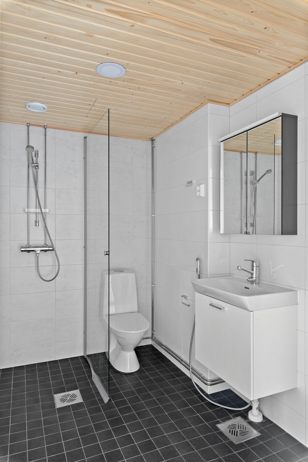 - Kylpyhuone, suihku, suihkuseinä, peilikaappi, allaskaappi, pesukoneliitäntä, lattialämmitys, kiinteät valaisimet.