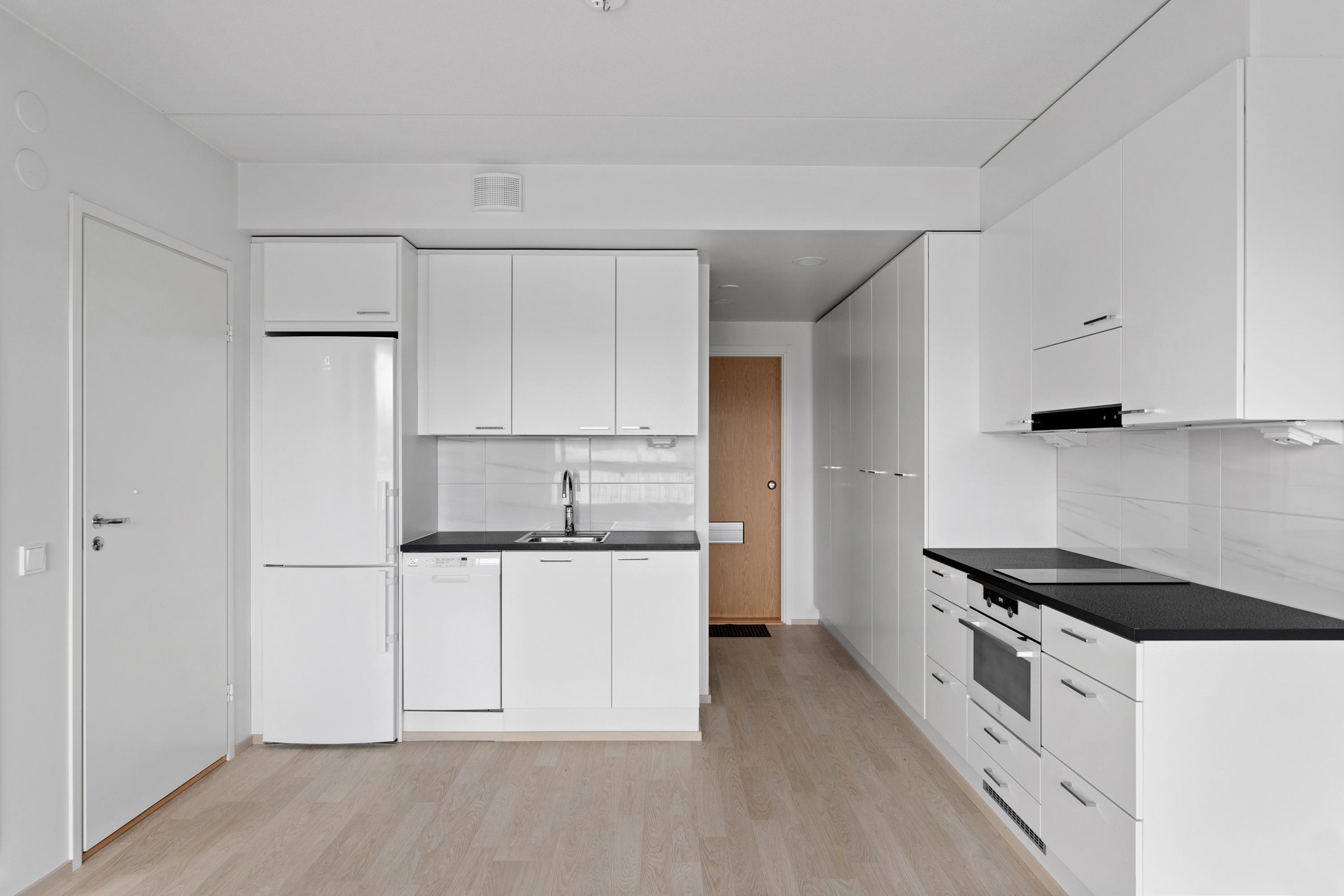 - Jääkaappipakastin, erillisuuni (hybridimalli toimii myös mikrona), keraaminen liesi, liesituuletin, astianpesukone, kaapistot, kiinteät valaisimet.