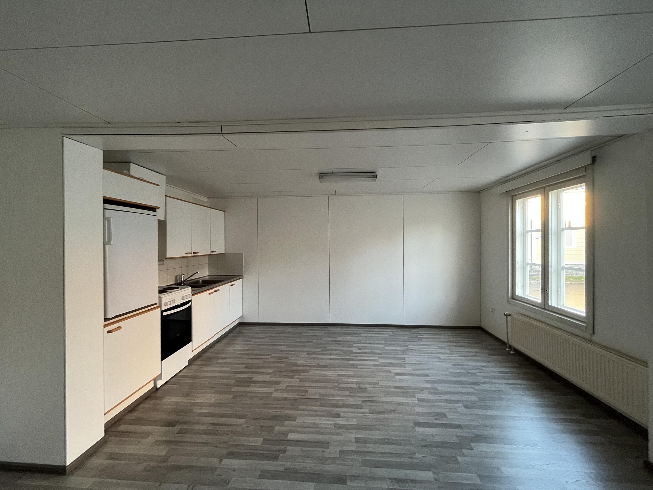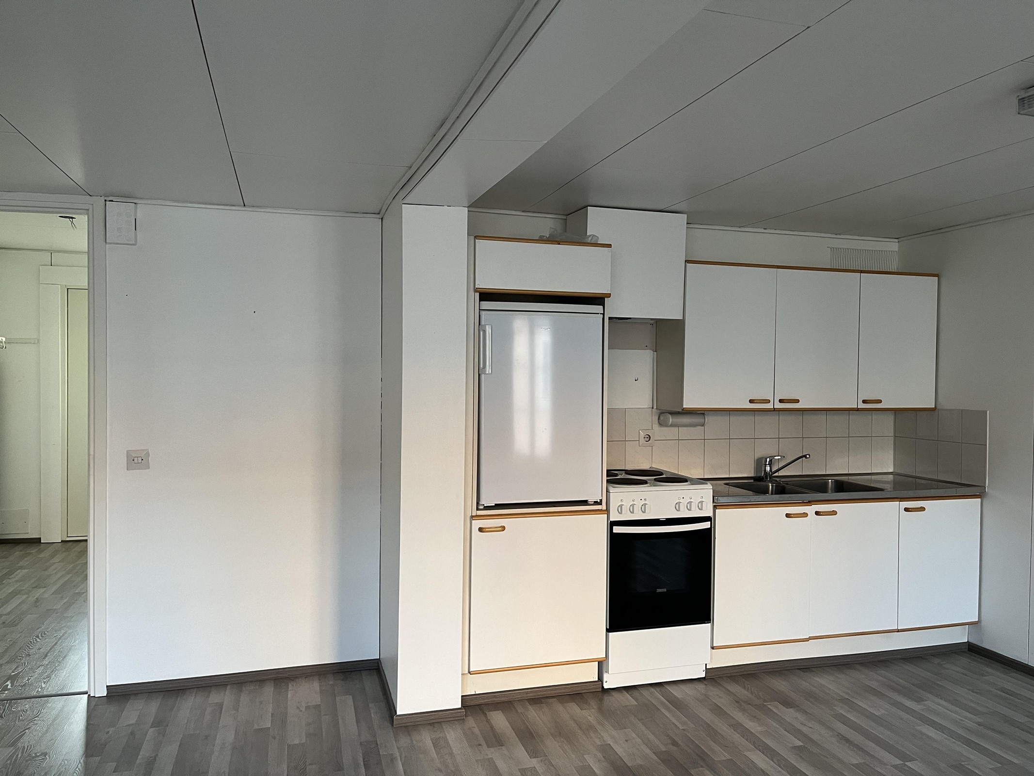 - Jääkaappi pakastelokerolla, lattialiesi, kaapistot, kiinteät valaisimet.