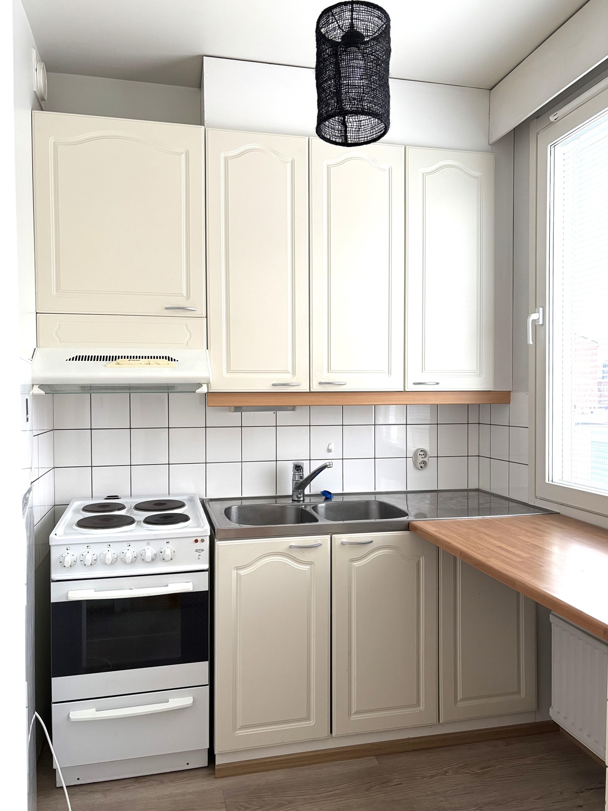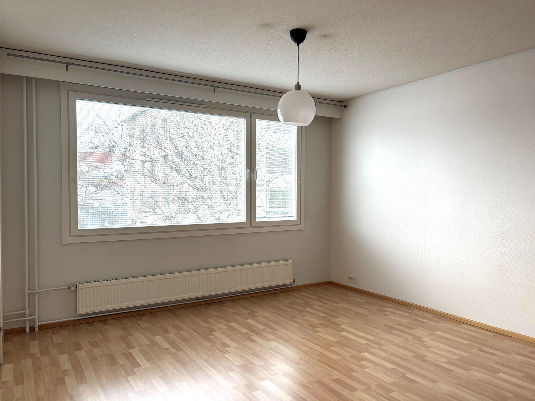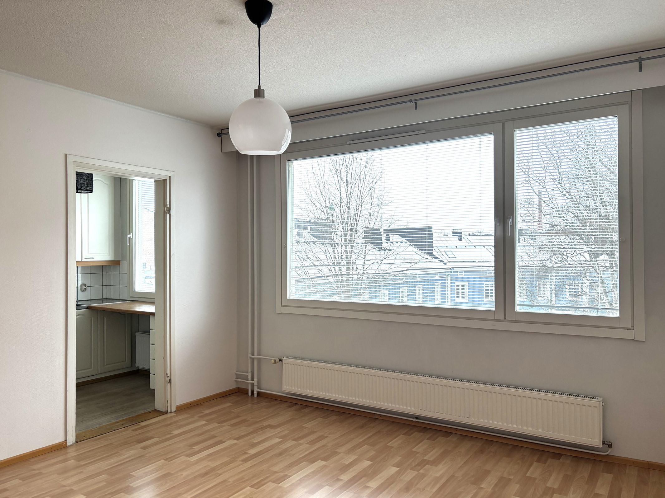 Keittiö, olohuone ja eteinen: Laminaattilattia, maalatut seinät. Kylpyhuone: Laatoitettu lattia ja seinät.