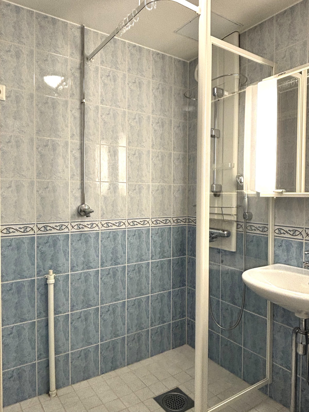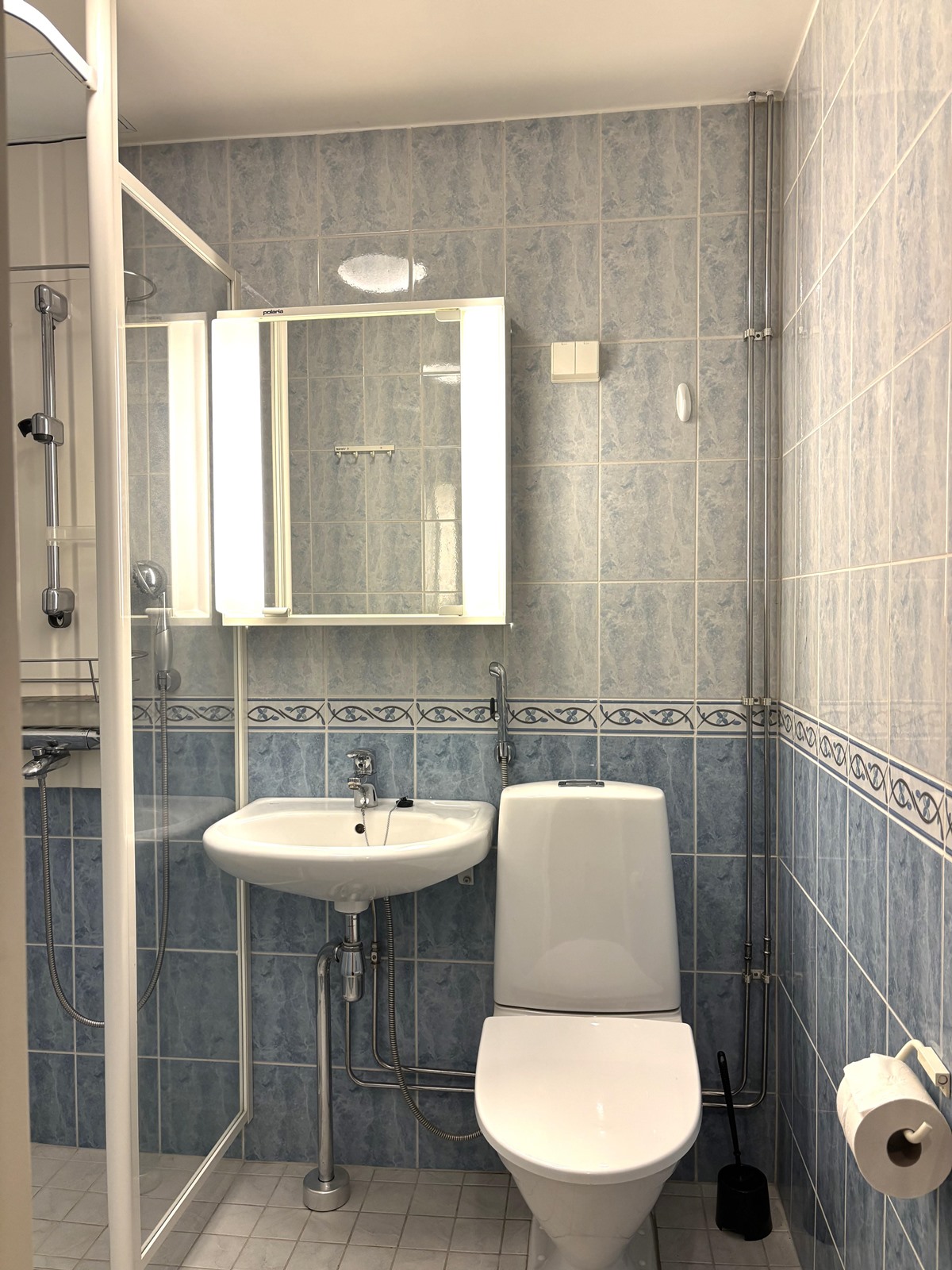 - Kylpyhuone, suihku, suihkuseinä, peilikaappi, pesukoneliitäntä, kiinteät valaisimet.