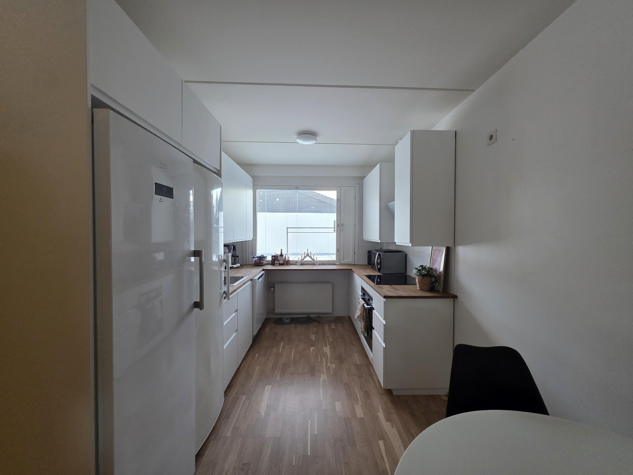 Asunnossa on tilava pohjaratkaisu. Keittiö on varustettu moderneilla ja valkoisilla kaapistoilla sekä puutasoilla, mikä tuo tyylikkyyttä arjen ruoanlaittoon. Iso jääkaappi ja erillinen pakastin tarjoavat runsaasti säilytystilaa. Kylpyhuoneessa on suihku, lattialämmitys ja pesukoneliitäntä. Huoneiston varustelu on hyvä, ja ulkovarasto asunnon edessä tuo lisätilaa säilytystarpeisiin.