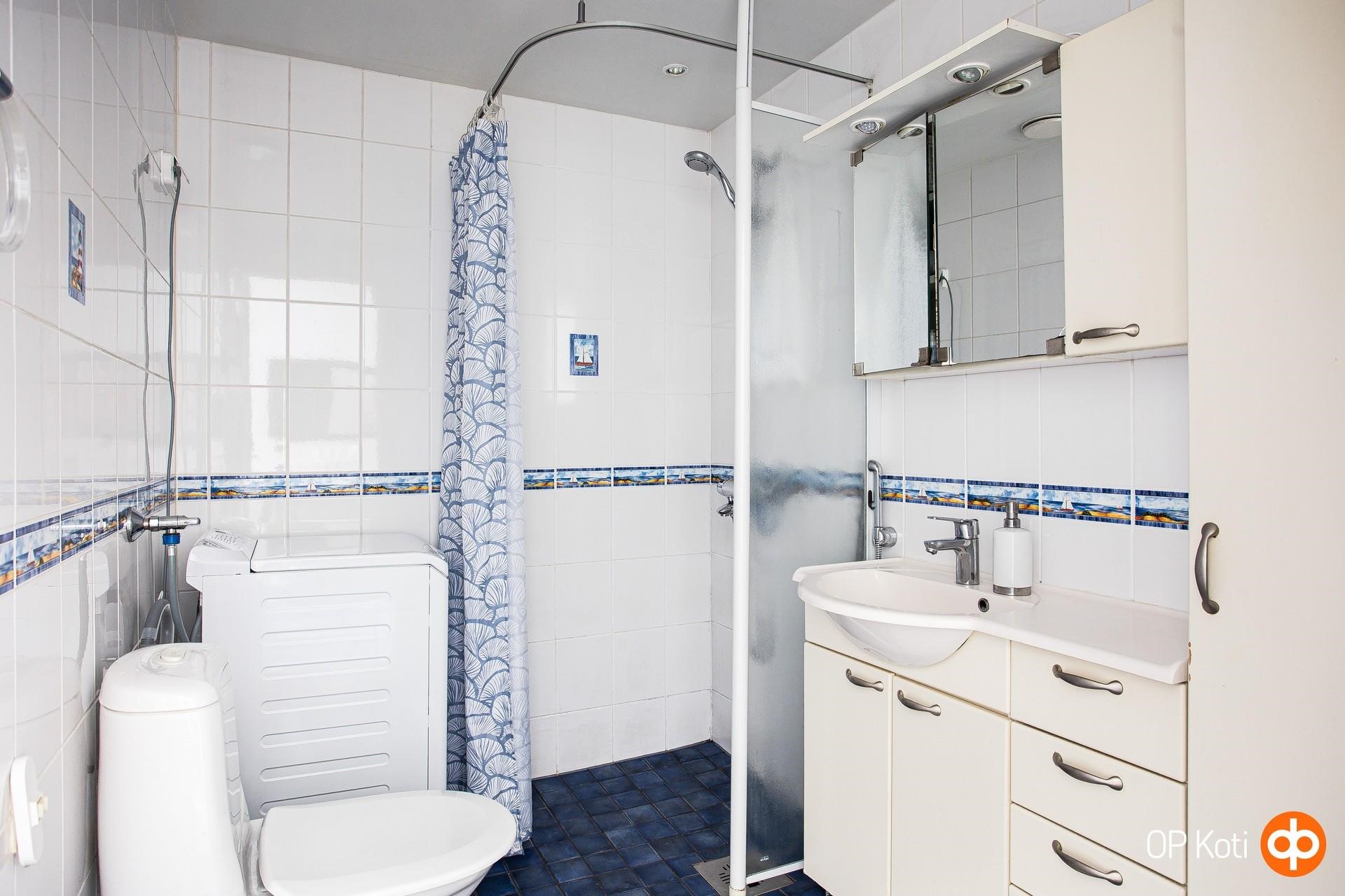 - Kylpyhuone, suihku, suihkuseinä, peilikaappi, kaapit, allaskaappi, pesukoneliitäntä, lattialämmitys. Remontoitu n. 2000-luvun alussa.