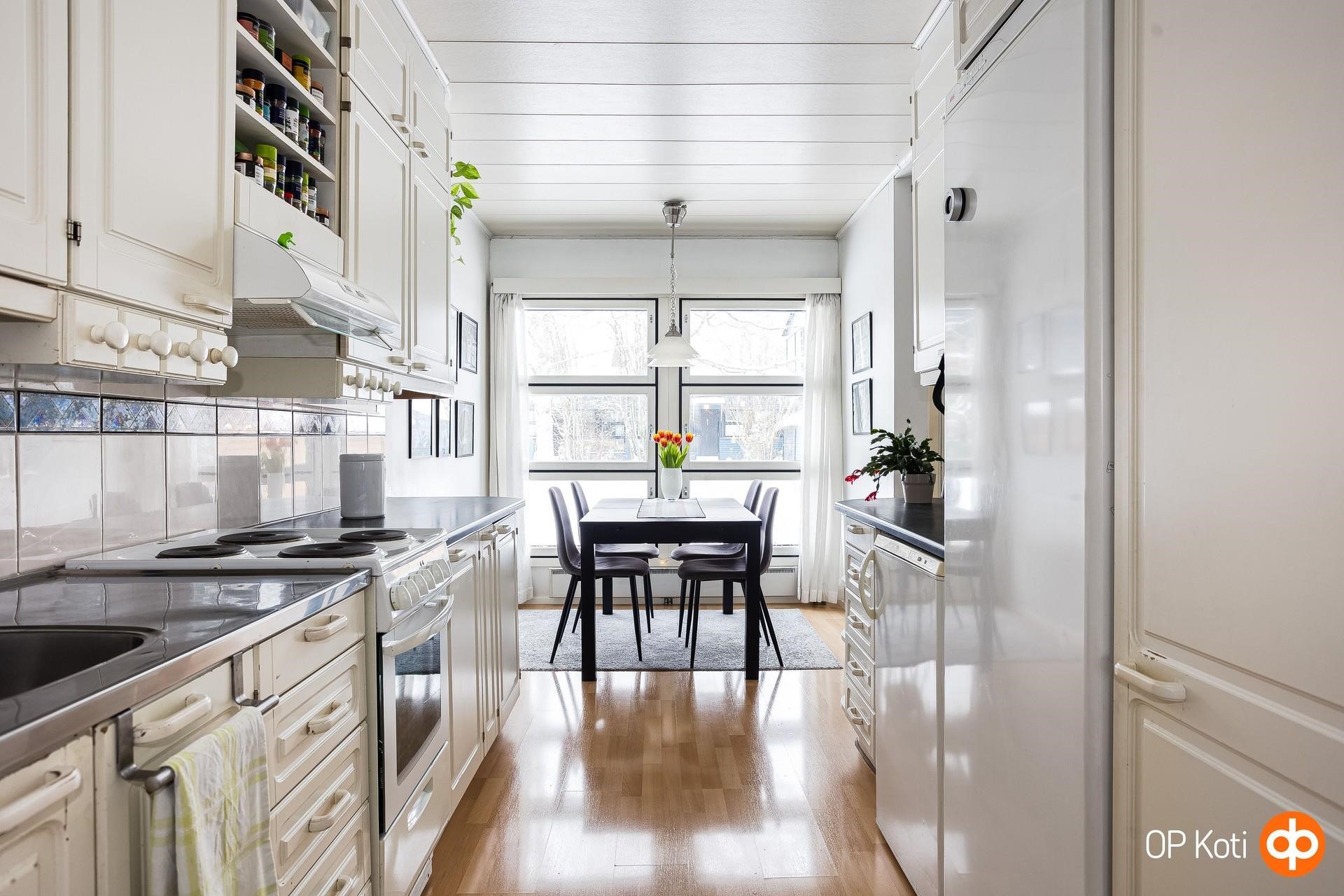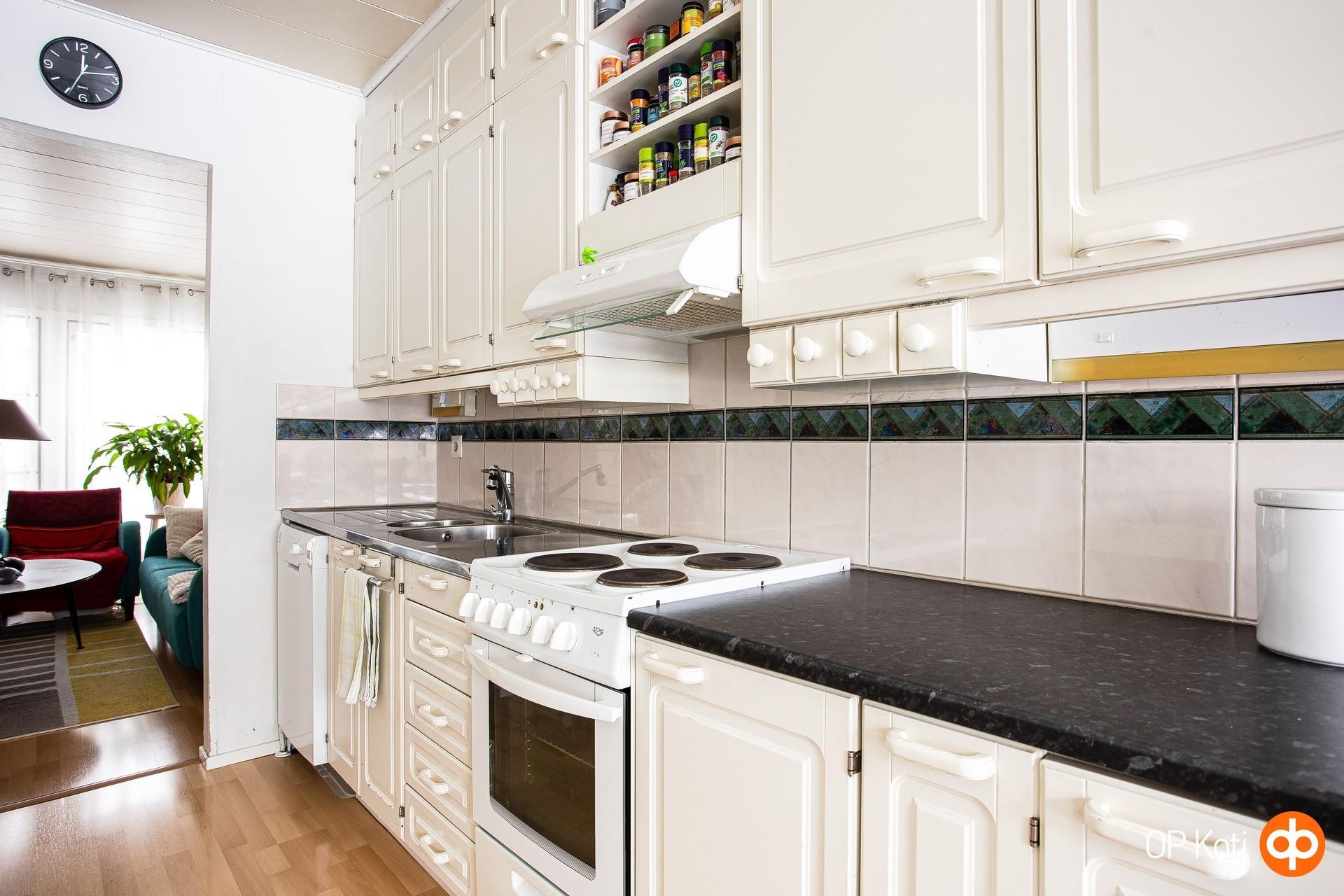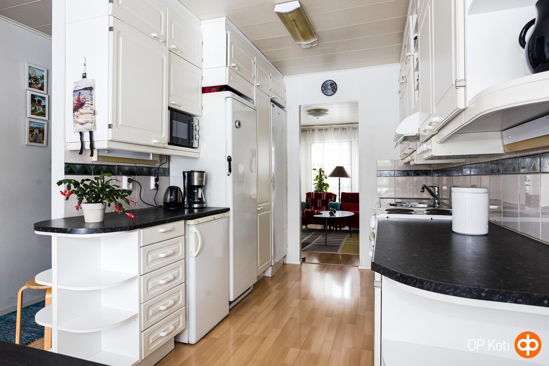 - Jääkaappi Täyskorkea, pakastekaappi, sähköliesi, liesituuletin uusittu 2020, astianpesukone uusittu 2024 (leveys 50 cm), kaapistot.