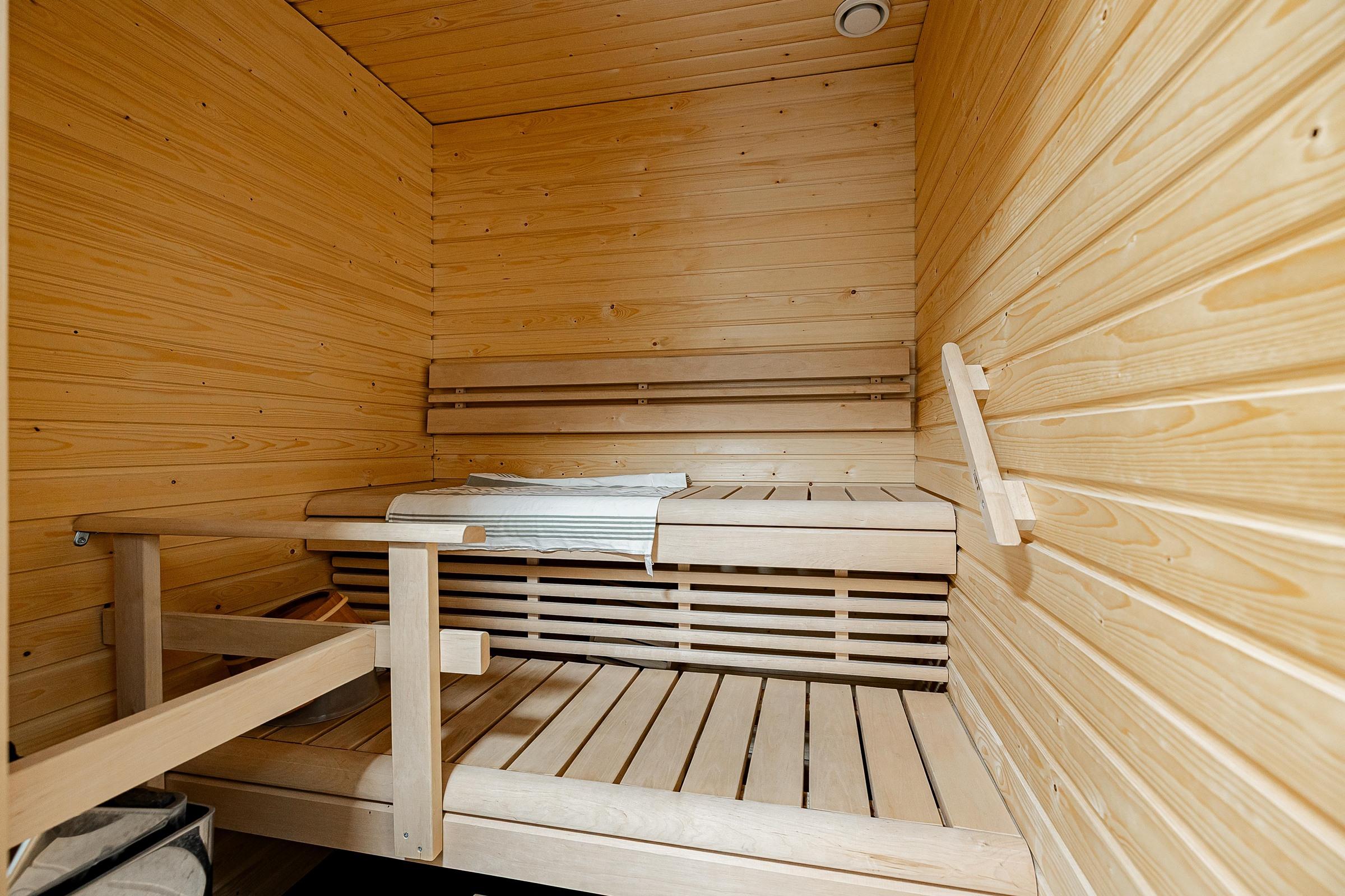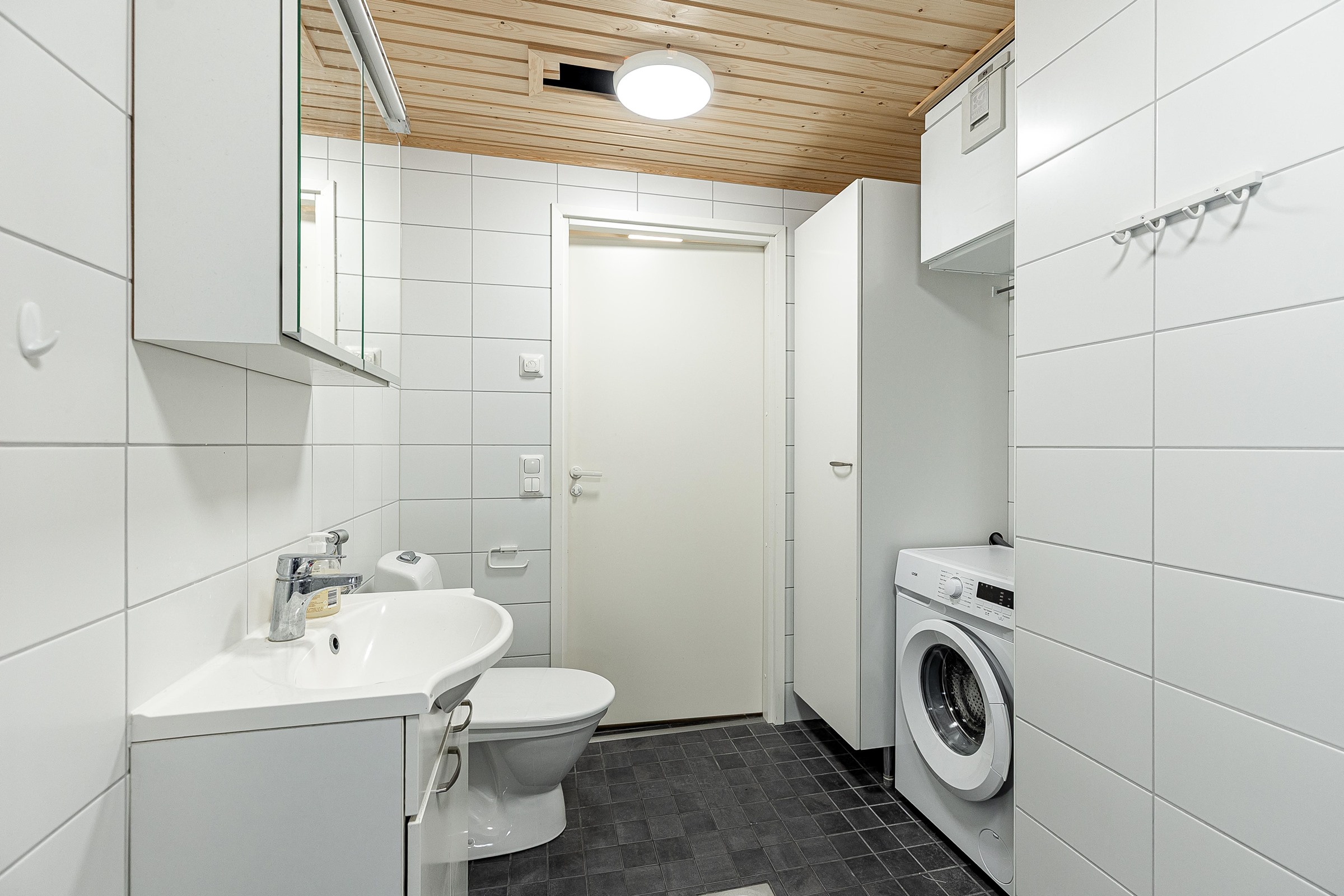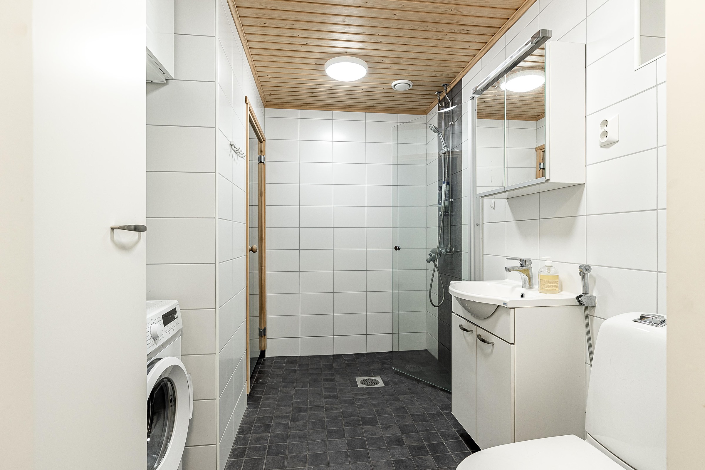 - Sauna, sähkökiuas, kylpyhuone, suihku, suihkuseinä, peilikaappi, allaskaappi, pesukoneliitäntä, lattialämmitys, kiinteät valaisimet.
