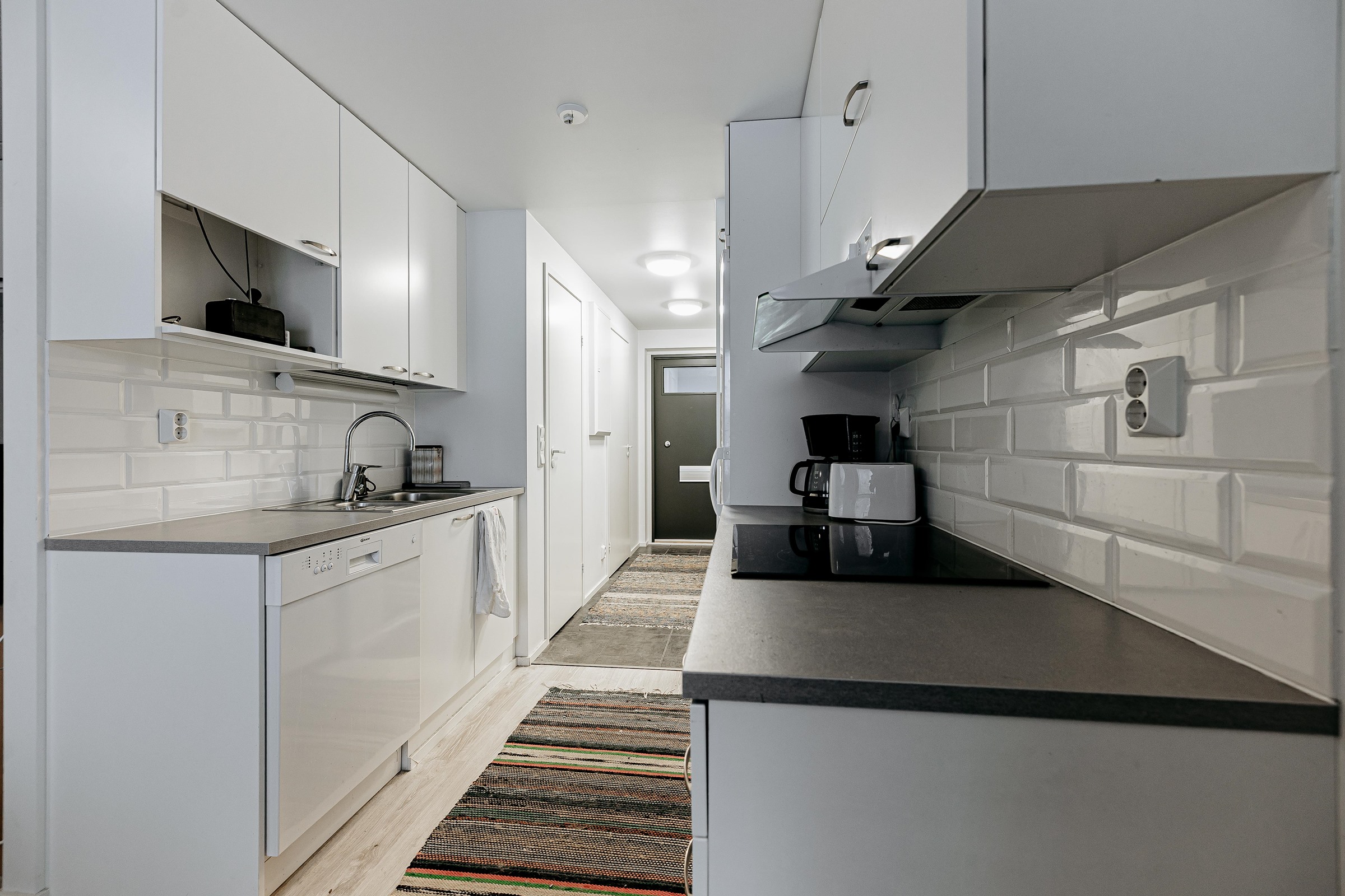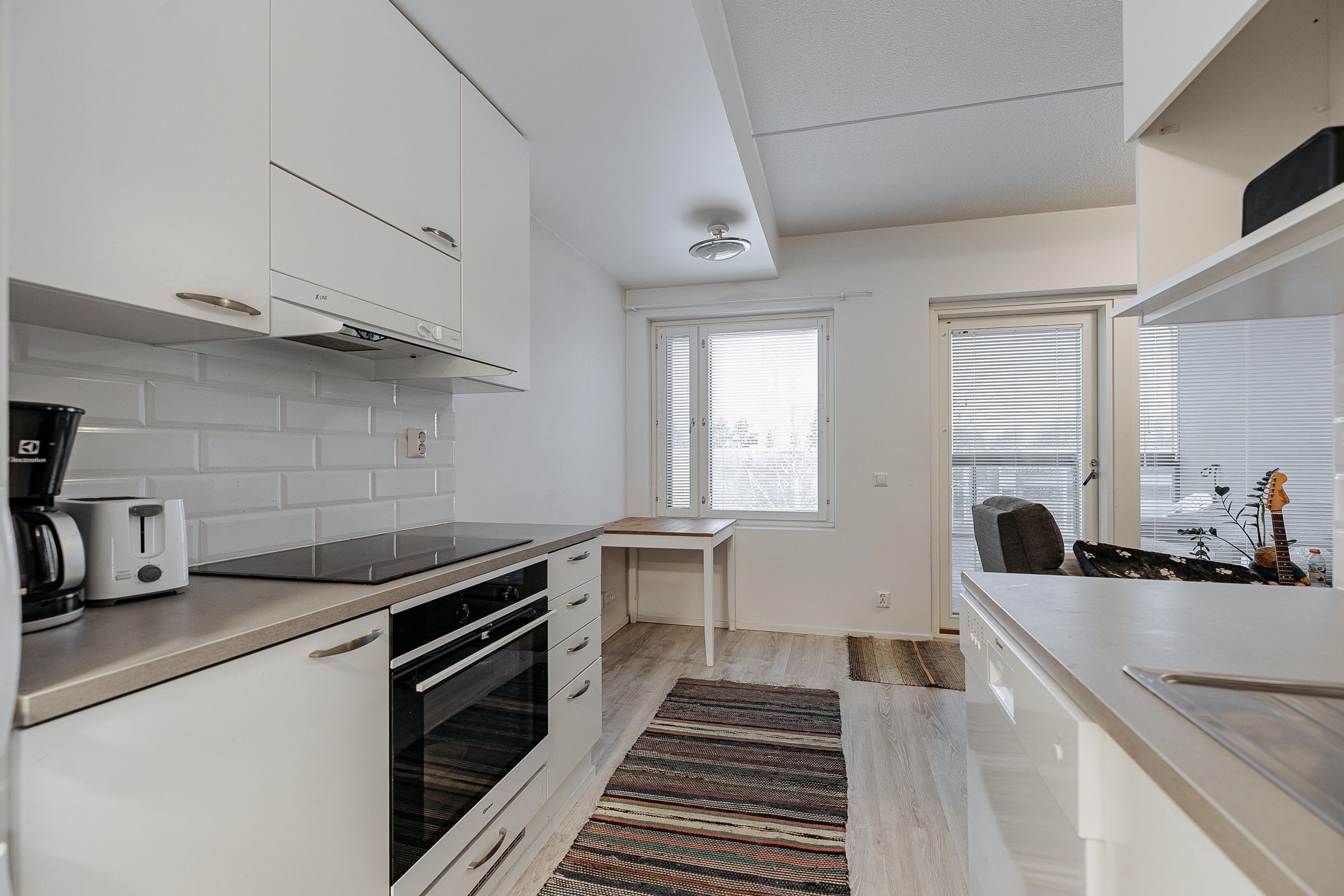 - Jääkaappipakastin, erillisuuni, induktioliesi, liesituuletin, astianpesukone, kaapistot, kiinteät valaisimet.