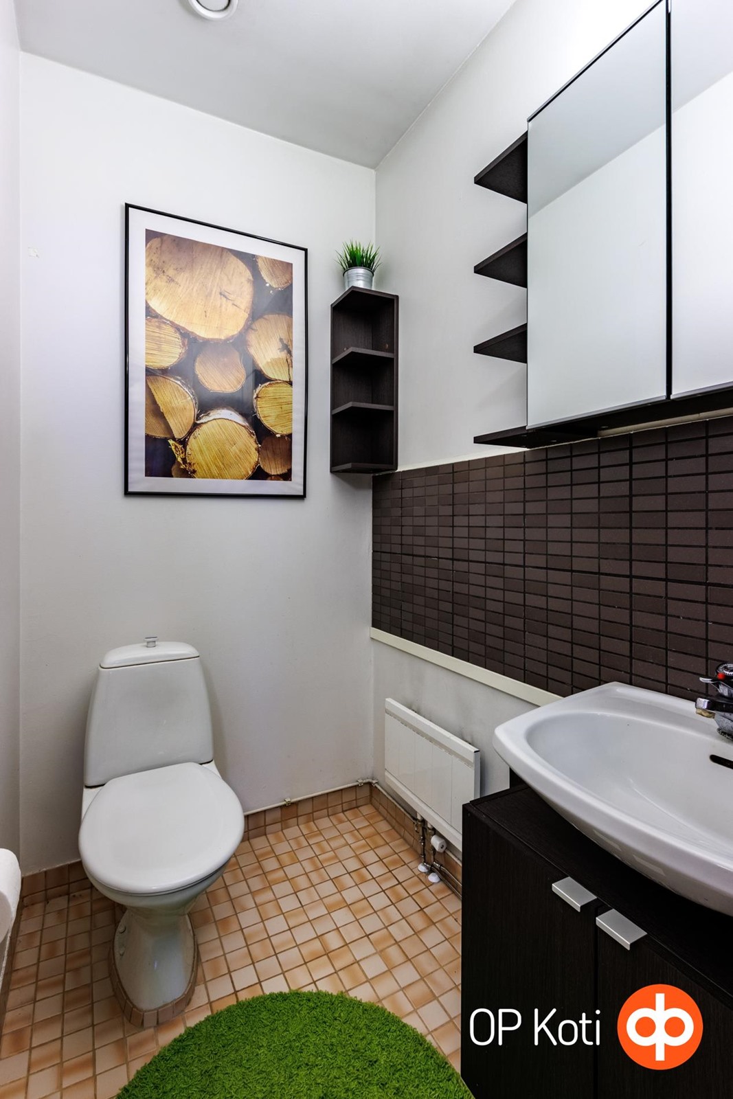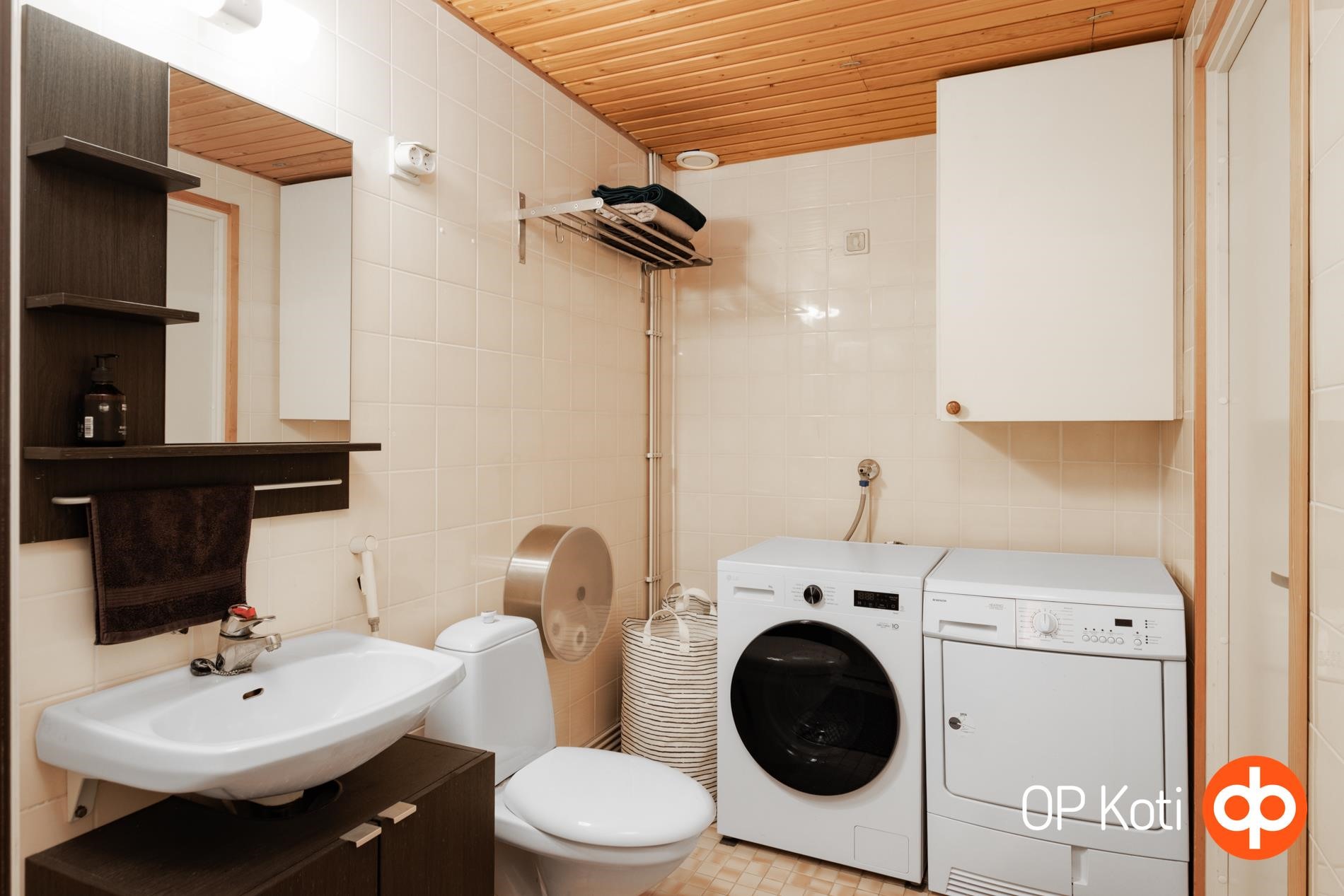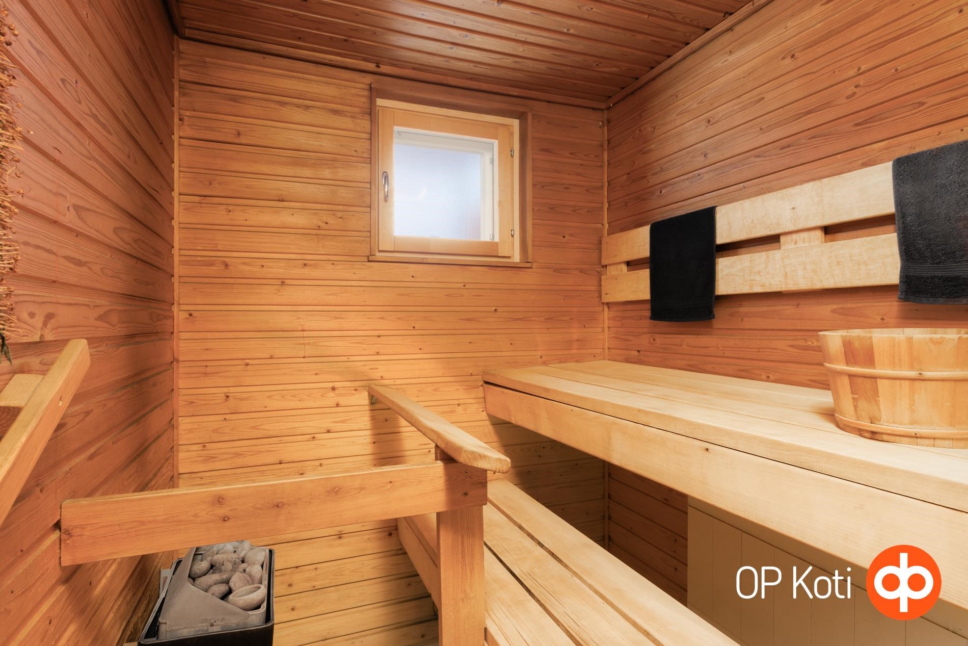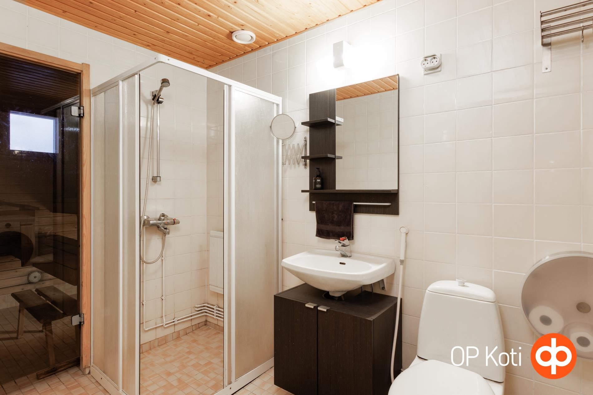 - Sauna, sähkökiuas, erillinen wc, suihku, suihkuseinä, peilit, peilikaappi, kaapit, allaskaappi, pesukoneliitäntä, kiinteät valaisimet.