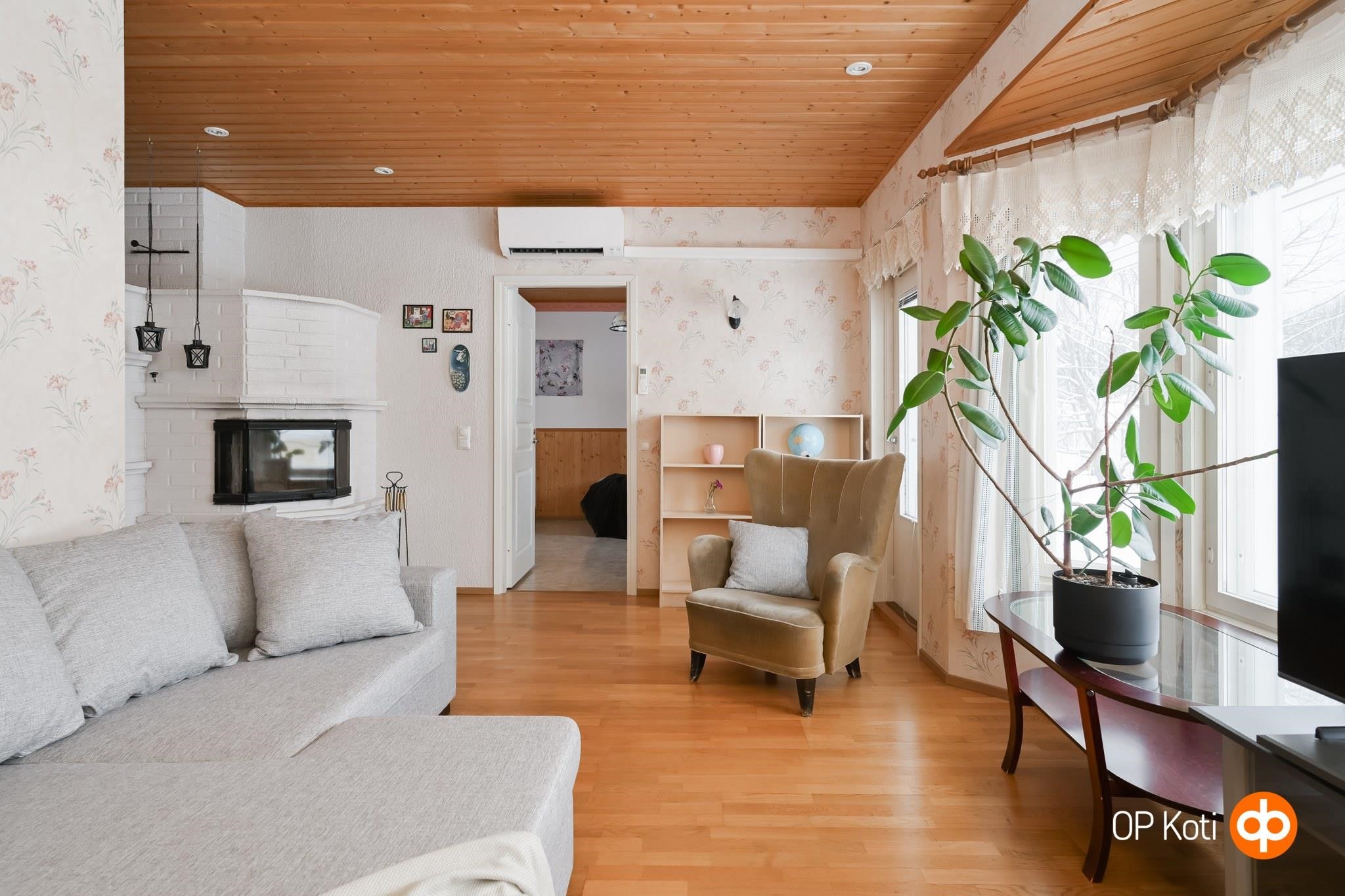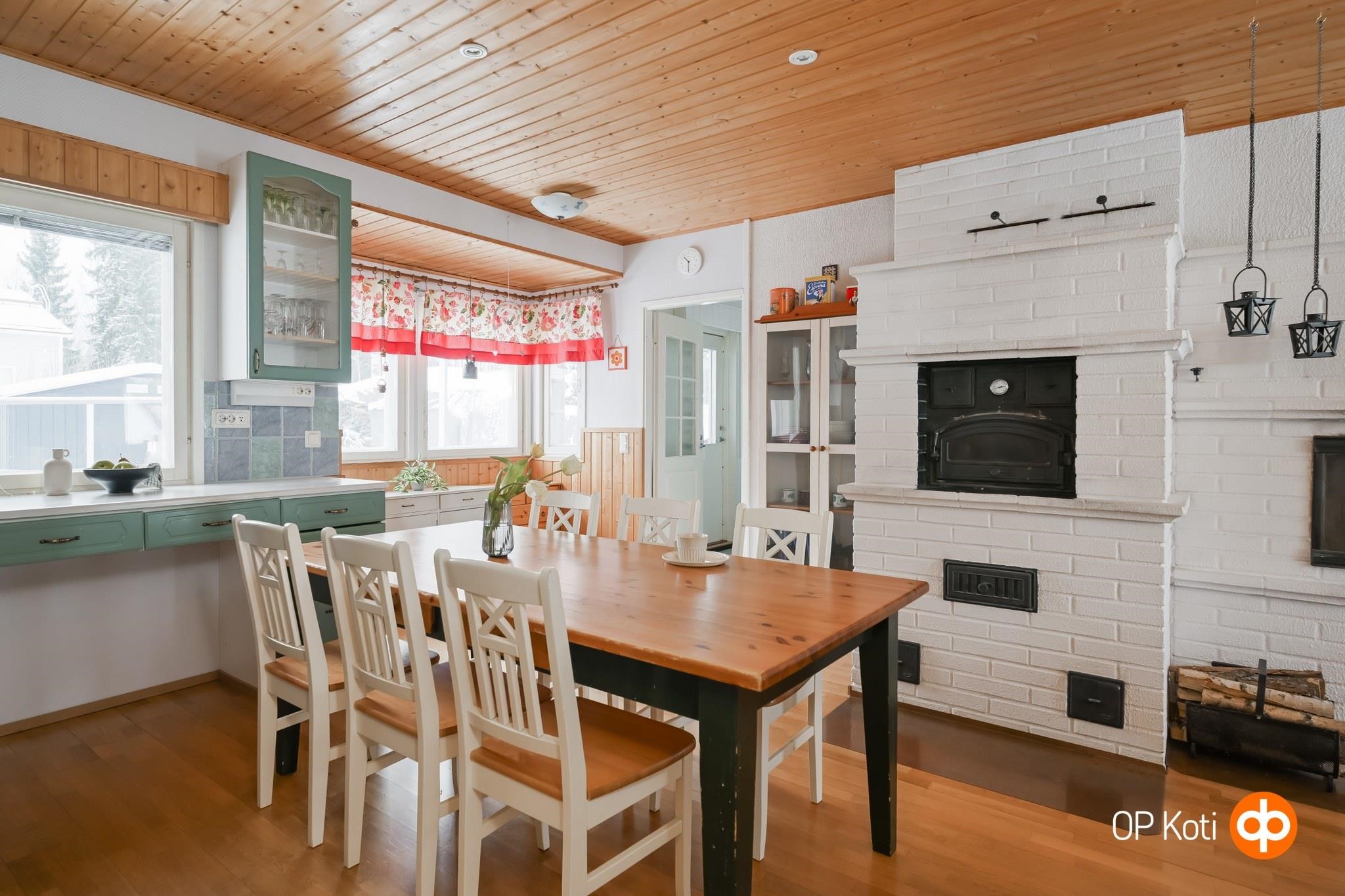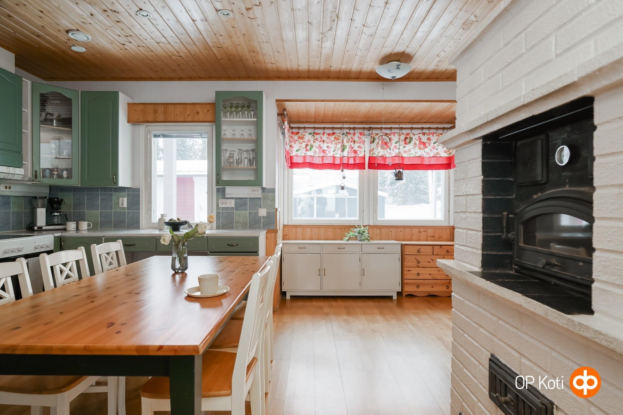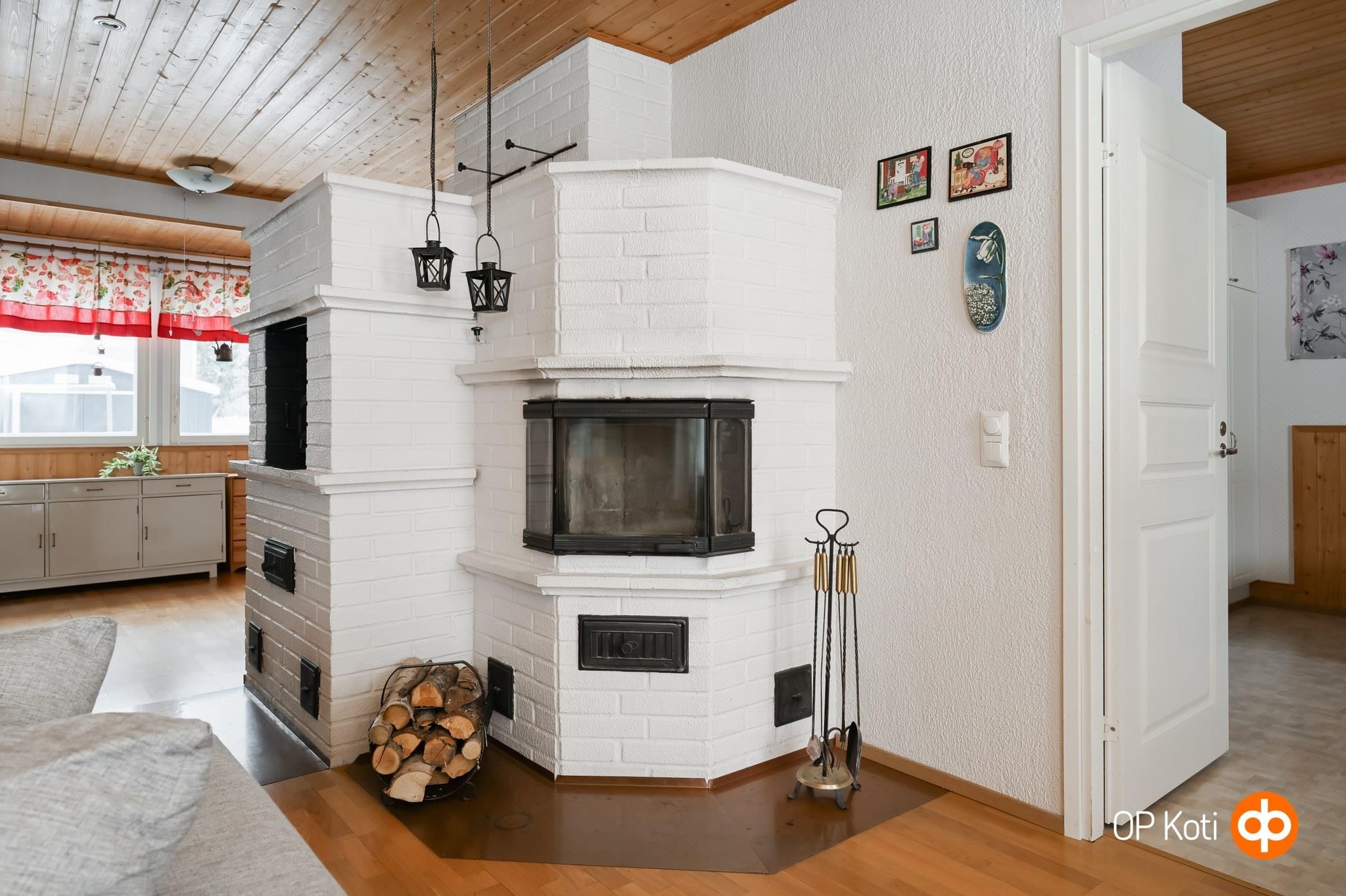 Sanalla sanoen kodikas, sitä tämä koti on. Eteisestä avautuu näkymä olohuonetilaan, johon isot ikkunat tuovat runsaasti luonnonvaloa. Varaava tulisija tuo kotoisaa lämpöä ja avustaakin hyvin lämmityskustannuksissa. Keittiö on poikkeuksellisen tilava ja täälläkin on tulisija. Reilun kokoisia makuuhuoneita on kaikkiaan kolme. Lisäksi löytyy pesutilojen yhteydestä aina tarpeellinen kodinhoitohuone, joka toimii myös pukutilana.