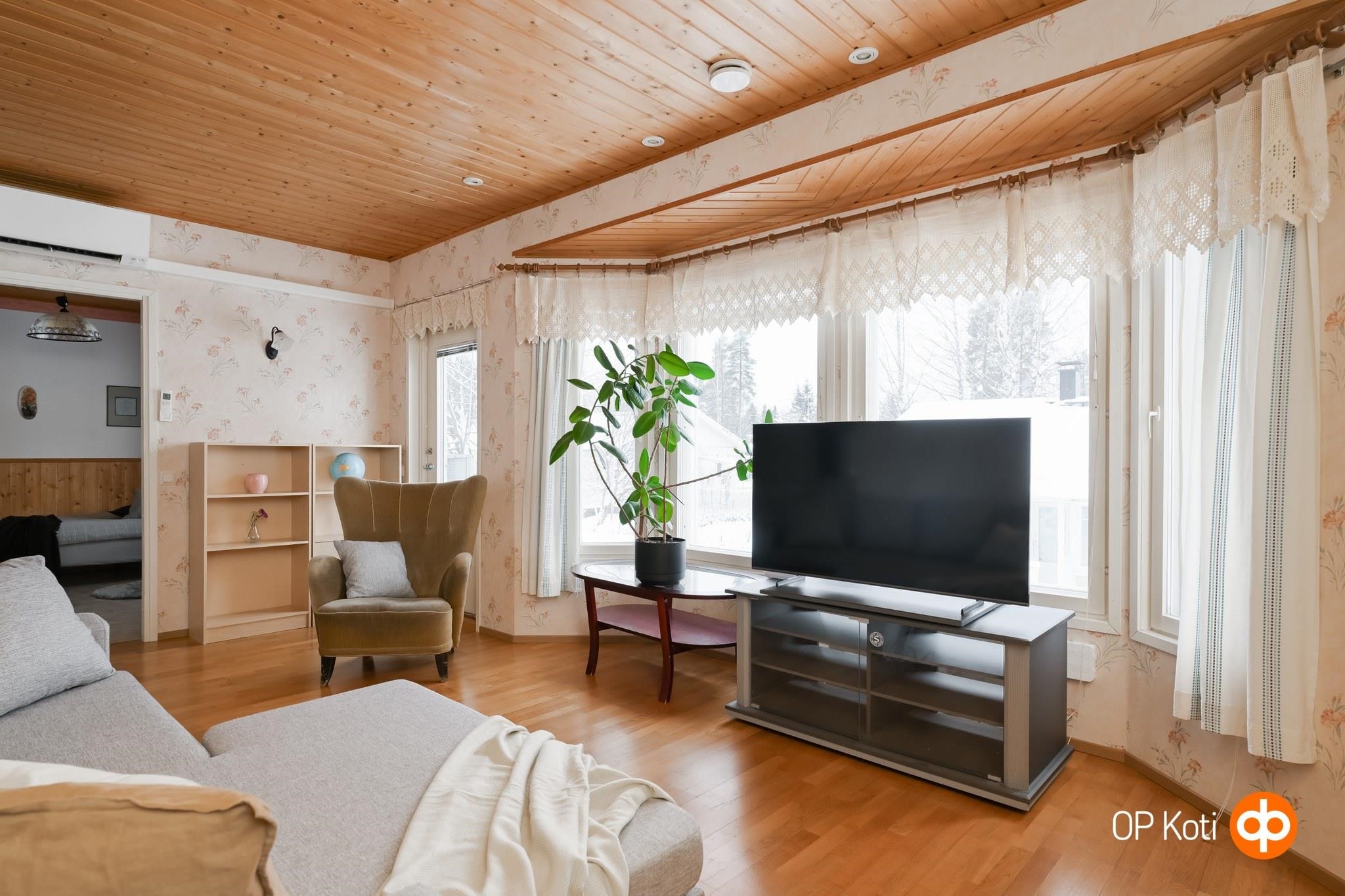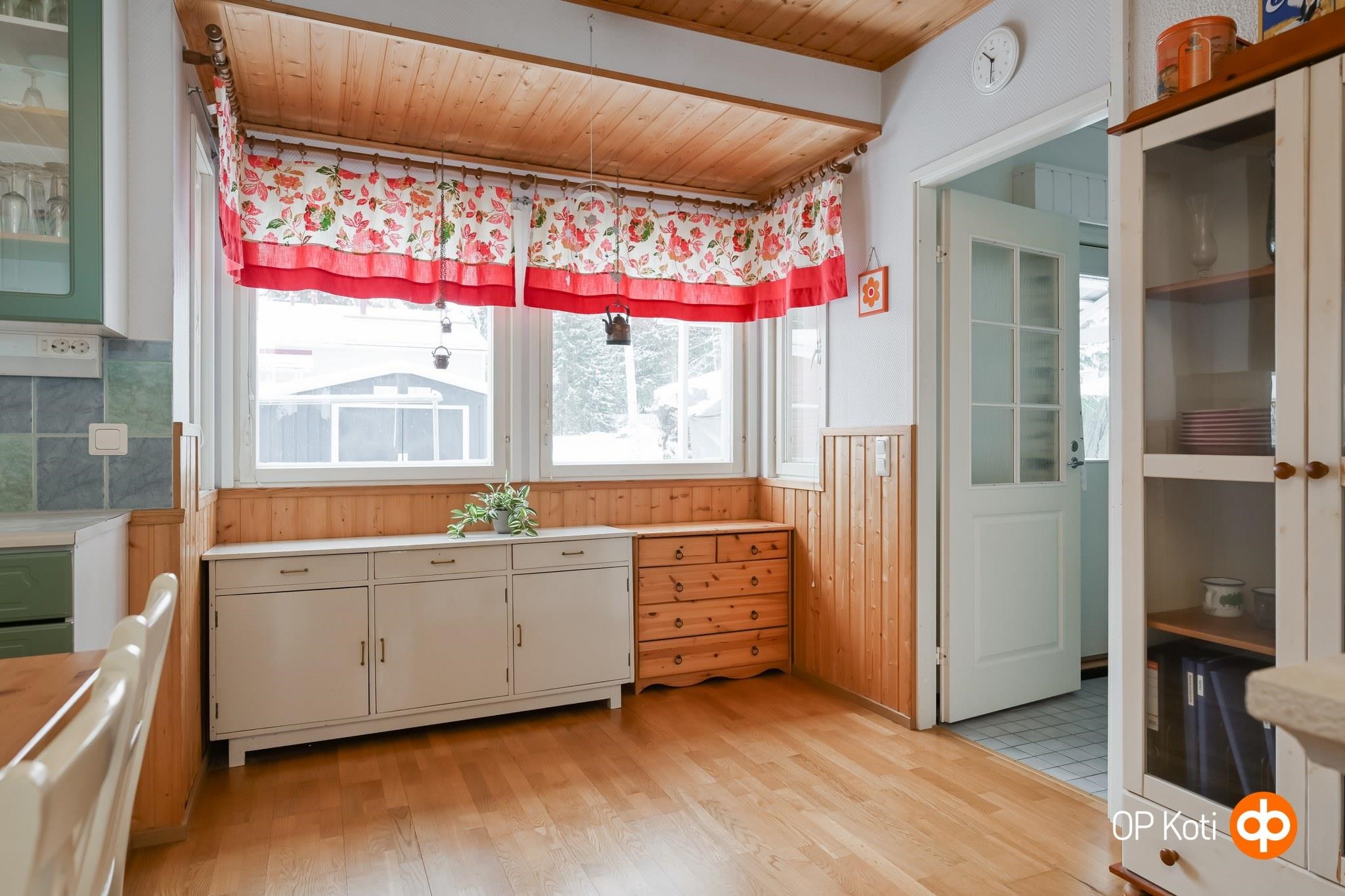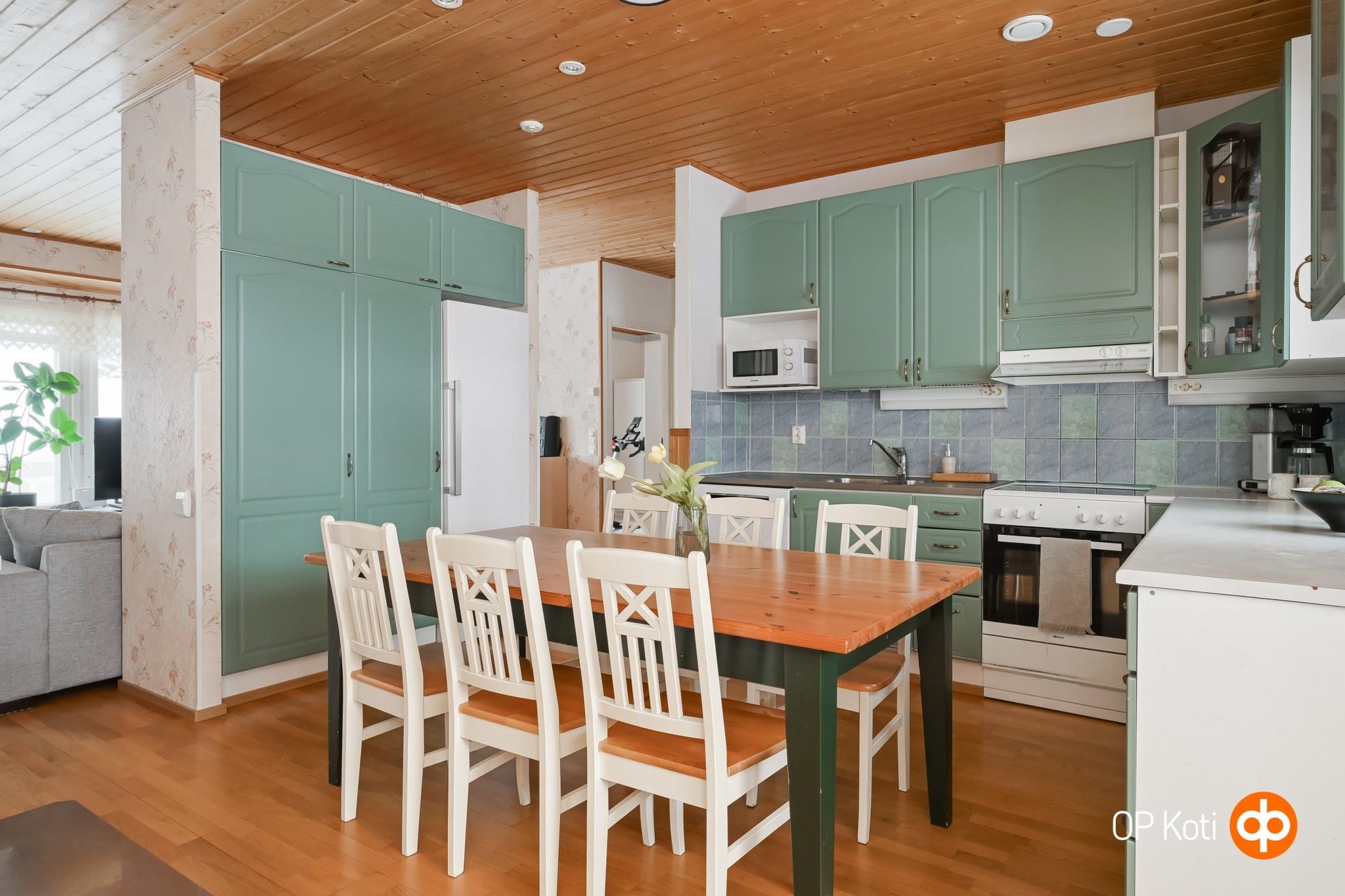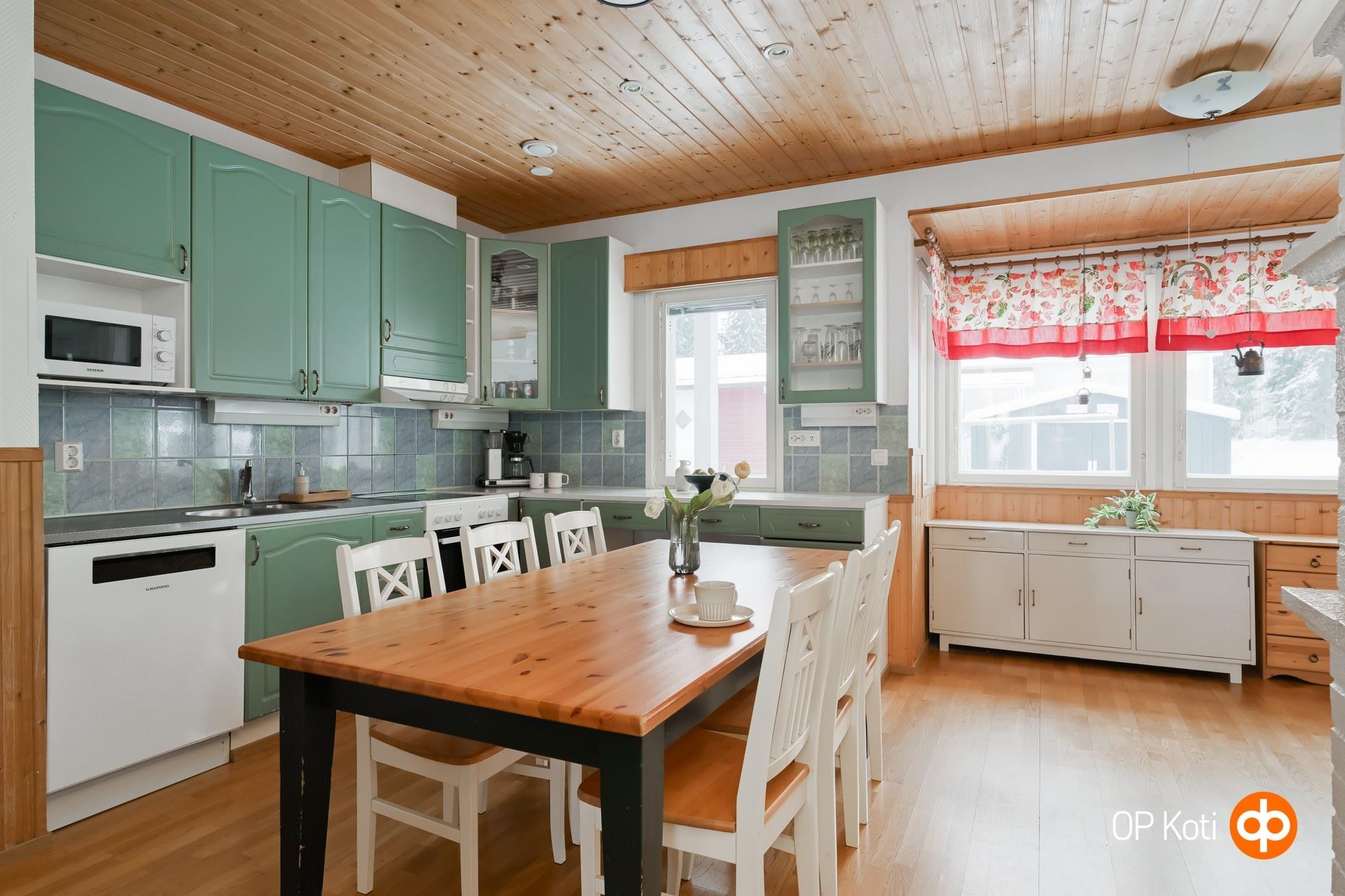 Sanalla sanoen kodikas, sitä tämä koti on. Eteisestä avautuu näkymä olohuonetilaan, johon isot ikkunat tuovat runsaasti luonnonvaloa. Varaava tulisija tuo kotoisaa lämpöä ja avustaakin hyvin lämmityskustannuksissa. Keittiö on poikkeuksellisen tilava ja täälläkin on tulisija. Reilun kokoisia makuuhuoneita on kaikkiaan kolme. Lisäksi löytyy pesutilojen yhteydestä aina tarpeellinen kodinhoitohuone, joka toimii myös pukutilana.