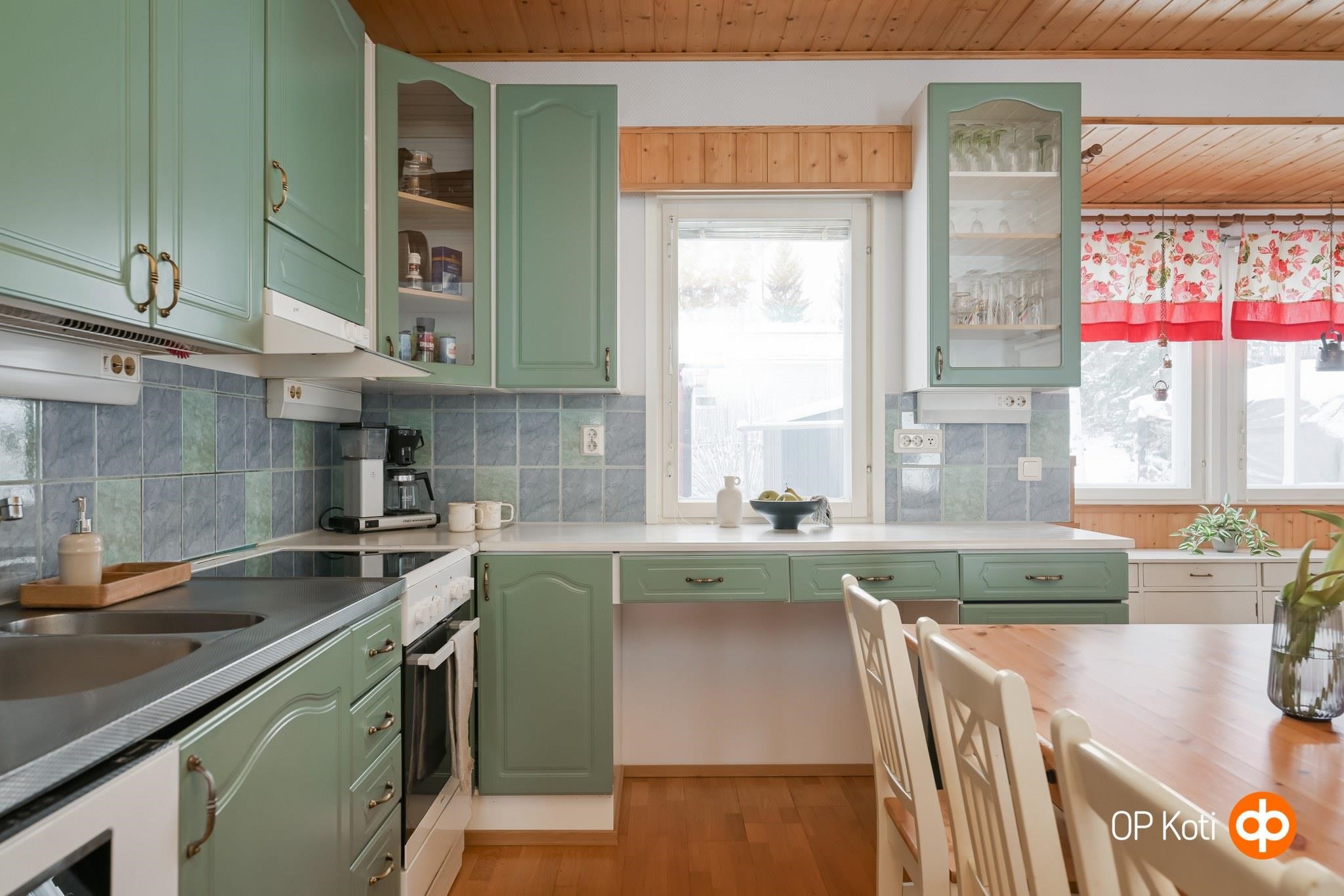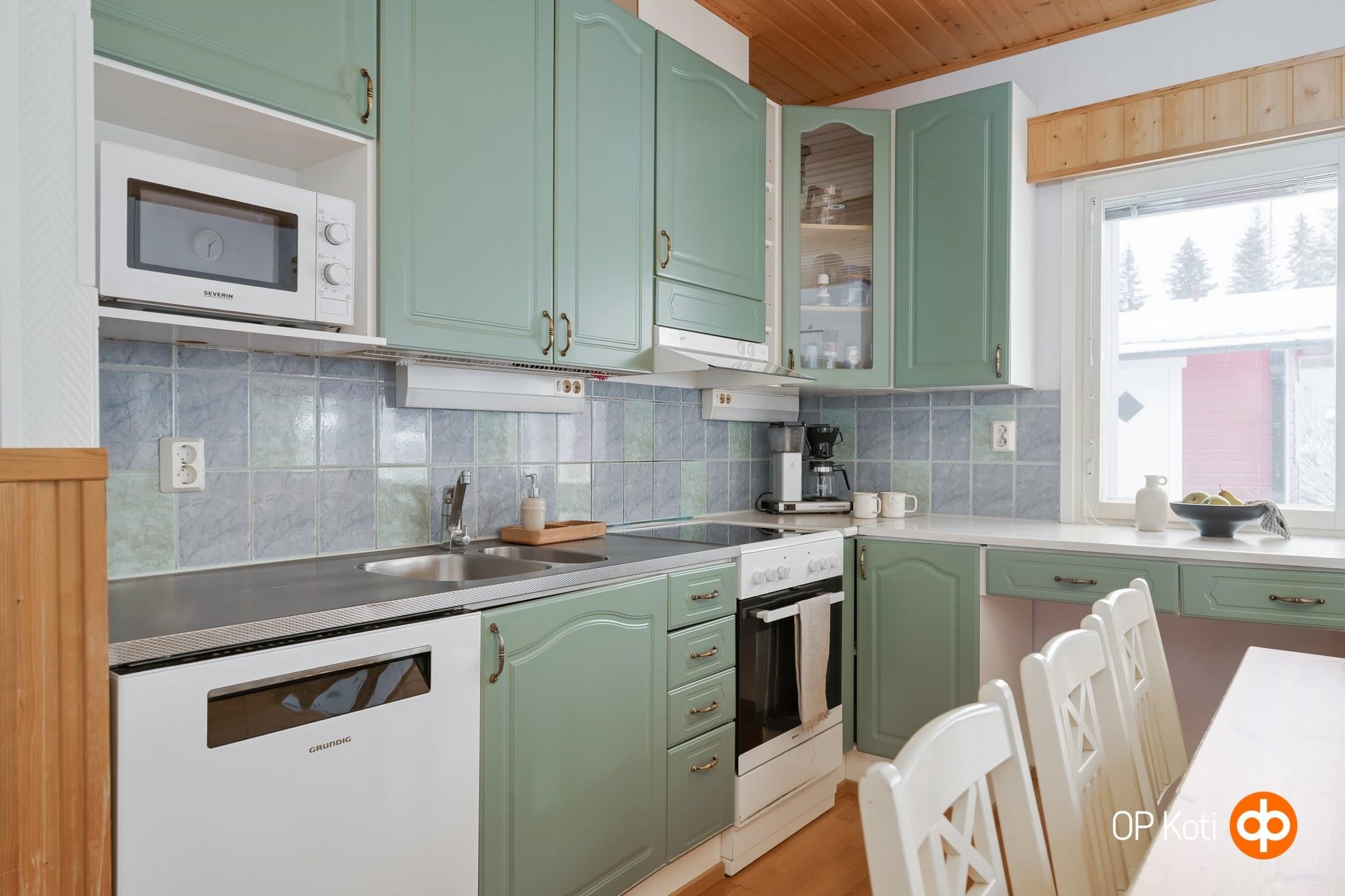 - Jääkaappi, keraaminen liesi, liesituuletin, leivinuuni, astianpesukone, kaapistot, kiinteät valaisimet.
