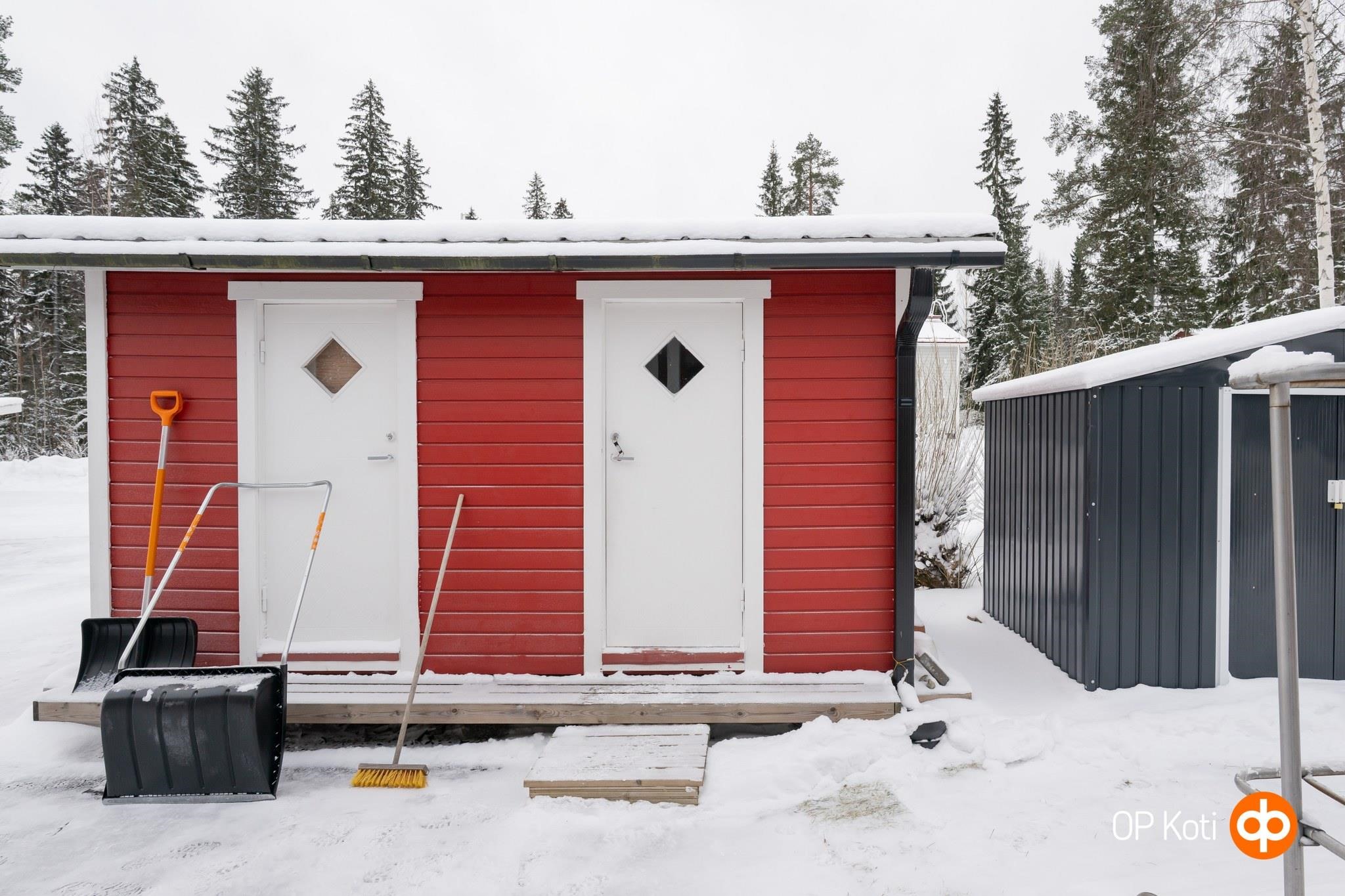 Autolle paikka on sisäänkäynnin vieressä olevassa katoksessa. Tarvittaessa pihaan mahtuu hyvin toinen tai kolmaskin auto. Autokatoksen yhteydessä on lämmin varastotila. Erillisiä varastorakennuksia on kaksi, toinen liiterinä ja toinen puutarhavajana.